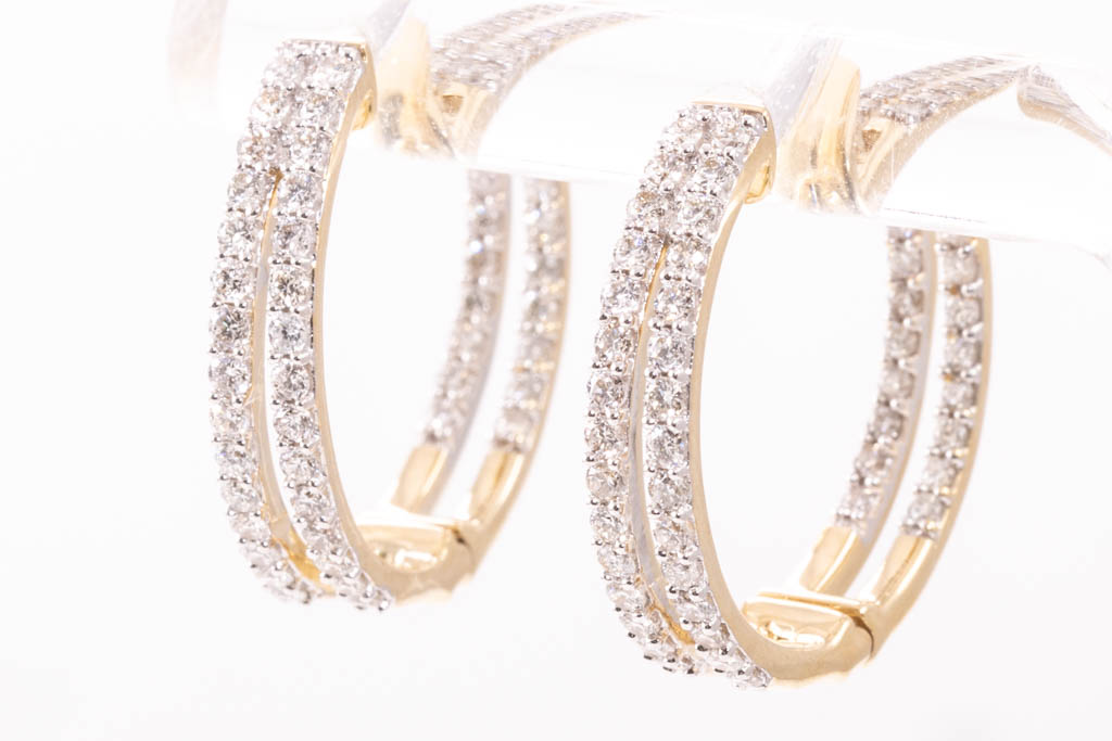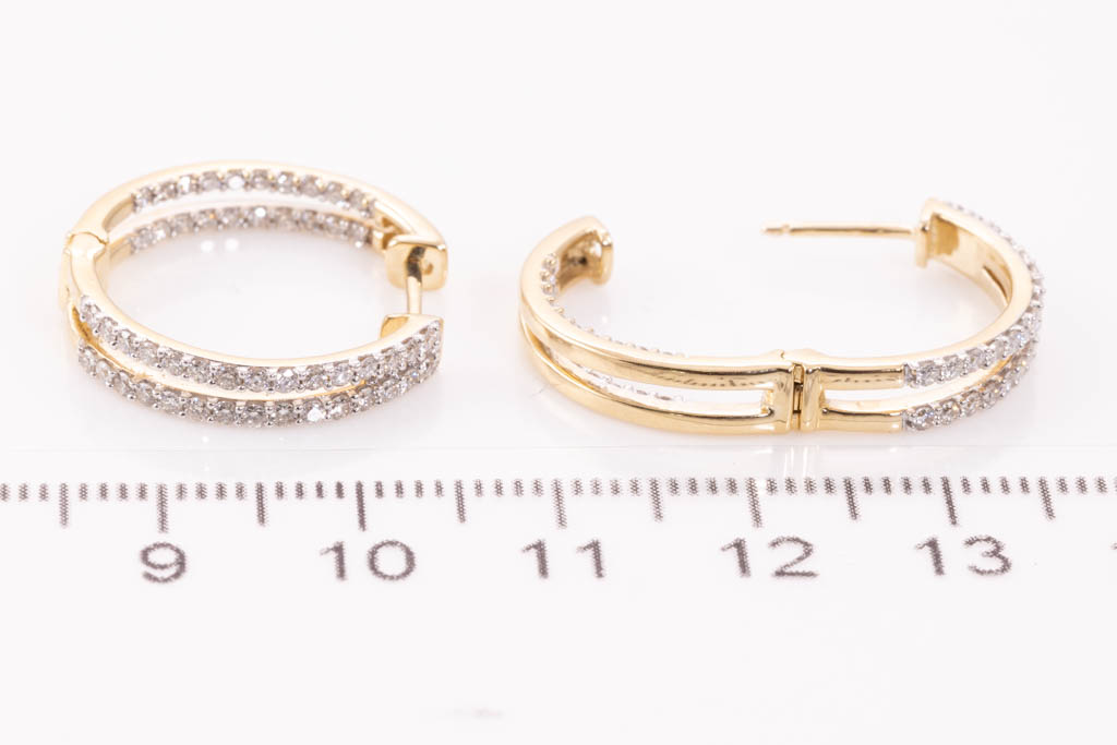 Diamond hoop earrings with round diamonds totalling 0.91cts. (Estimated grading: H-I SI). Back of the hoop has the diamonds set inside the hoop. 14ct yellow gold. Weight: 5.8g. (New)