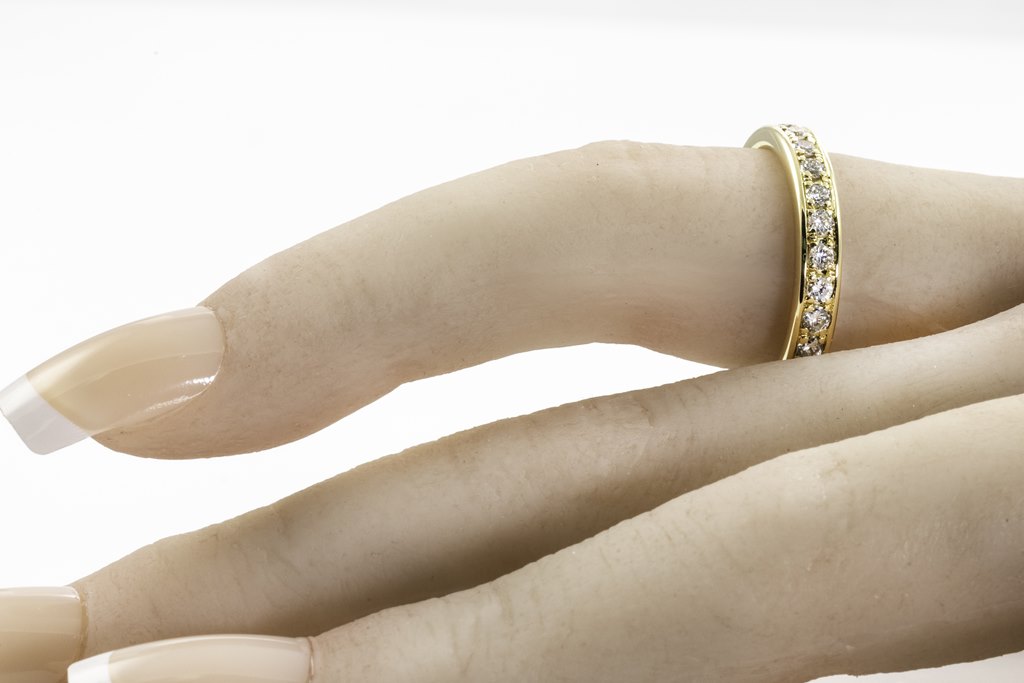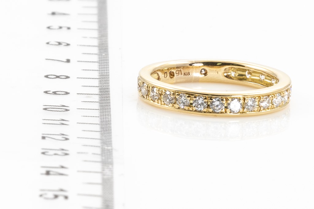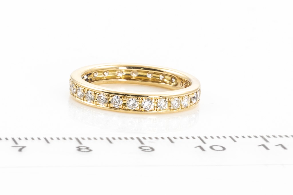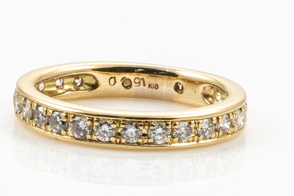 Diamond full hoop eternity ring with round Diamonds totalling 0.91cts (Estimated grading: H-I VS-SI). 18ct yellow gold. Ring size P - ring resizing is not recommended. Weight: 4.5g. (Pre-owned)