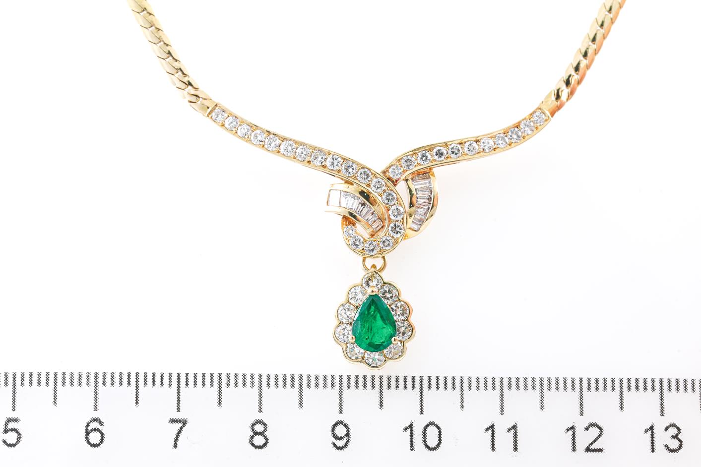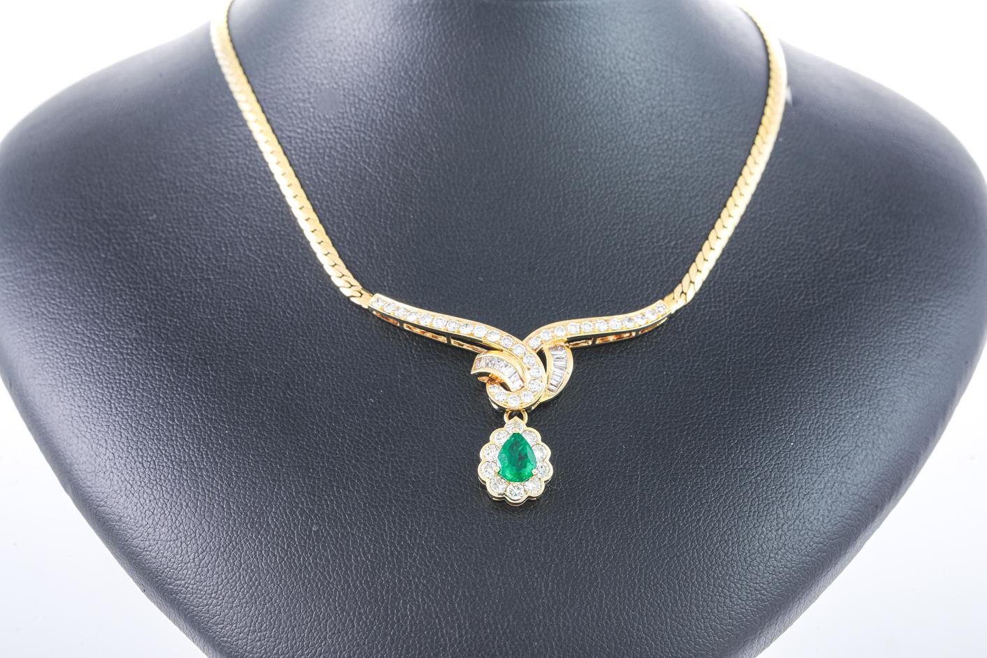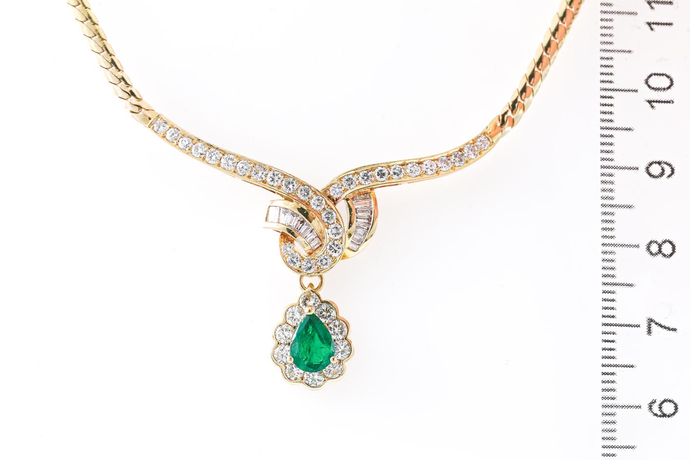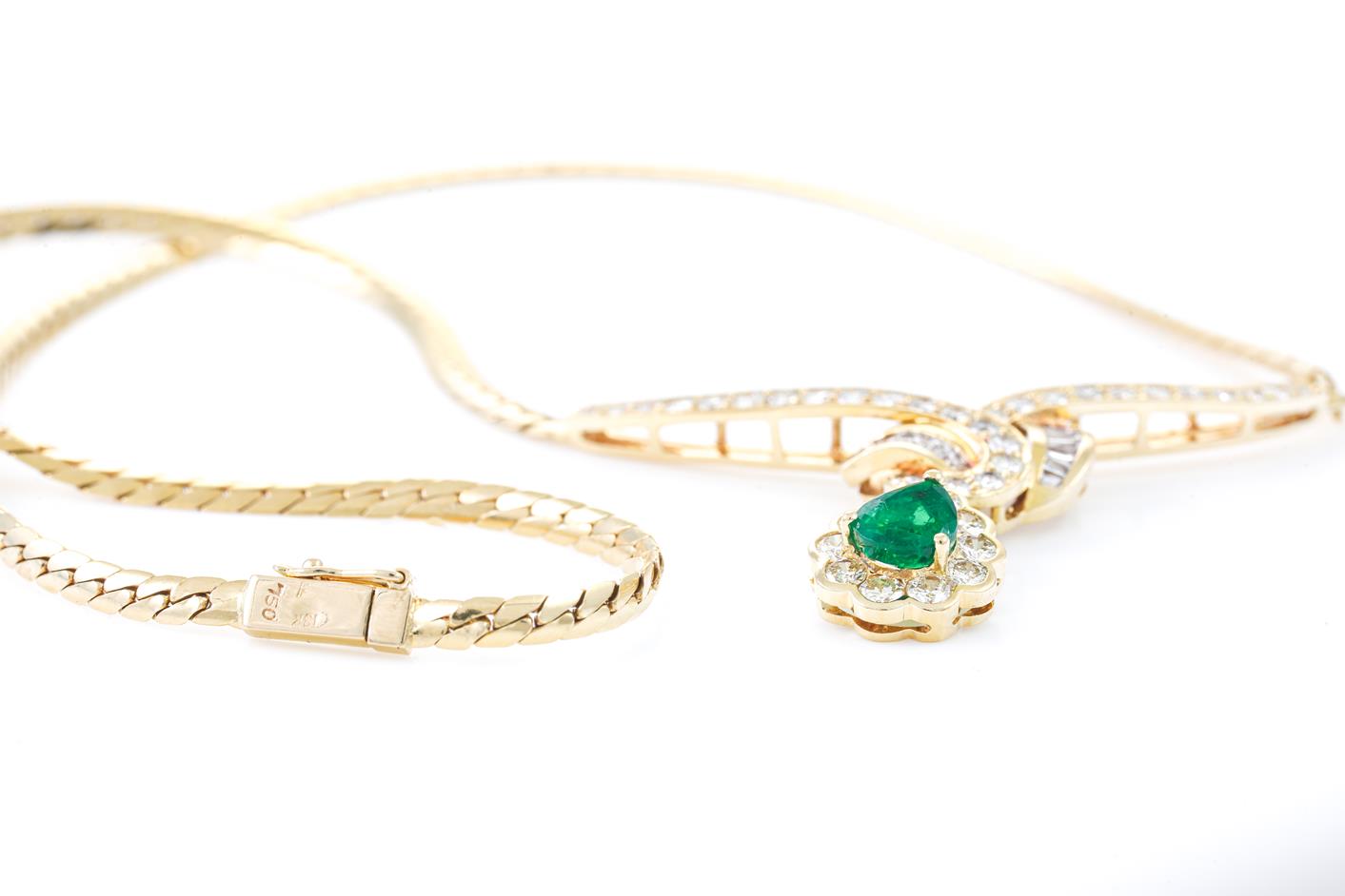 Emerald and Diamond necklace with a pear shape Emerald of 0.91ct and round & baguette cut Diamonds totalling 1.60cts (Estimated grading: H-I SI). Note emerald pendant can be detached. 18ct yellow gold. Length: 40cm. Weight: 13.8g. (Pre-owned)