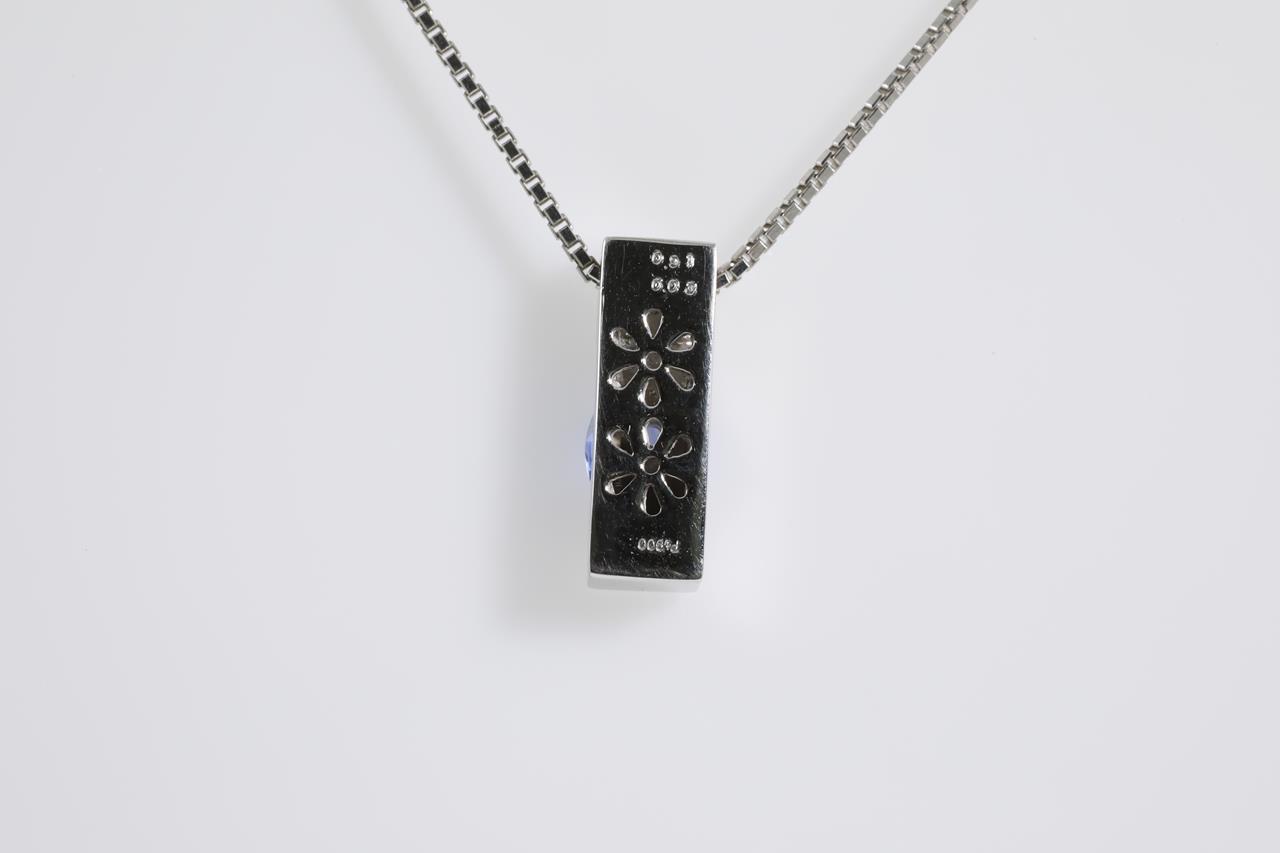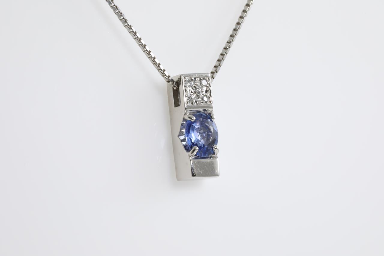 Sapphire and Diamond pendant with oval shape Sapphire of 0.91ct and Diamonds totalling 0.03cts. Platinum with 45cm adjustable platinum chain. Weight: 8.2g (Pre-owned)