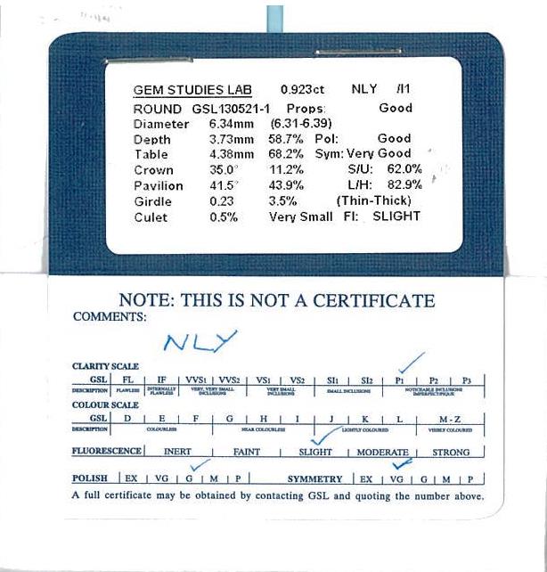 A loose round Diamond of 0.92ct (with GSL memo graded as Natural Light Yellow P1 #GSL130521-1). (New)