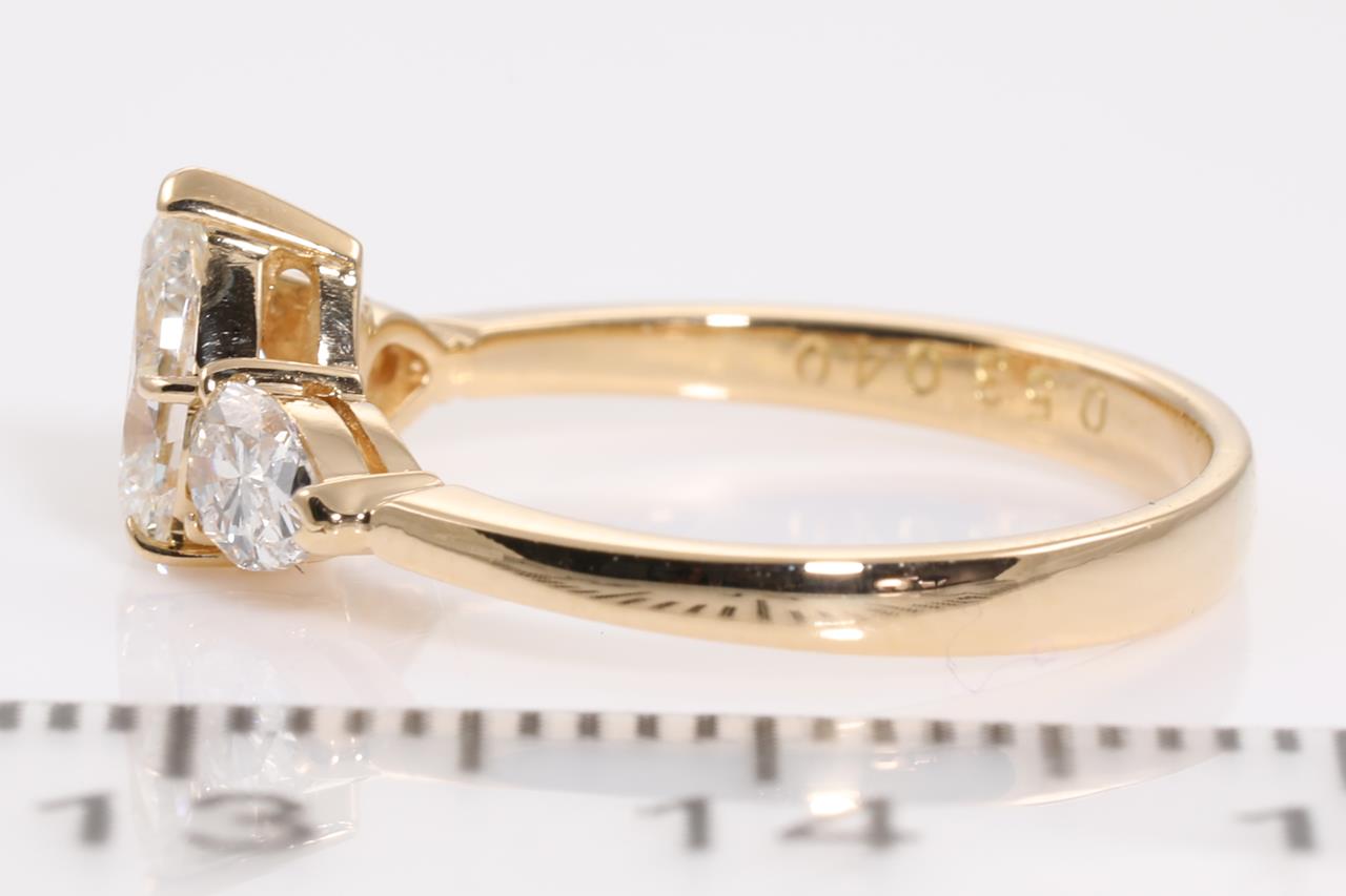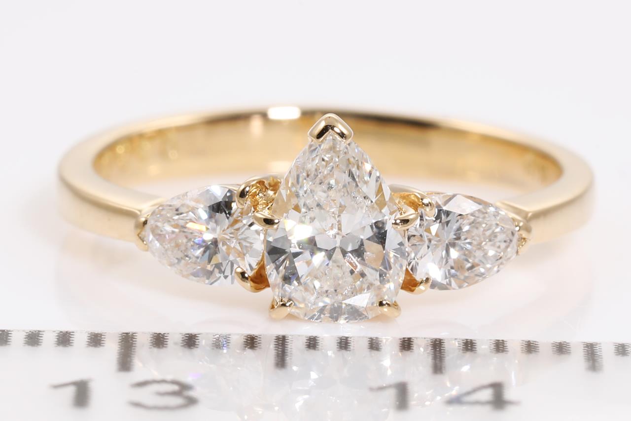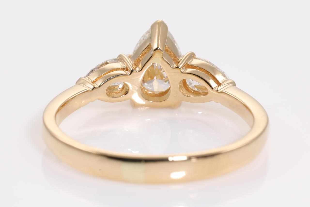 Diamond dress ring with 3 pear shape Diamonds totalling 0.93cts (Estimated grading: H SI-P1). 18ct yellow gold. Ring size: H. Weight: 2.3g. (Pre-owned)