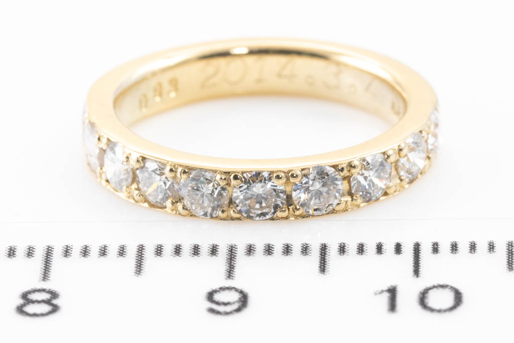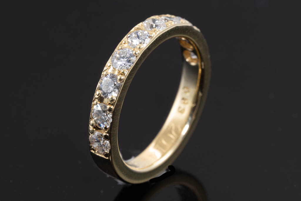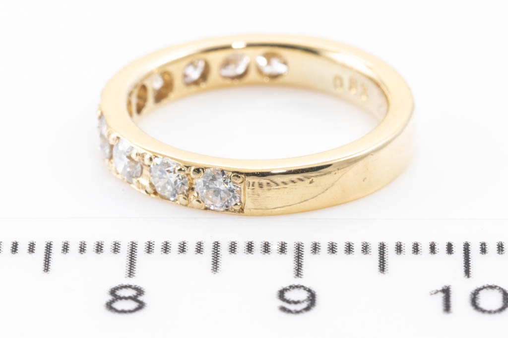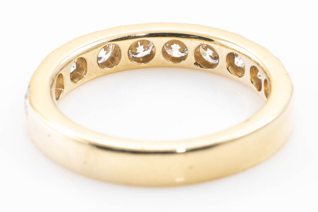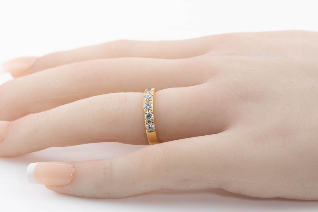 Diamond half hoop eternity ring with round Diamonds totalling 0.93cts (Estimated grading: H SI-P1). 18ct yellow gold. Ring size J. Weight: 4.1g. (Pre-owned)