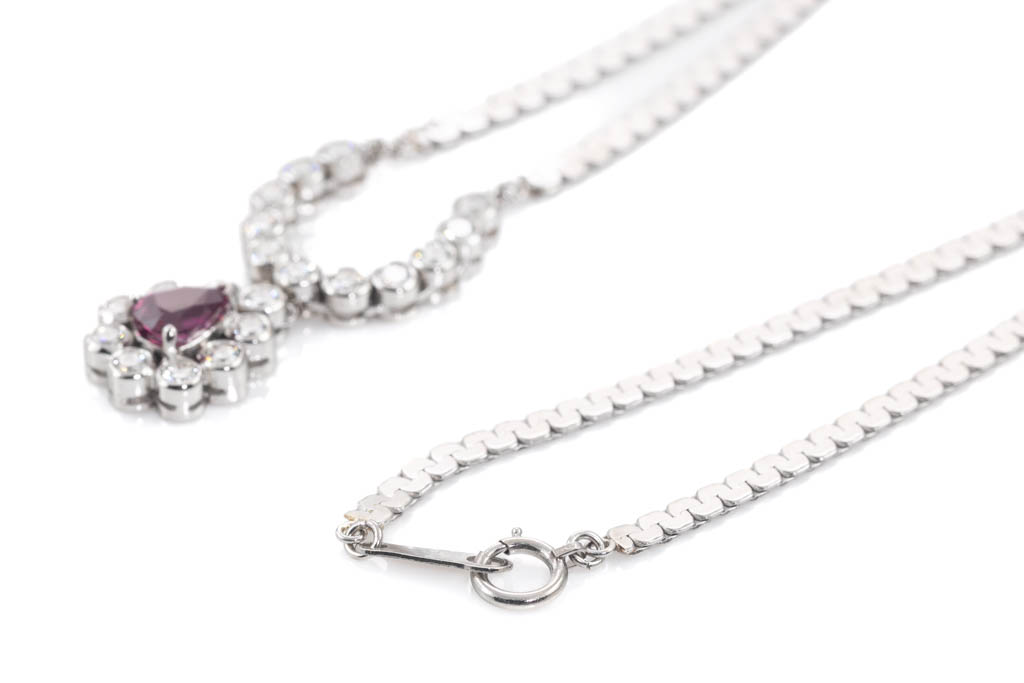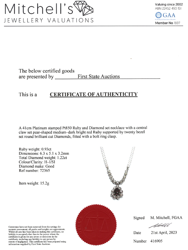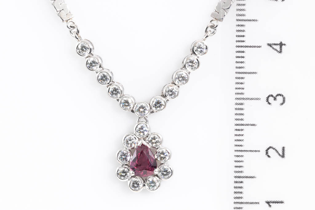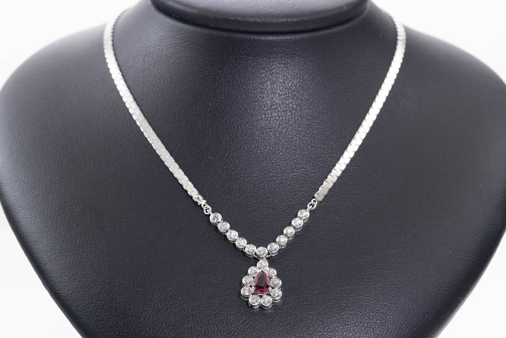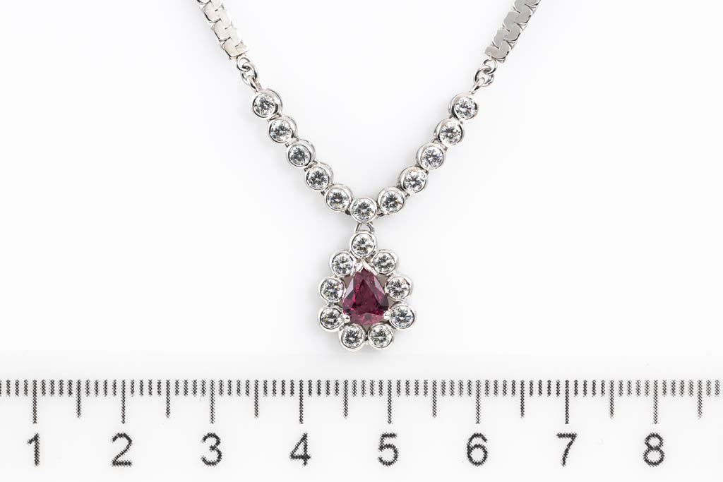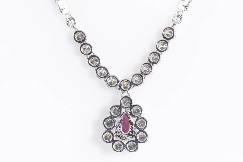 Ruby and Diamond necklace with pear shape Ruby of 0.93ct and round Diamonds totalling 1.22cts (Estimated grading: H-I SI). Platinum - 850. Length: 41cm. Weight: 15.2g. With Certificate #416905. (Pre-owned)