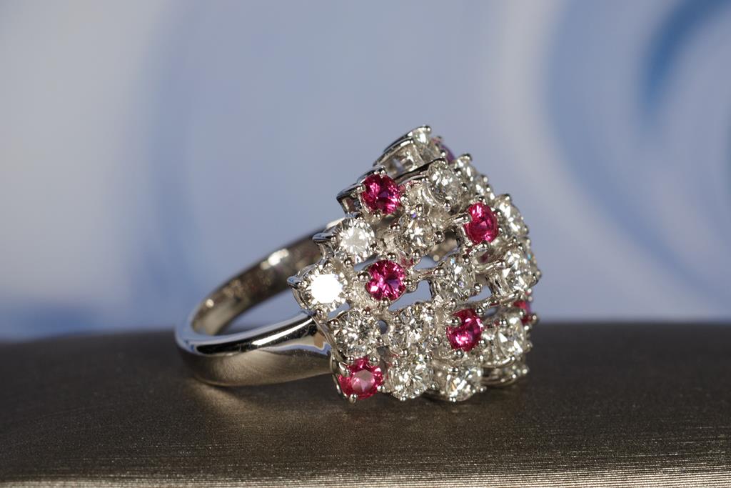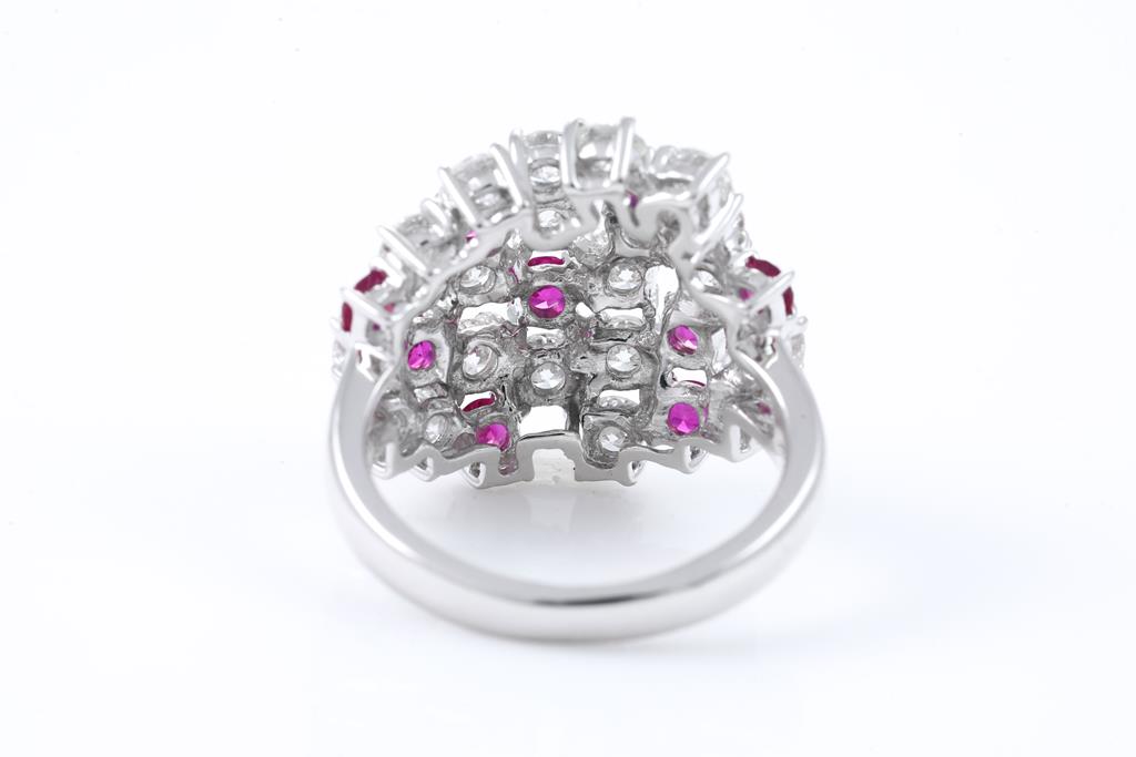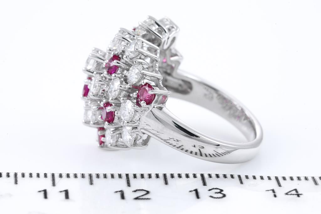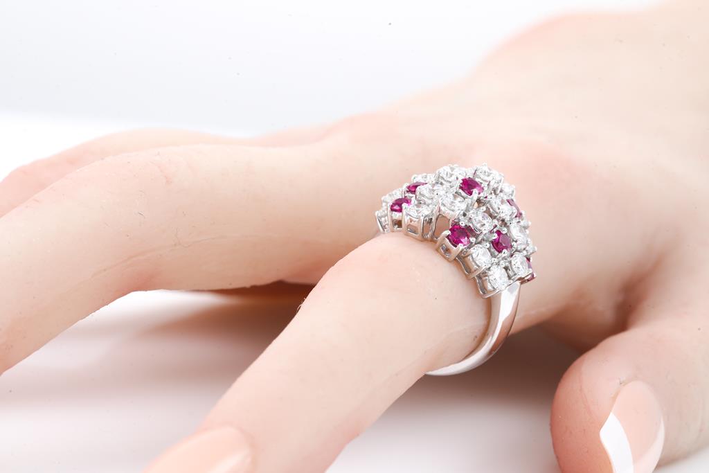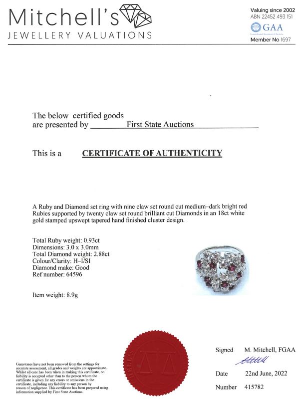 Ruby and Diamond ring with round Rubies totalling 0.93cts and round Diamonds totalling 2.88cts (Estimated grading: H-I SI). 18ct white gold. Ring size L1/2 - ring resizing is not recommended. Weight: 8.9g. With Certificate #415782. (Pre-owned)