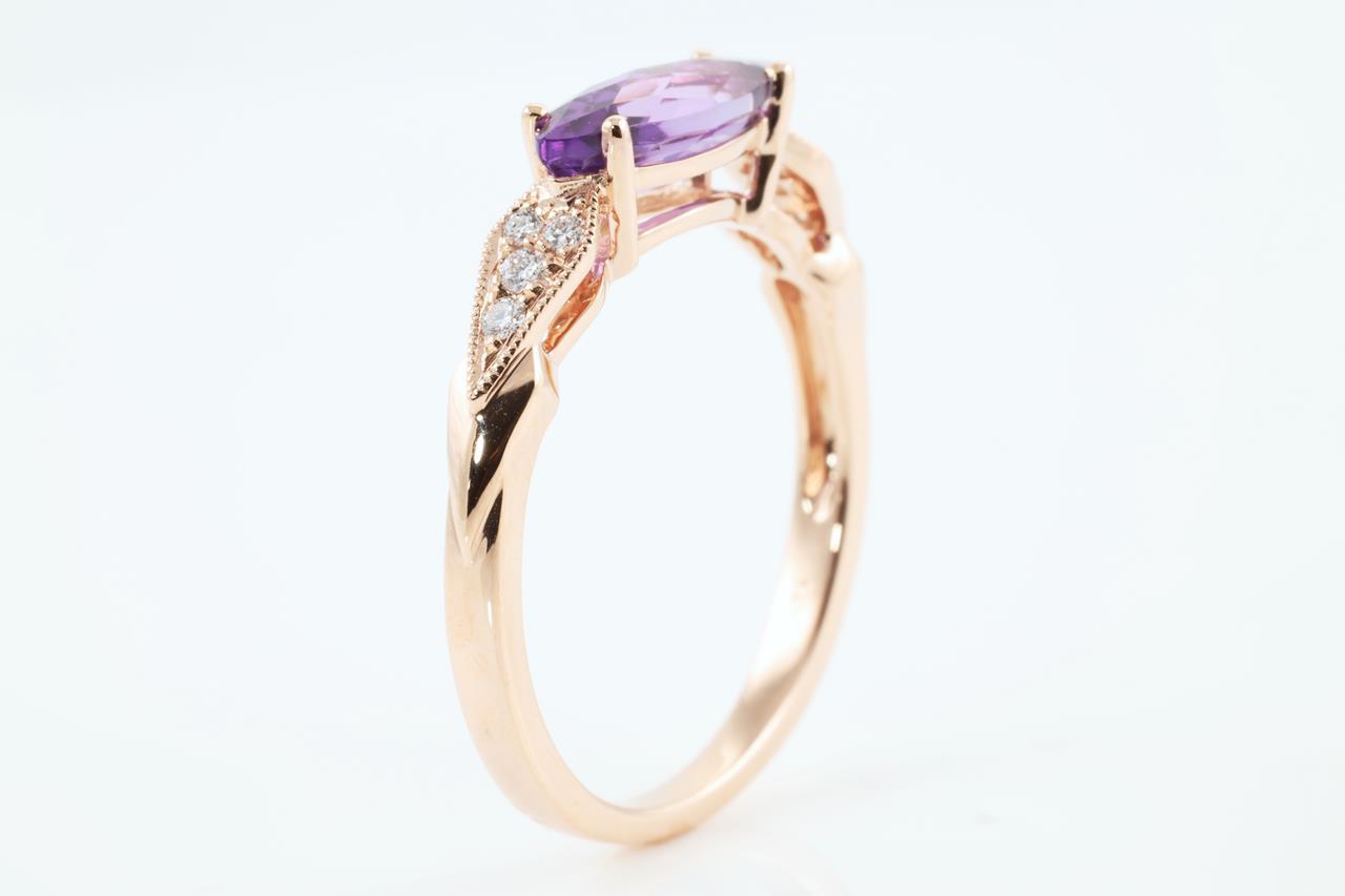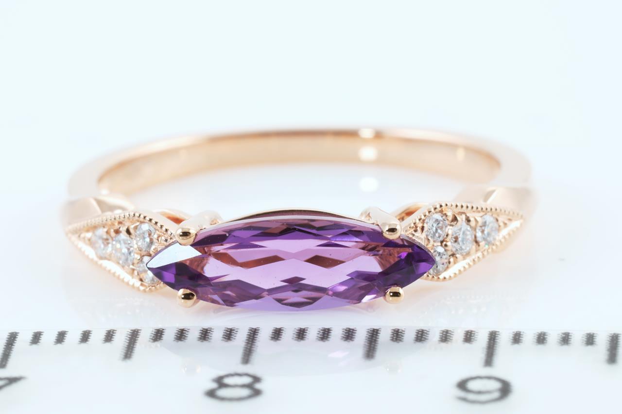 Amethyst and Diamond ring with marquise shape checkerboard cut Amethyst of 0.94ct and Diamonds totalling 0.08cts. 14ct Rose gold. Ring size N1/2. Weight: 2.5g (New)