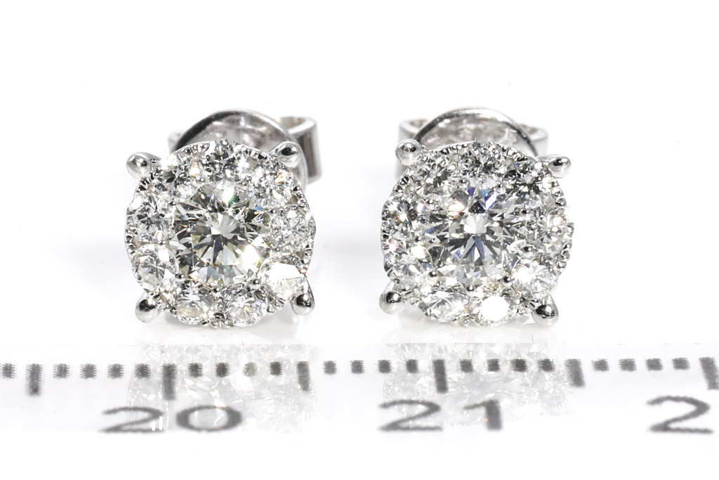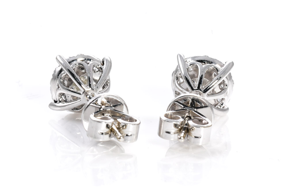 Diamond halo stud earrings with round cut Diamonds totalling approximately 0.94cts (Estimated grading H-J SI). 18ct white gold. Weight 2.7g. (Pre-owned)