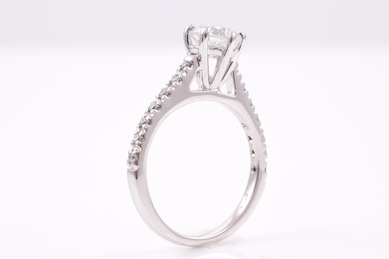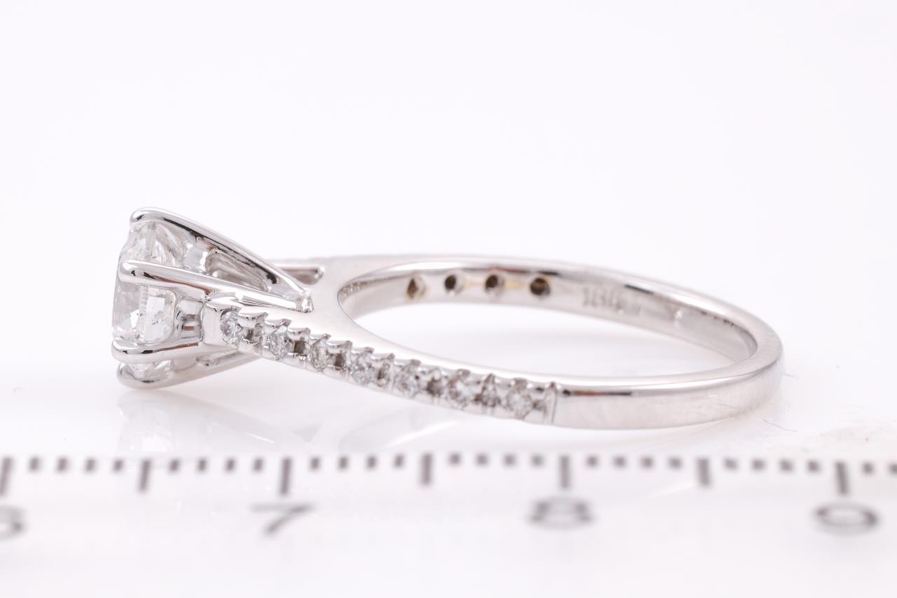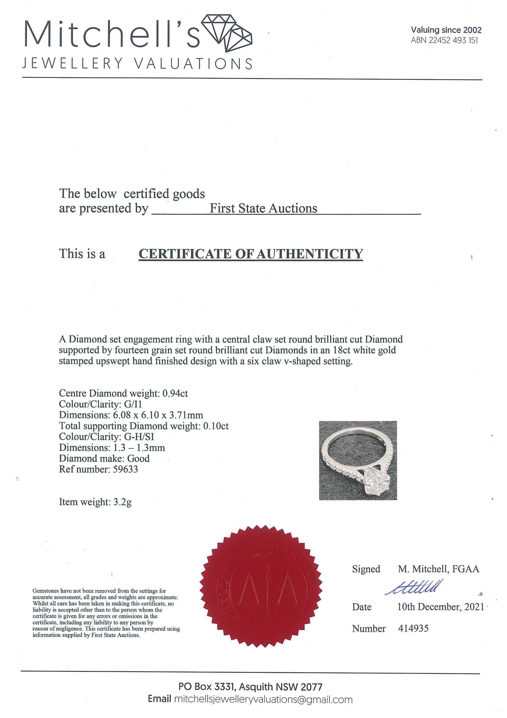 Diamond ring with a centre round brilliant cut Diamond of 0.94ct (Estimated grading: G P1) and shoulder Diamonds totalling approximately 0.10cts (Estimated grading: G-H SI). 18ct white gold. Ring size I1/2 - can be resized up by a maximum of 3 sizes, down with ring clip. Weight: 3.2g. With certificate #414935. (Pre-owned)