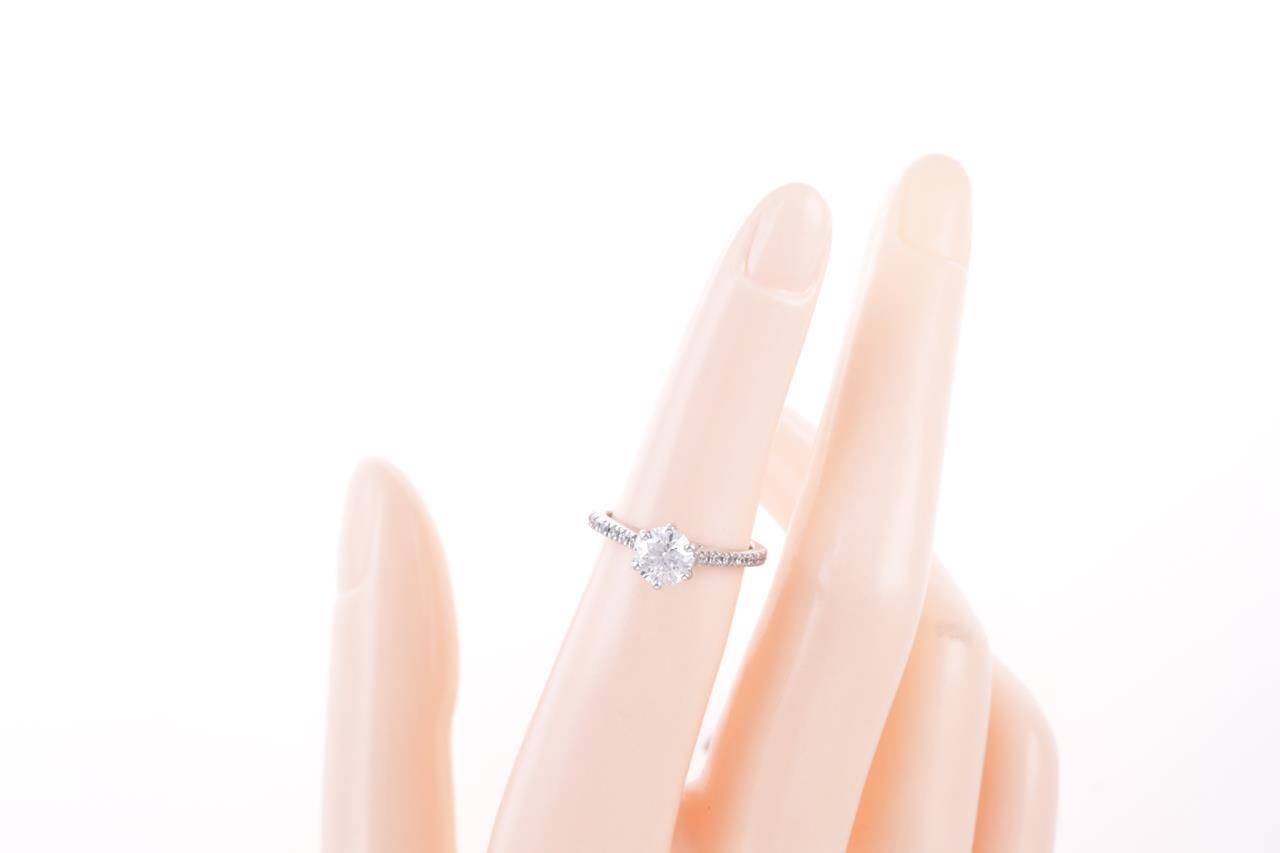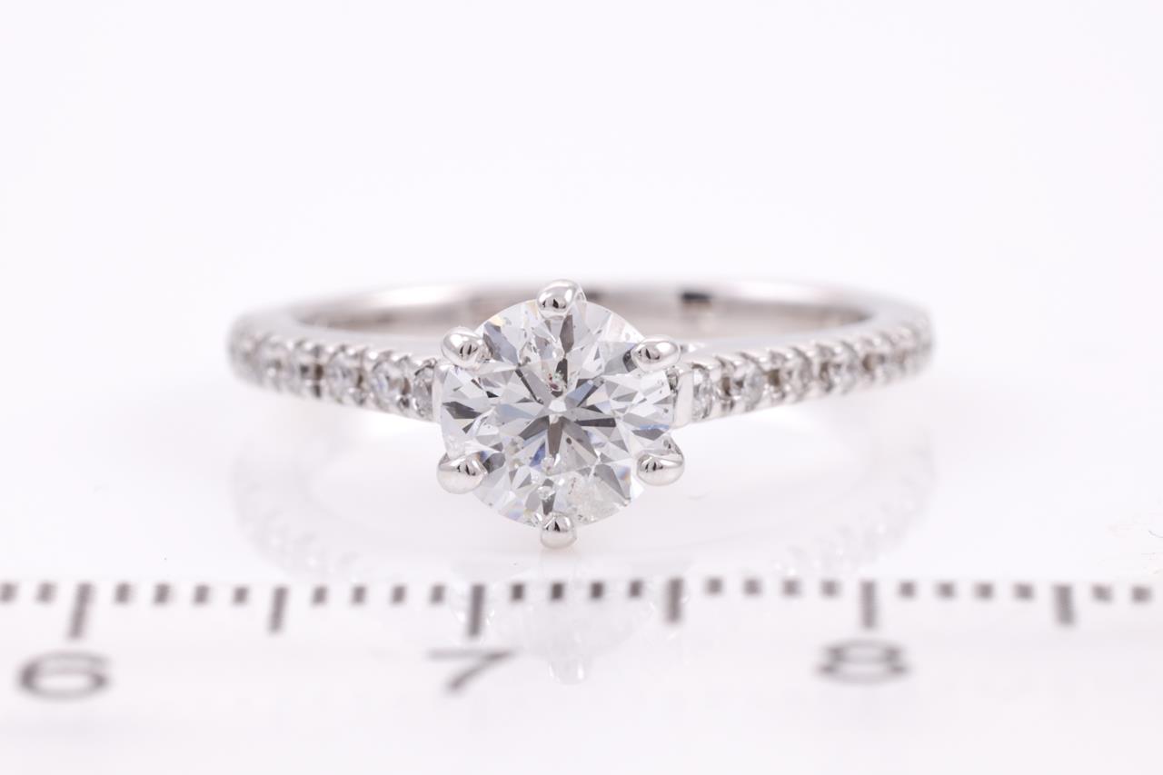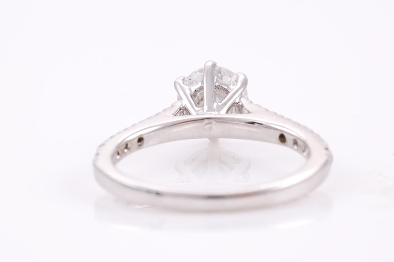 Diamond ring with a centre round brilliant cut Diamond of 0.94ct (Estimated grading: G P1) and shoulder Diamonds totalling approximately 0.10cts (Estimated grading: G-H SI). 18ct white gold. Ring size I1/2 - can be resized up by a maximum of 3 sizes, down with ring clip. Weight: 3.2g. With certificate #414935. (Pre-owned)