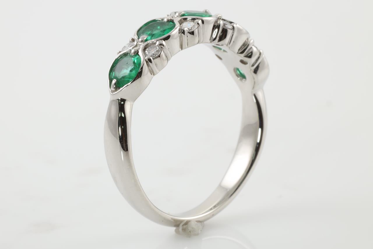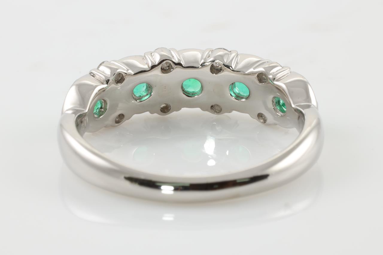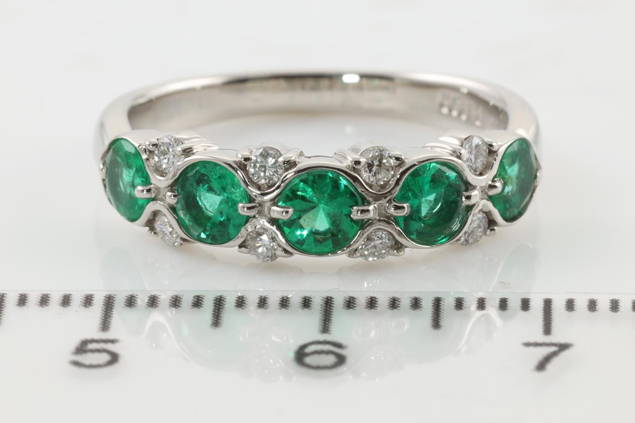 Emerald and Diamond ring with 5 round shape Emeralds totalling 0.94cts and Diamonds totalling 0.18cts. Platinum. Ring size: O - Note this ring cannot be resized up, it can be resized down by ring clip. Weight: 6.5g (Pre-owned)