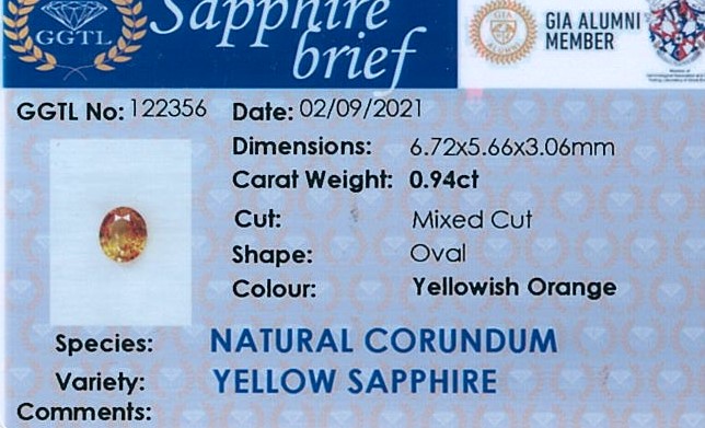 A loose oval shape orange Sapphire of 0.94ct. With GGTL report #122356. (As New)