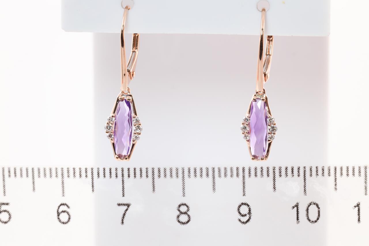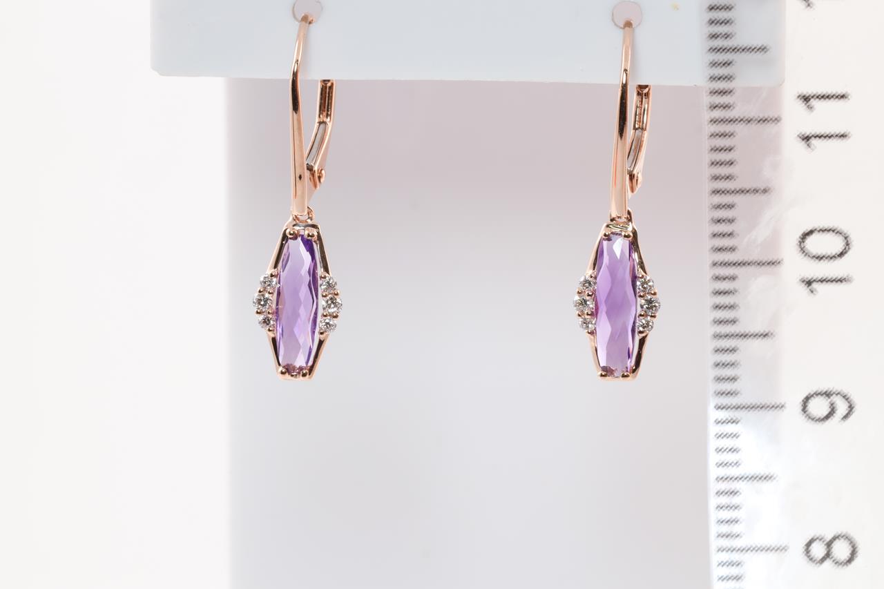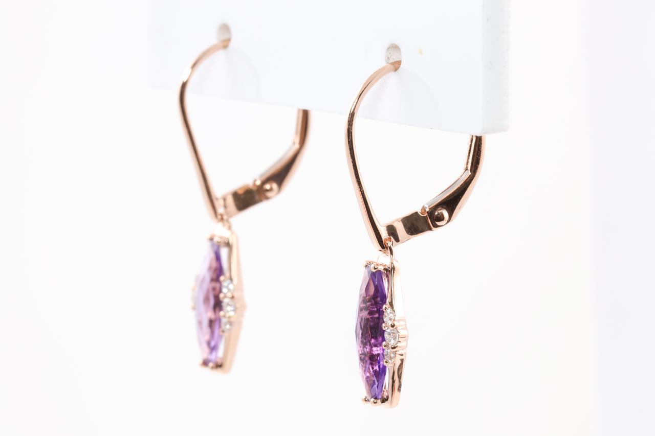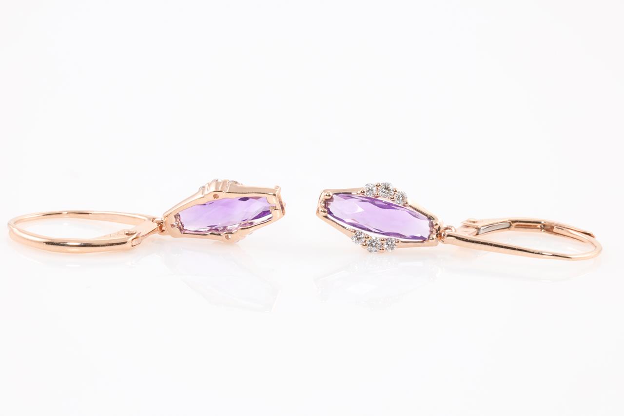Amethyst and Diamond lever back earrings with fancy shape checkerboard cut Amethysts totalling 0.95cts and round Diamonds totalling 0.11cts. 14ct Rose gold. Weight: 1.2g (New)