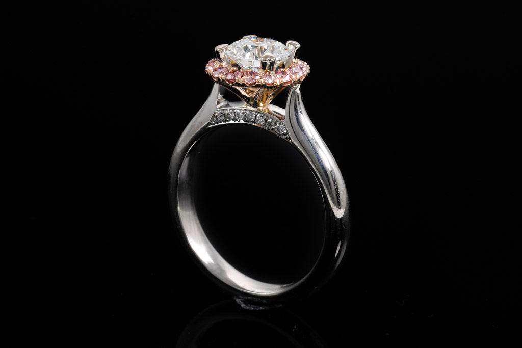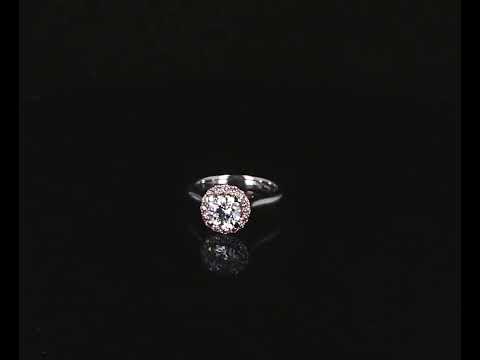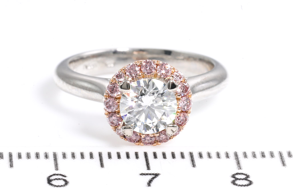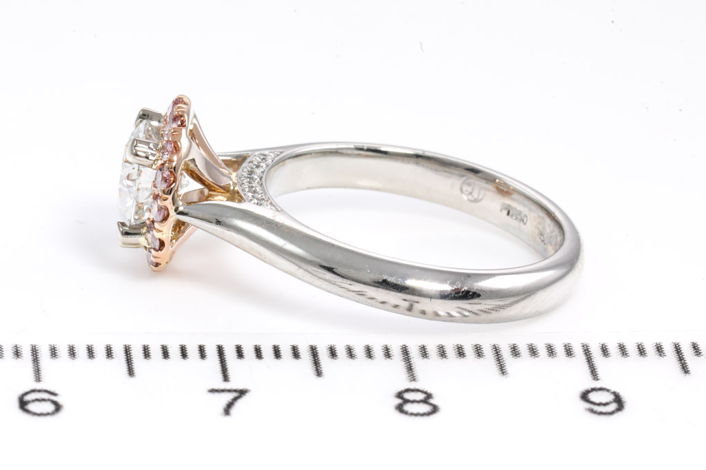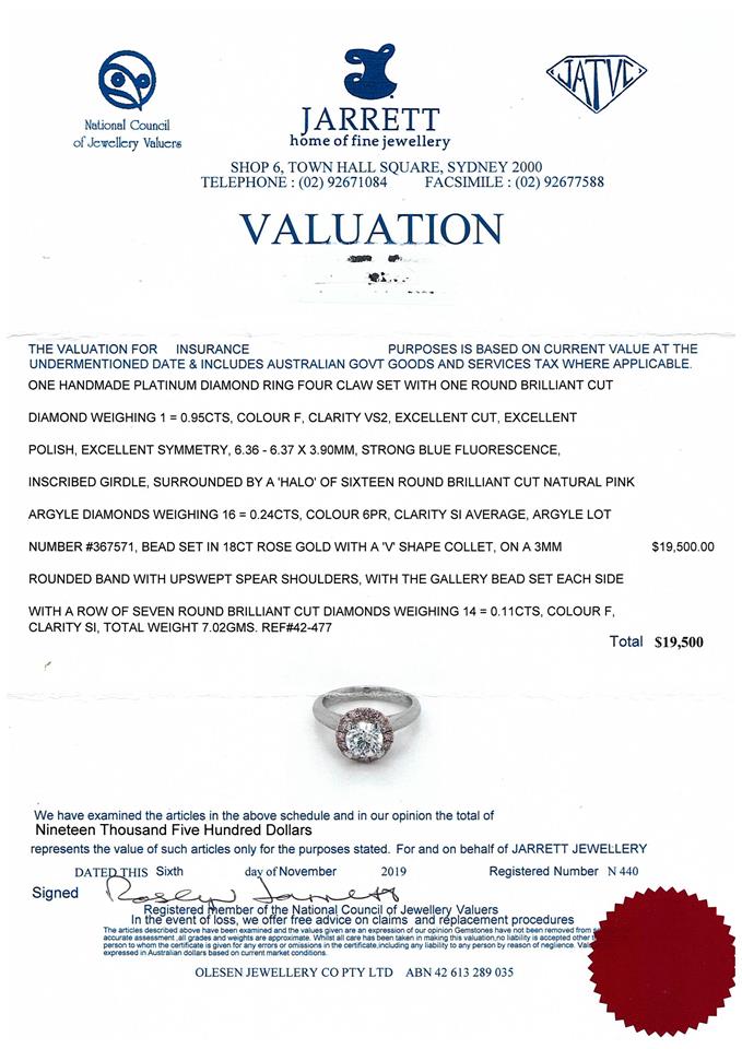 Diamond halo ring with centre round brilliant cut Diamond of 0.95ct (with GIA summary report graded as F VS2 #2136315495) and surrounded by a halo of 16 round Natural Pink Argyle Diamonds totalling 0.24cts (Argyle lot# 367571) and 14 diamonds set under the gallery (7 on each side) totalling 0.11cts. Platinum. Ring size L. With Valuation Certificate dated 06/11/2019. Weight: 7.1g (Pre-owned)