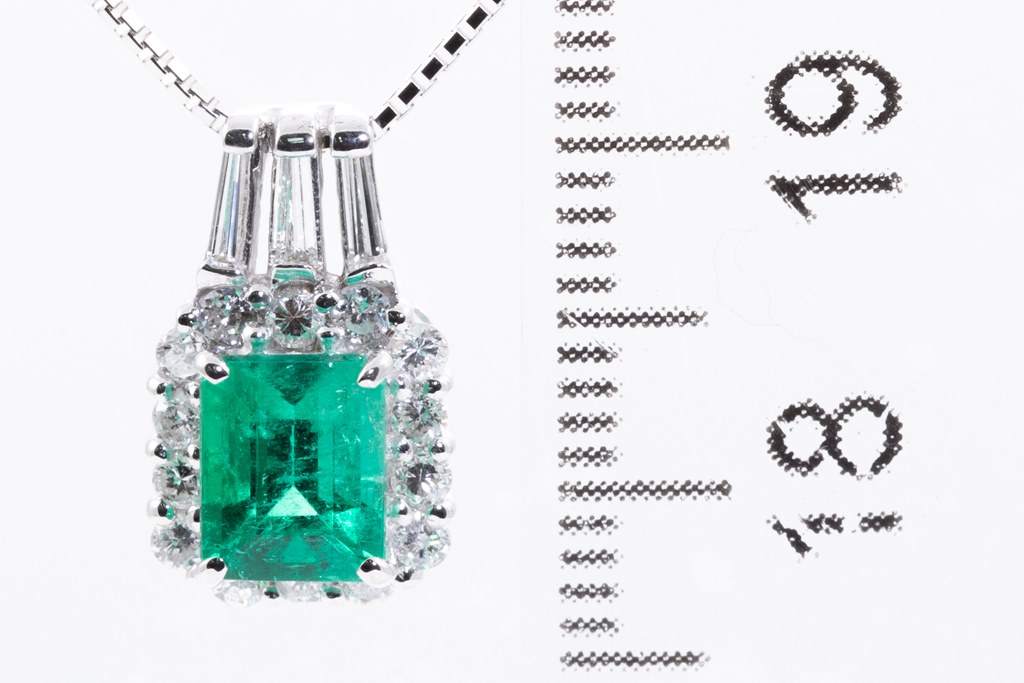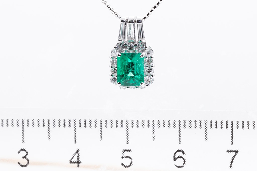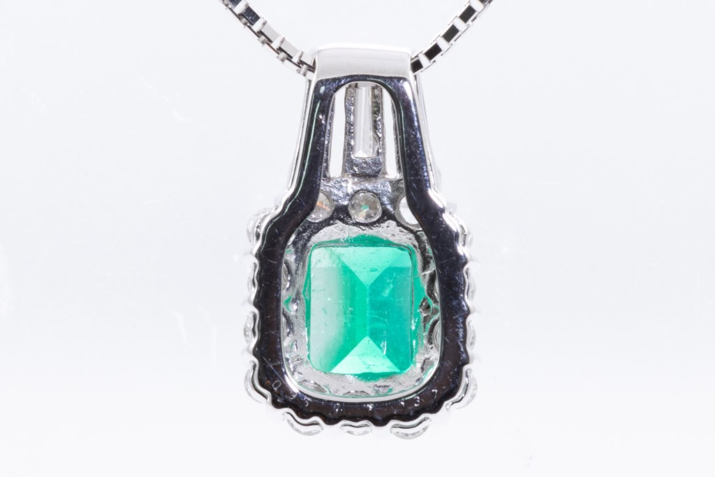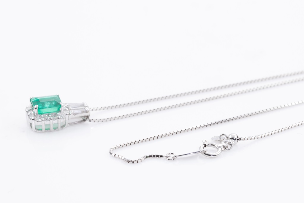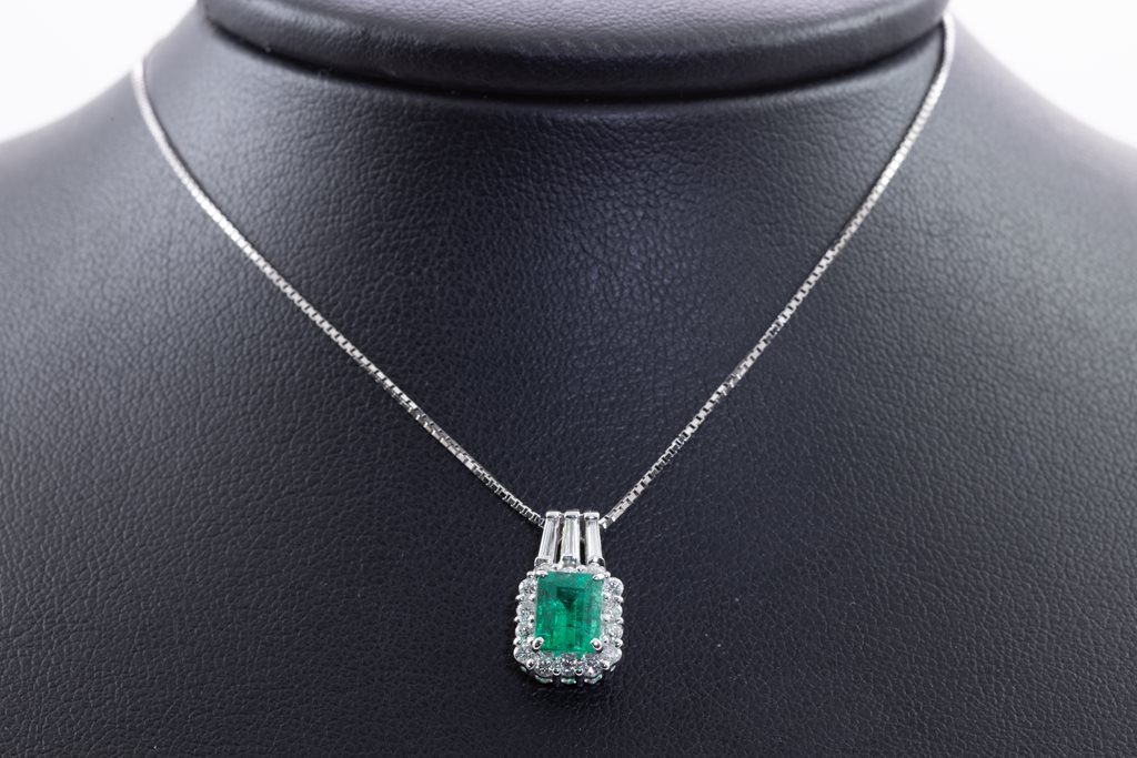 Emerald and Diamond pendant with emerald cut Emerald of 0.95cts and round & baguette cut Diamonds totalling 0.37cts (Estimated grading: H SI). 18ct white gold with 18ct white gold 44cm adjustable chain. Weight 3.6g. (Pre-owned)