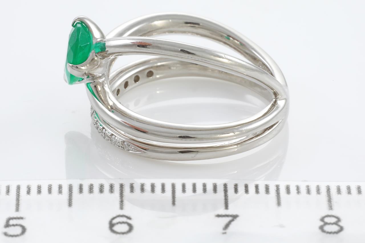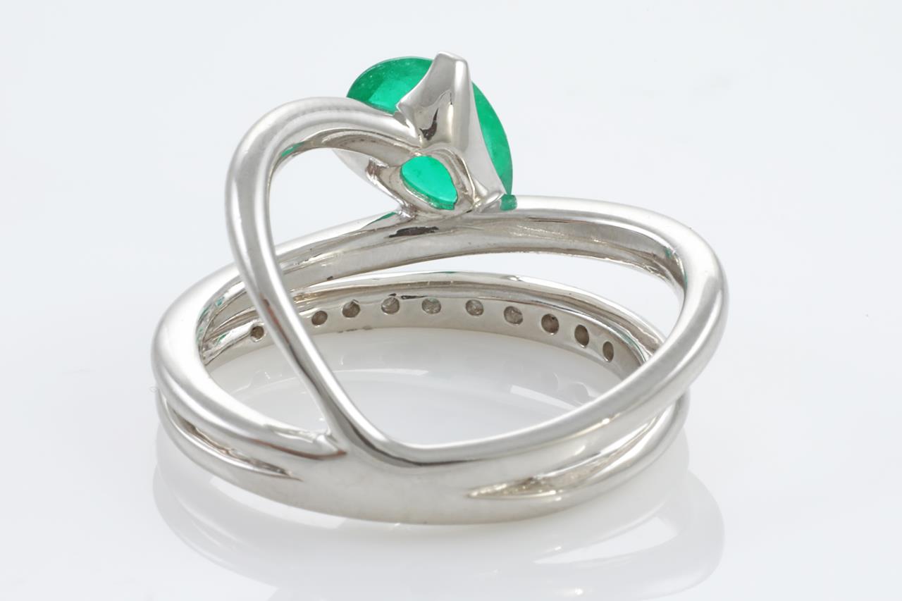 Emerald and Diamond ring with pear shape Emerald of 0.95ct and Diamonds totalling 0.08cts. Platinum. Ring size L - Ring resizing is not recommended. Weight: 9.2g (Pre-owned)