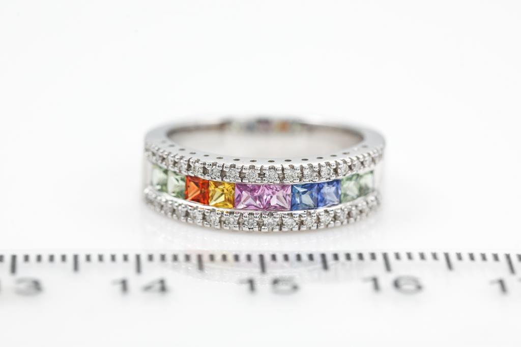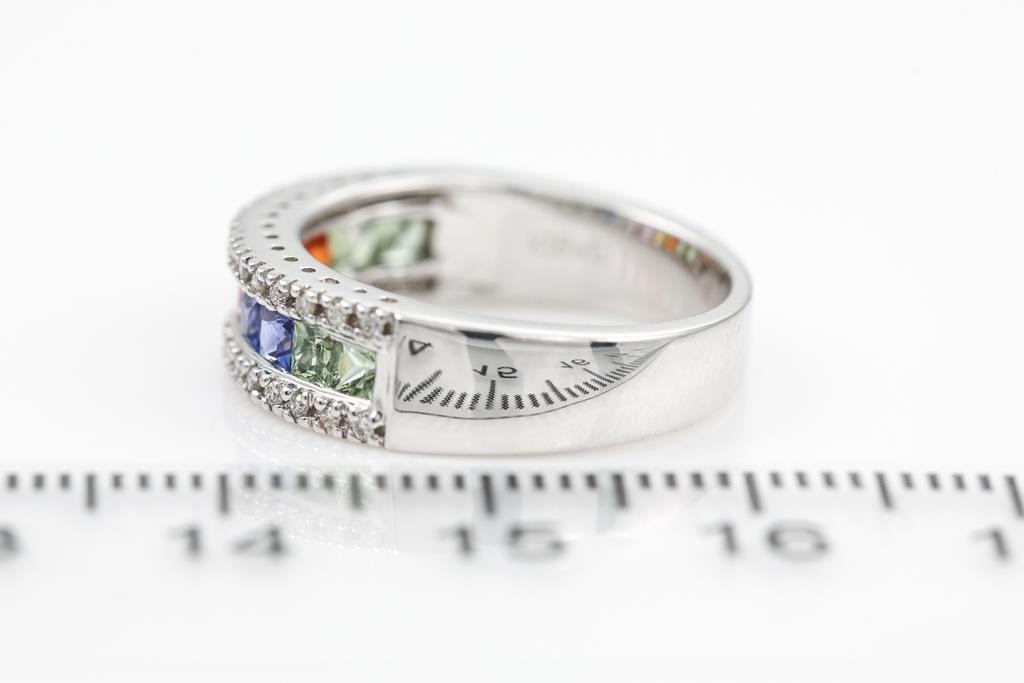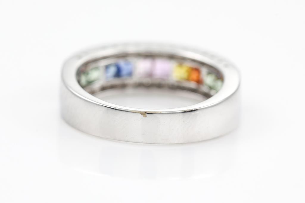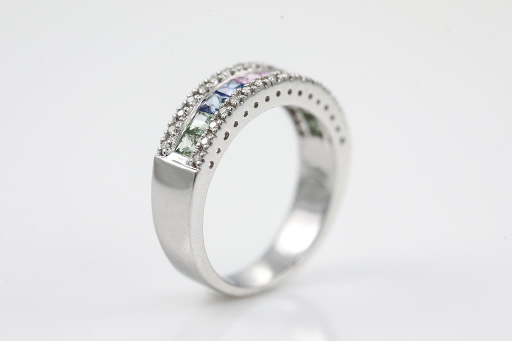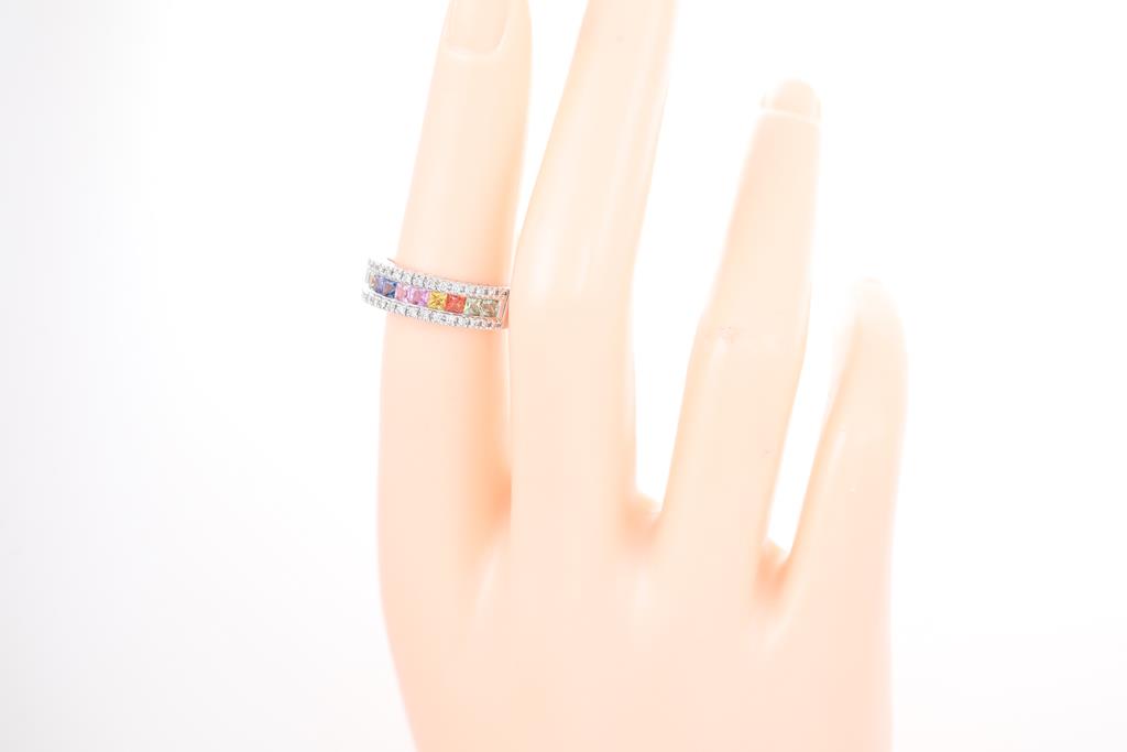 Sapphire ring with princess cut multi-colour Sapphres totalling 0.95cts and round Diamonds totalling 0.16cts. 18ct white gold. Ring size: L - ring resizing is not recommended. Weight: 6.1g. (Pre-owned)