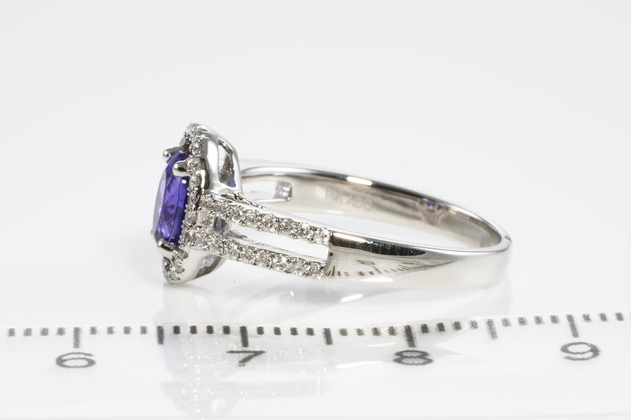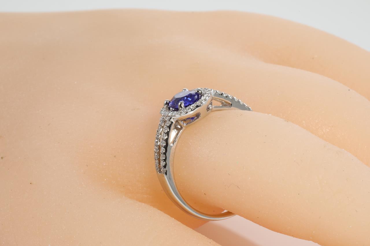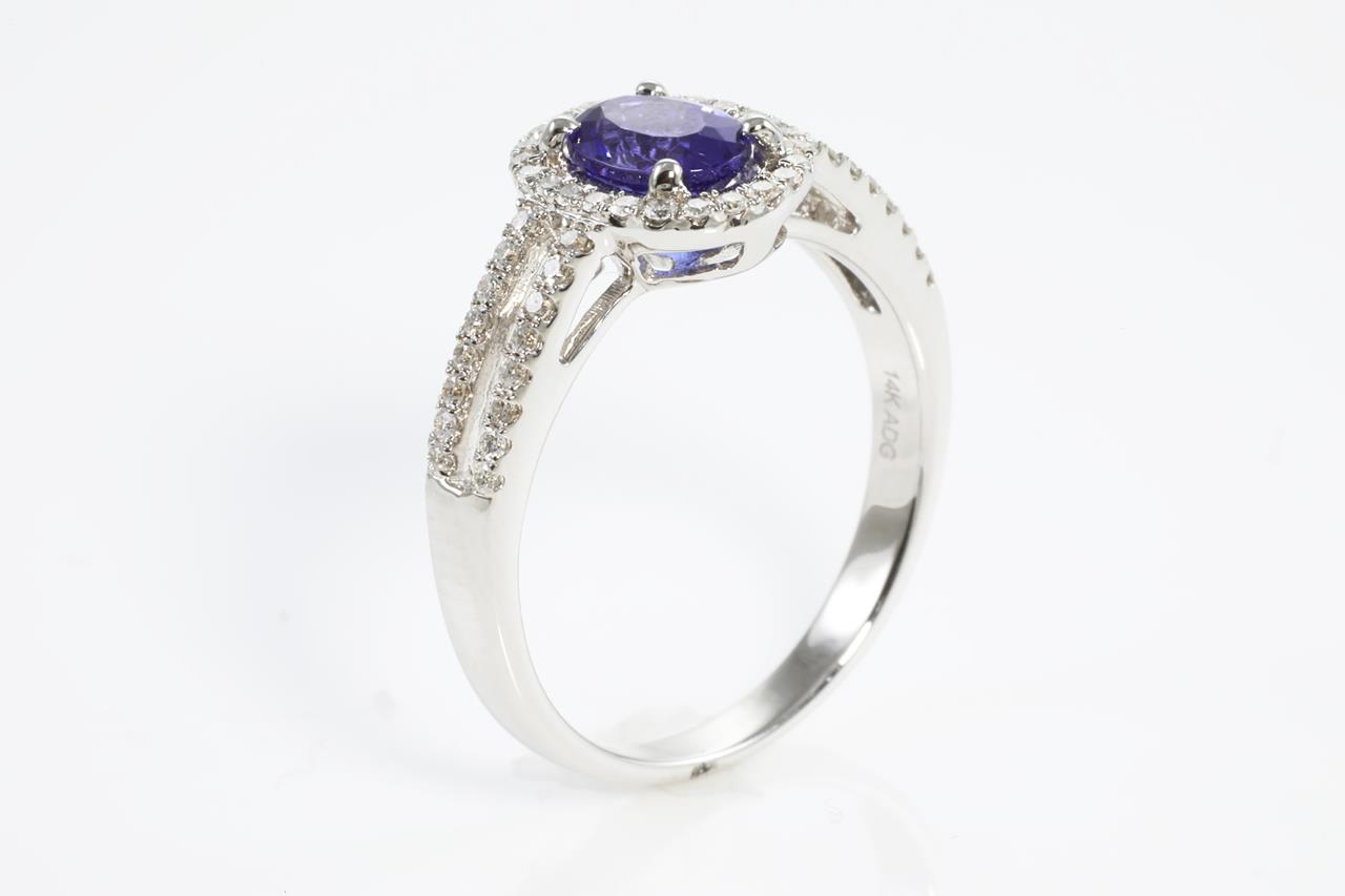 Tanzanite and Diamond ring with oval cut Tanzanite of 0.95ct and Diamonds totalling 0.29cts. 14ct white gold. Ring size: N1/2 - Ring resizing is not recommended. Weight: 3.6g. (As new).