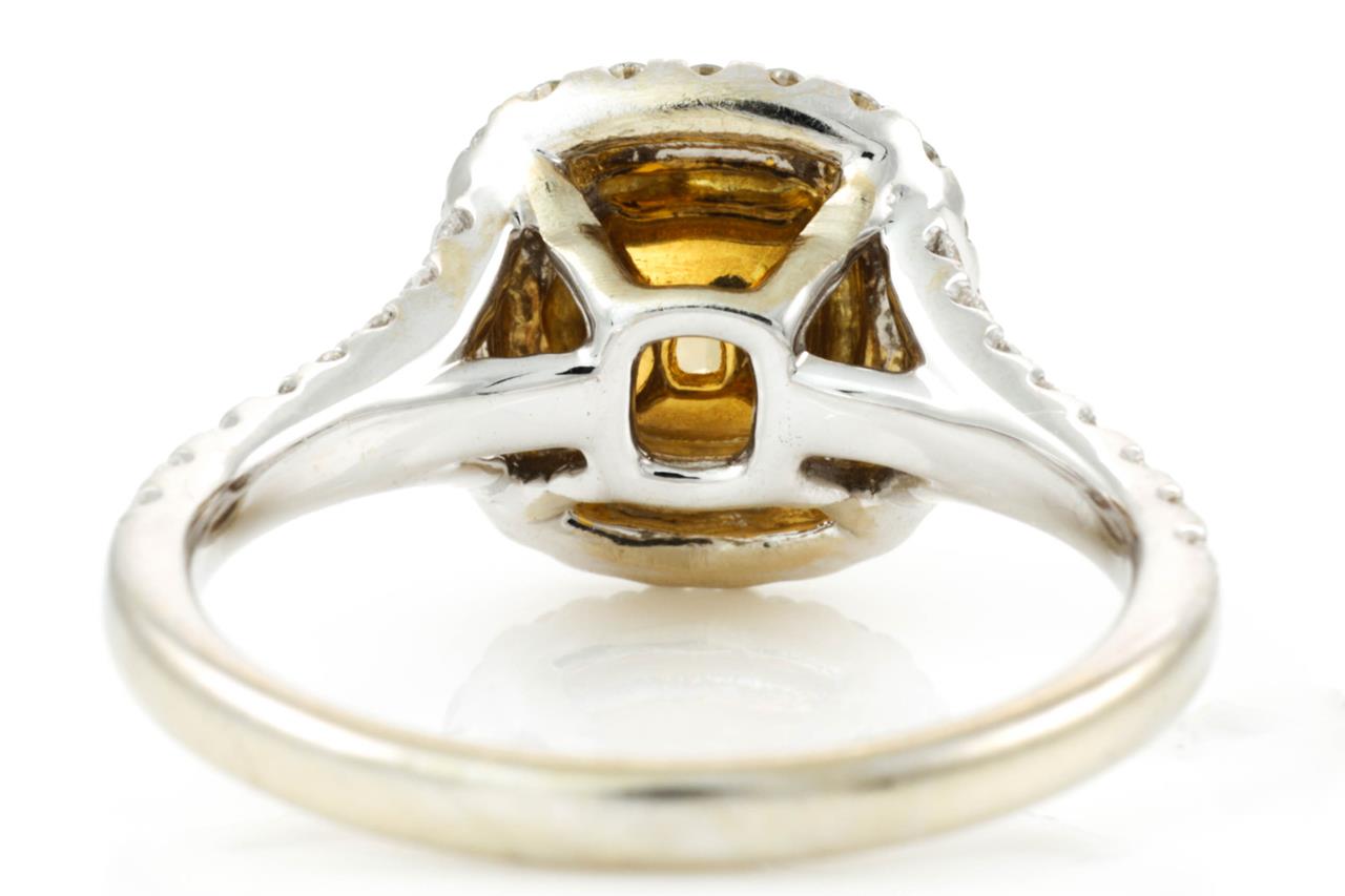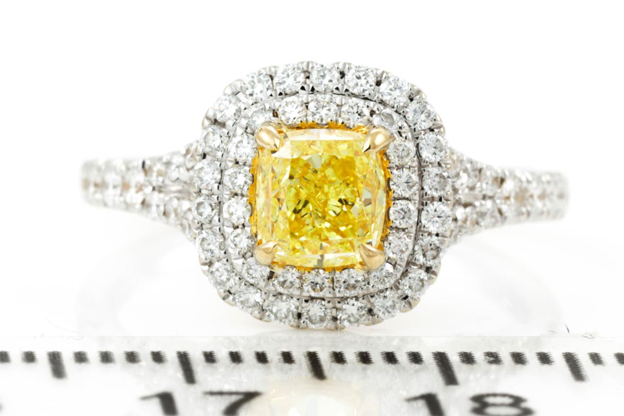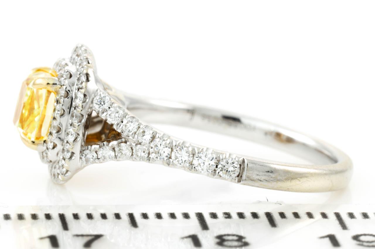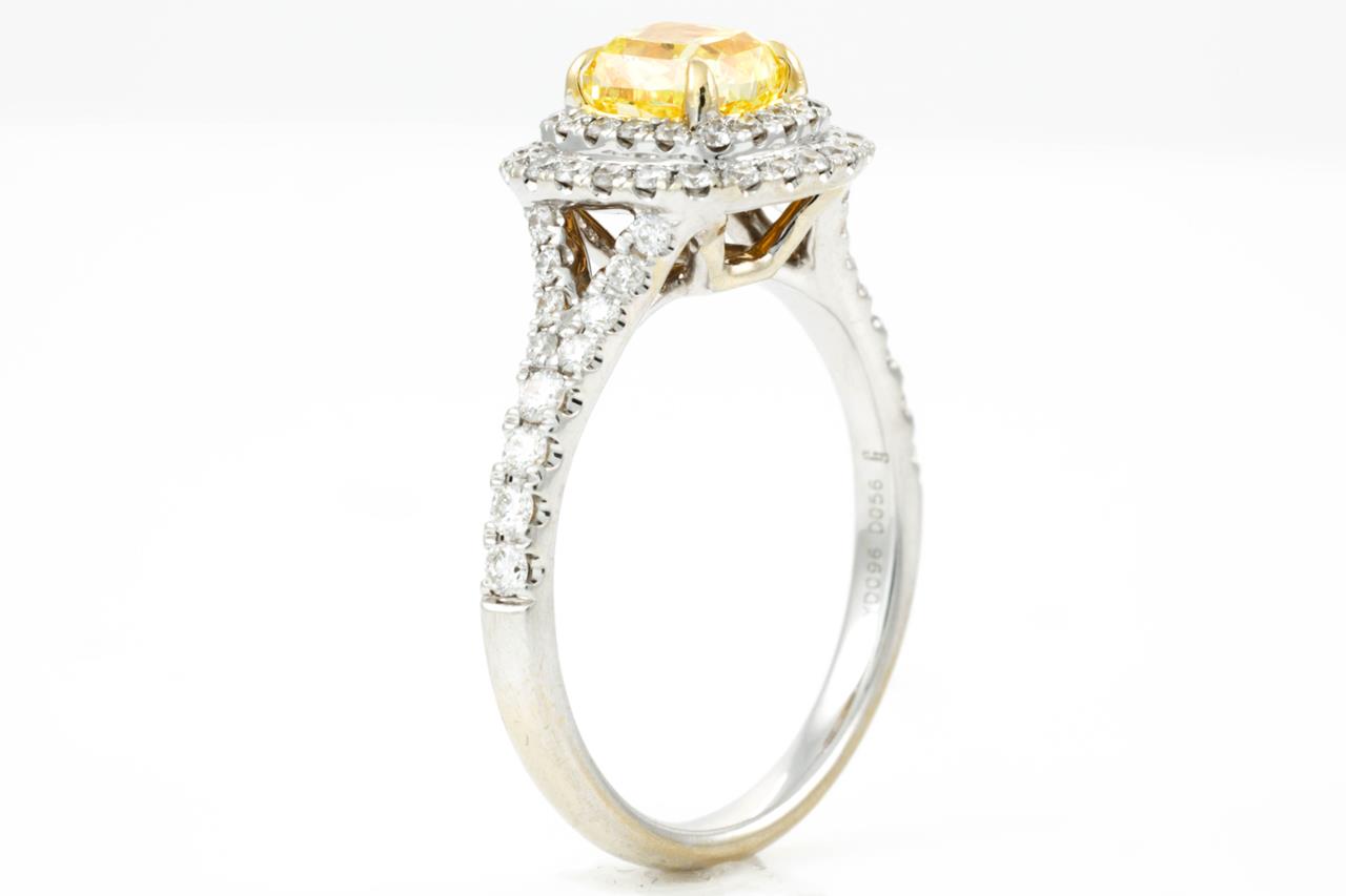 Diamond Halo Ring with modified rectangular brilliant shaped centre Diamond of 0.96ct (with GIA report graded as Natural Fancy Intense Yellow even SI2 #2175384662) and surrounding round diamonds totalling approximately 0.56cts (Estimated grading: G VS-SI) 18ct yellow & white gold. Ring size: L. Weight: 4.2g (Pre-owned)