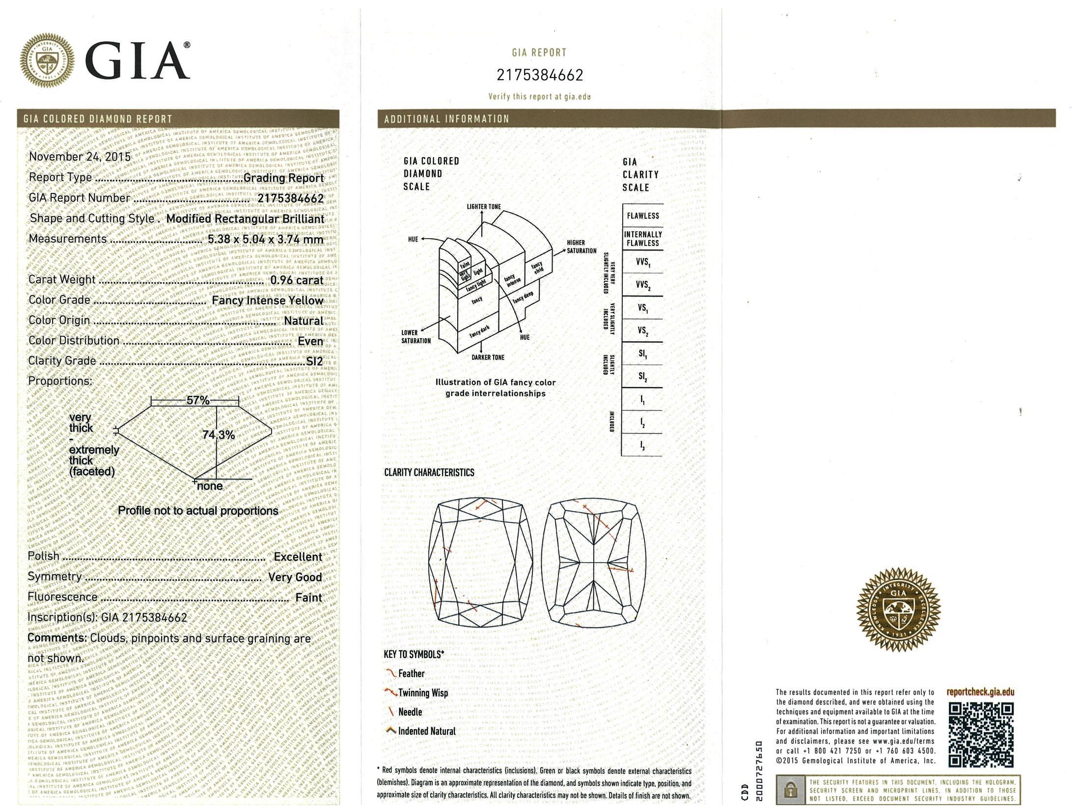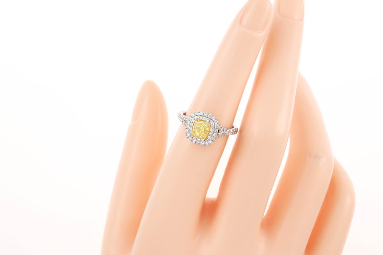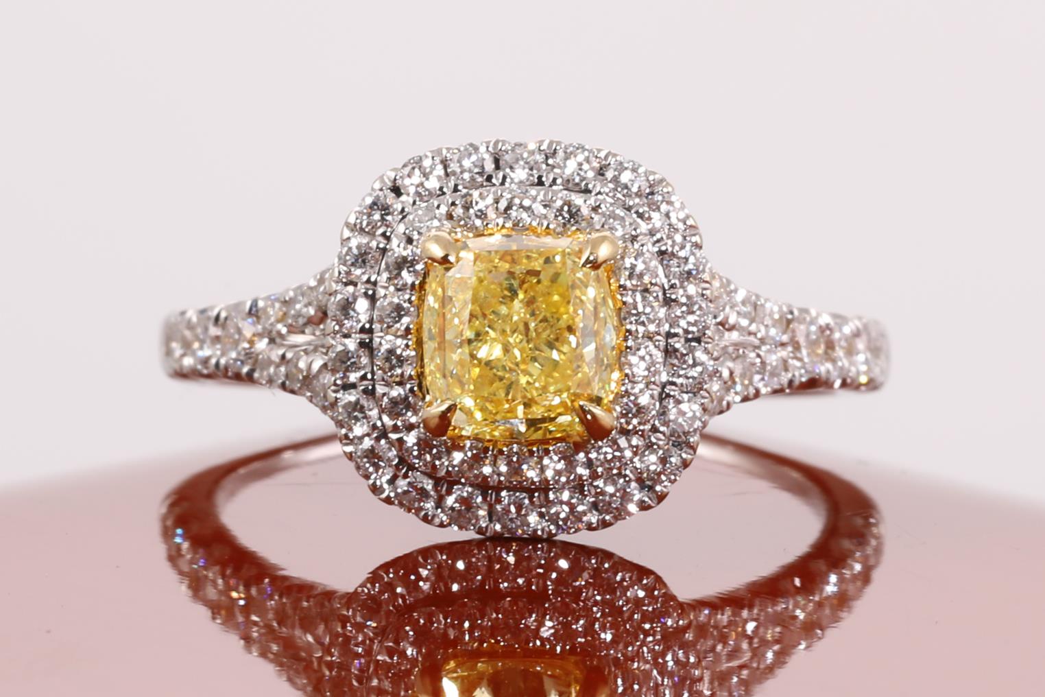 Diamond Halo Ring with modified rectangular brilliant shaped centre Diamond of 0.96ct (with GIA report graded as Natural Fancy Intense Yellow even SI2 #2175384662) and surrounding round diamonds totalling approximately 0.56cts (Estimated grading: G VS-SI) 18ct yellow & white gold. Ring size: L. Weight: 4.2g (Pre-owned)