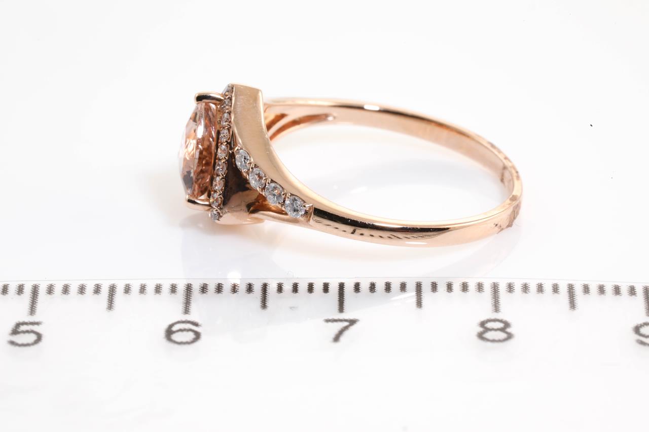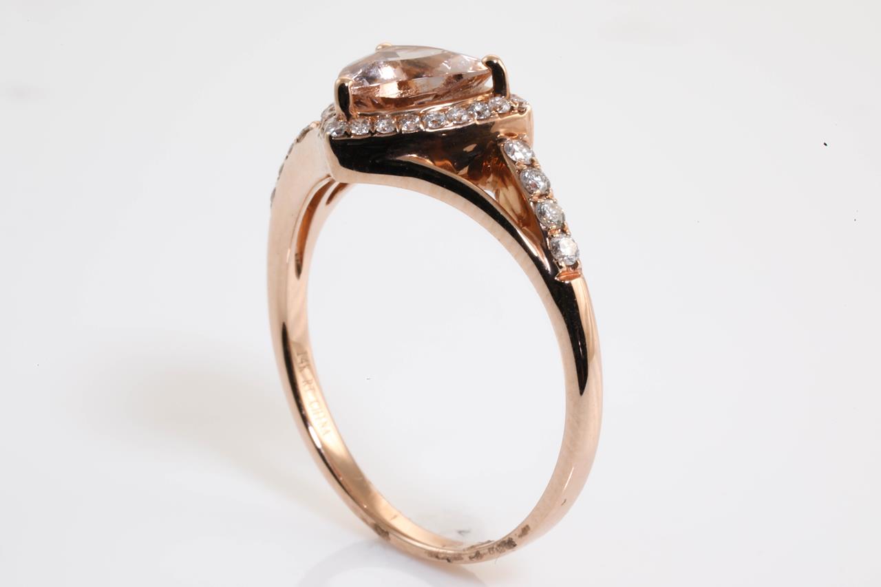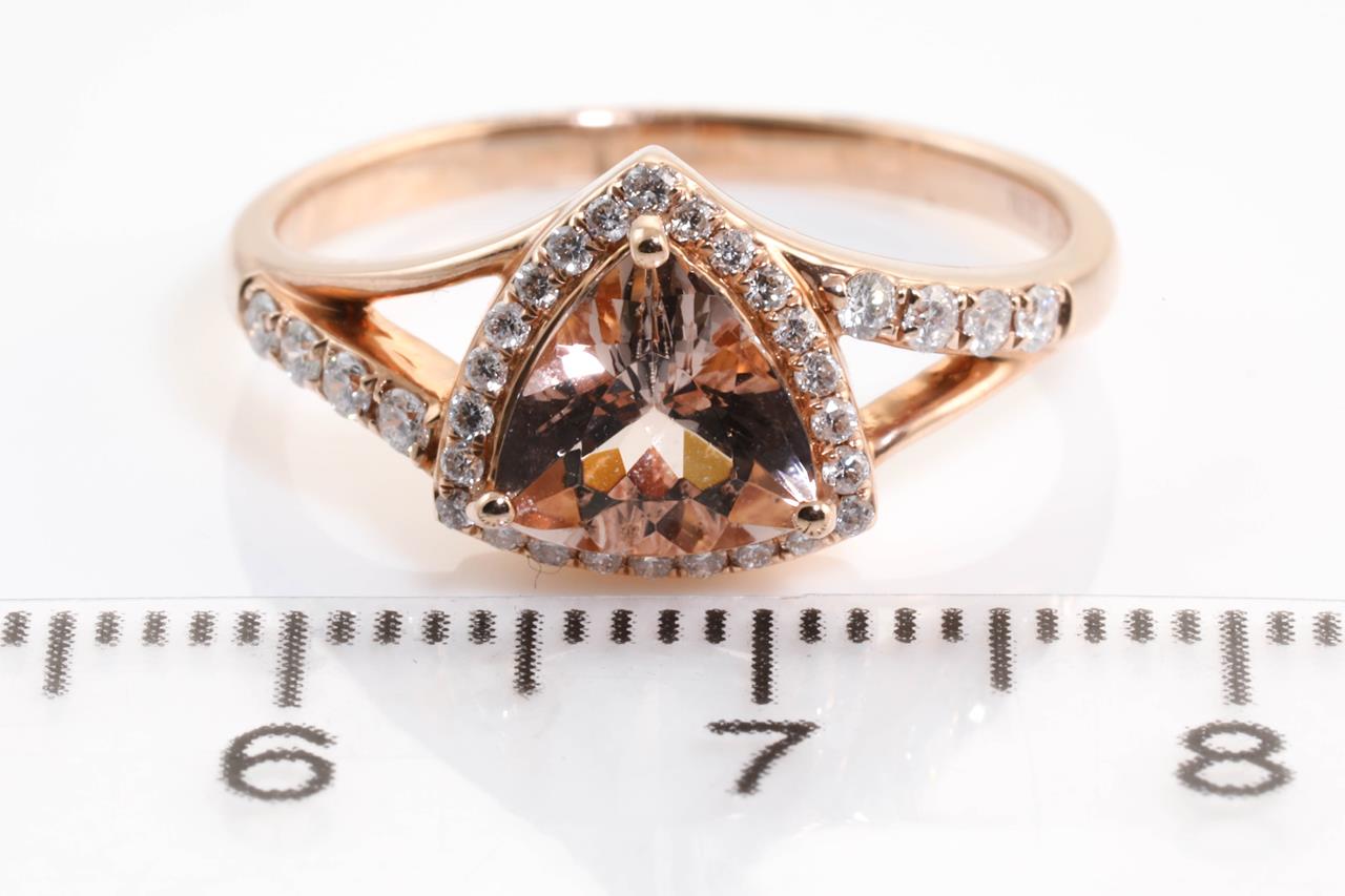 Morganite and Diamond ring with a trilliant cut Morganite of 0.96ct and round Diamonds totalling 0.25cts. 14ct rose gold. Ring size N1/2. Weight: 2.8g (As New).