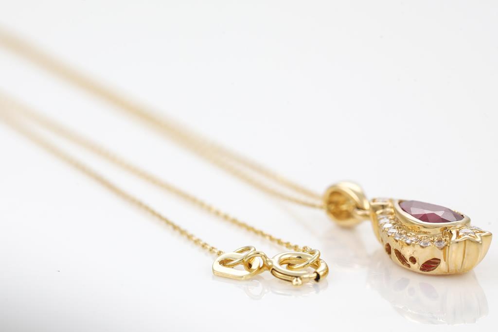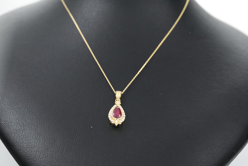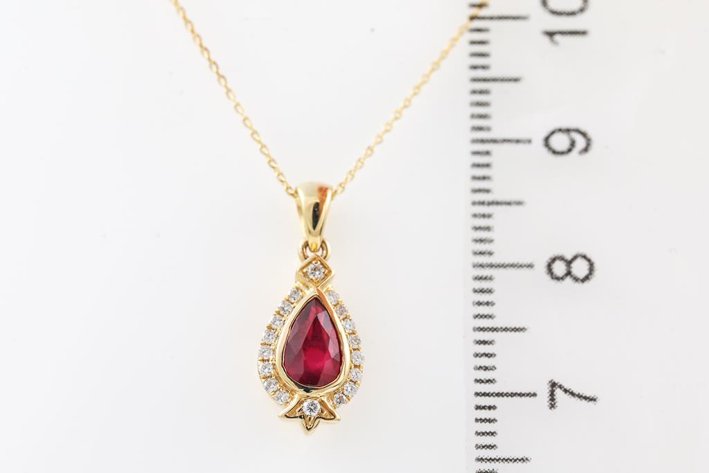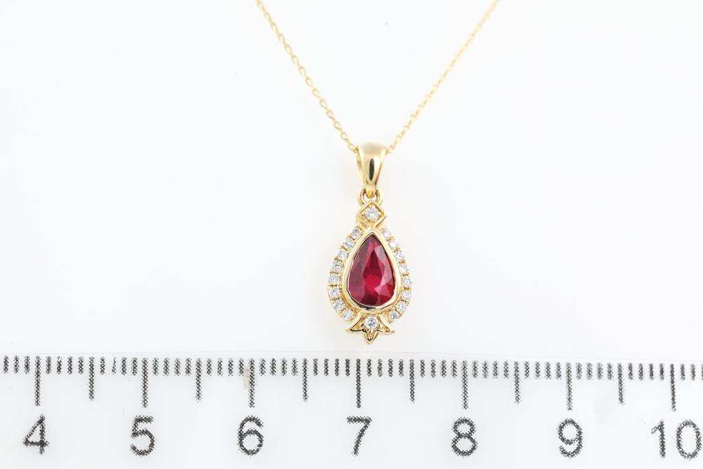 Ruby and Diamond pendant with unheated pear shape Ruby of 0.97ct and round Diamonds totalling 0.12cts. 18ct yellow gold with 45cm 14ct gold chain. Weight: 2.8g (As New)