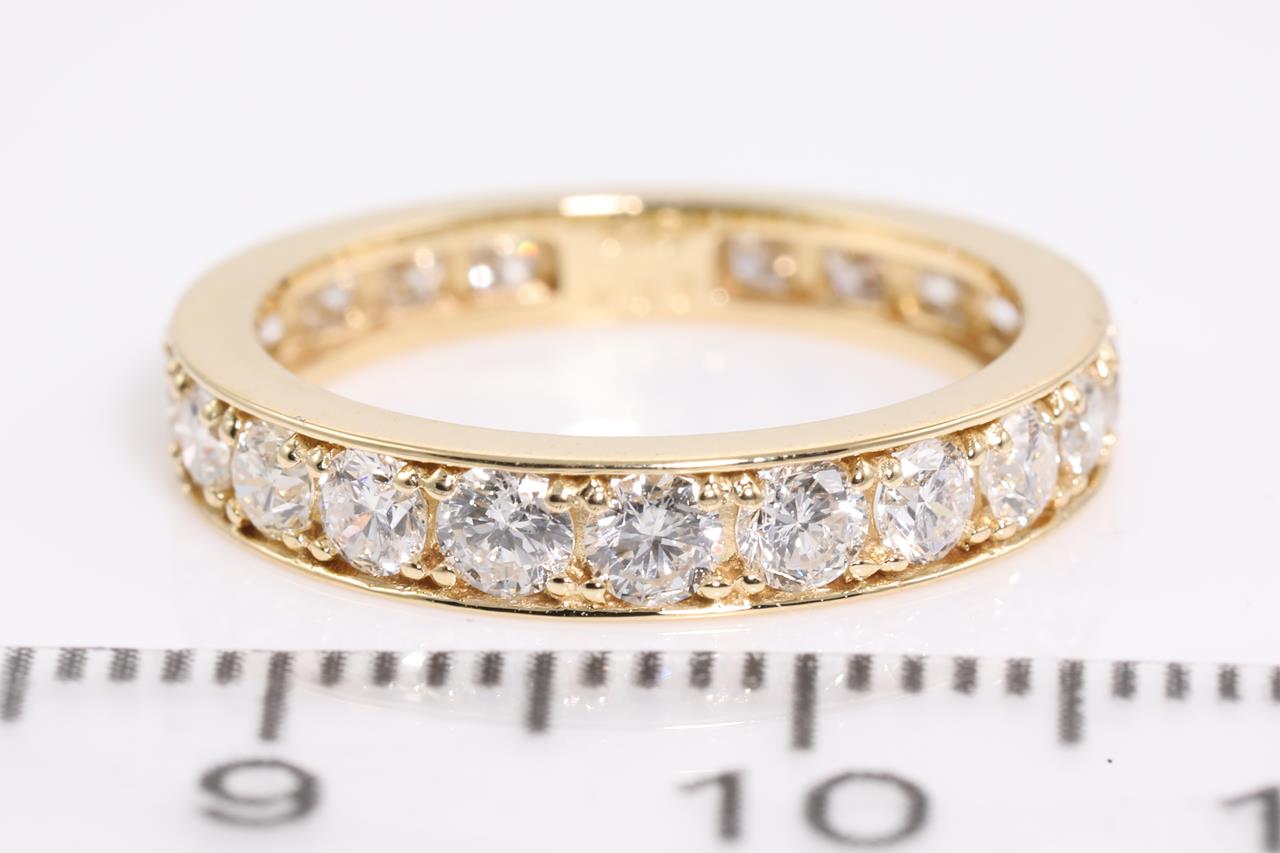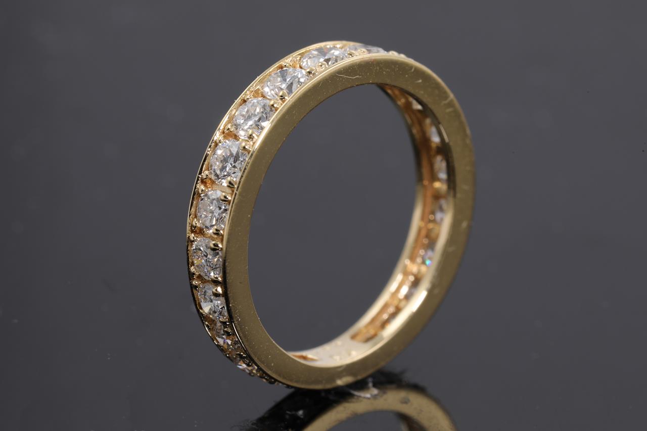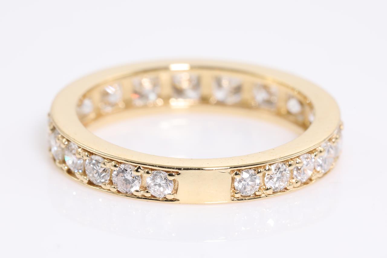Diamond full hoop eternity ring with round Diamonds totalling 0.97cts (Estimated grading: TG-H SI). 18ct yellow gold. Ring size H - cannot be resized up, down with ring clip. Weight: 1.8g (Pre-owned)