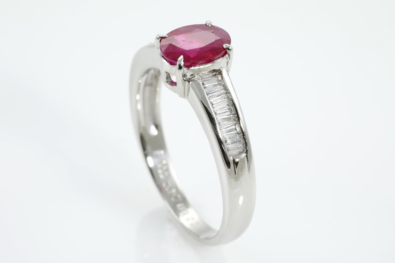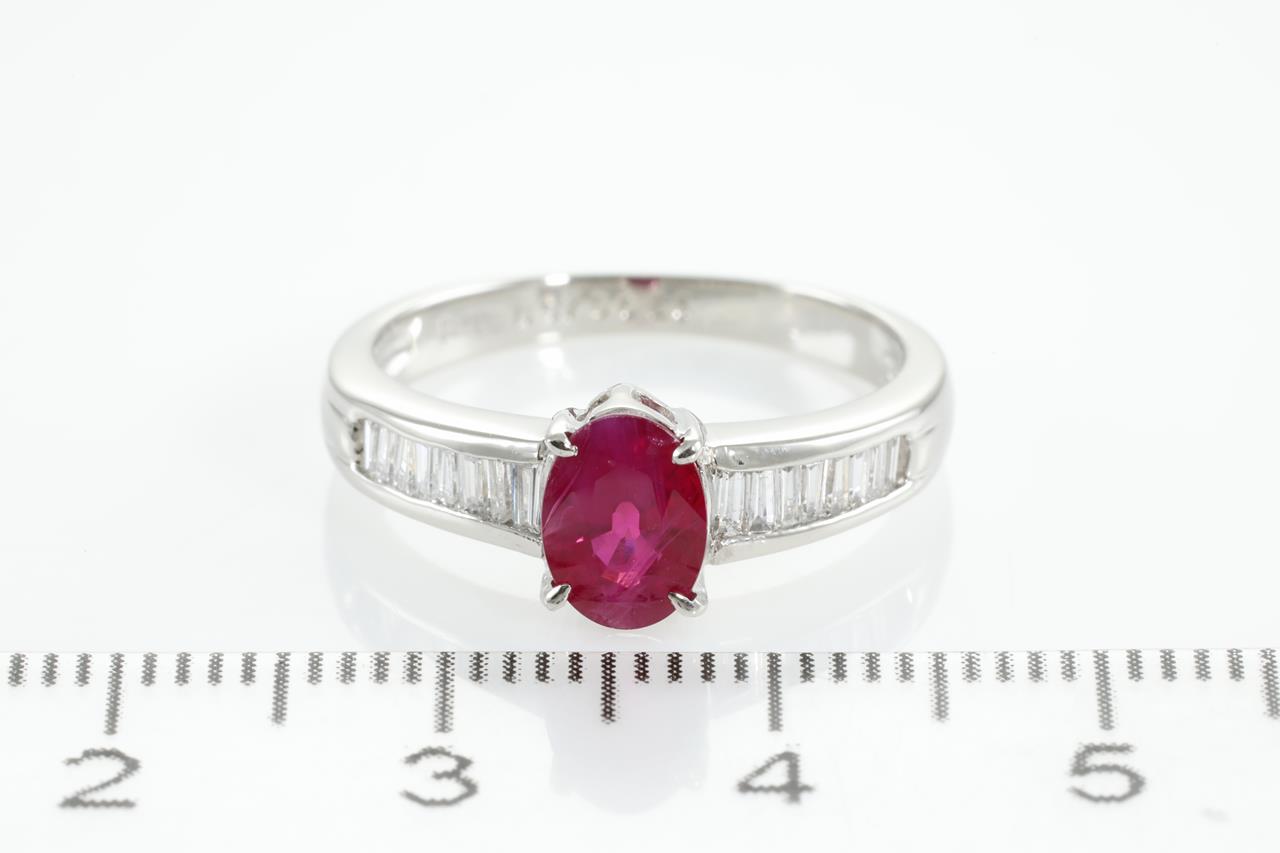 Ruby and Diamond ring with oval shape Ruby of 0.97ct and baguette cut Diamonds totalling 0.25cts. Platinum. Ring size L1/2 - can only be resized up or down by a maximum of 3 sizes. (Pre-owned)