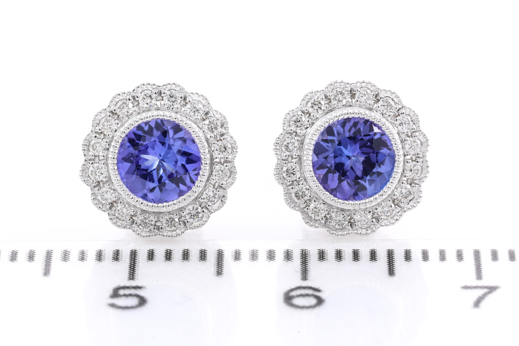 Tanzanite and Diamond earrings with round Tanzanite's totalling 0.97cts and Diamonds totalling 0.15cts. 18ct white gold. Weight: 2.7g. (New)