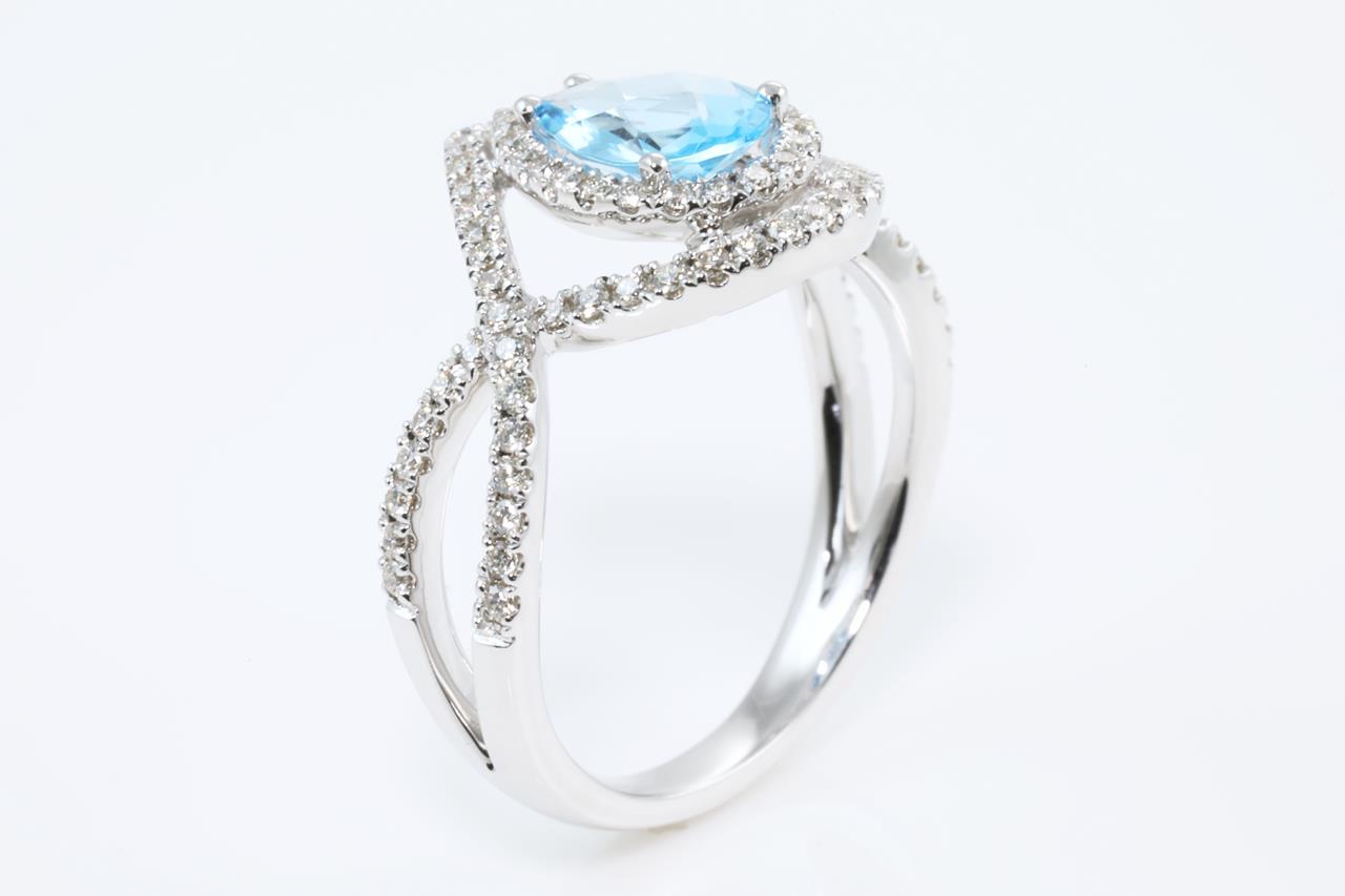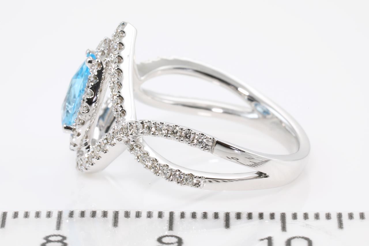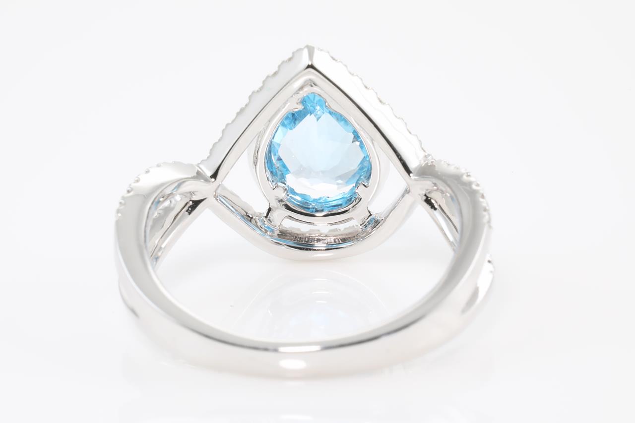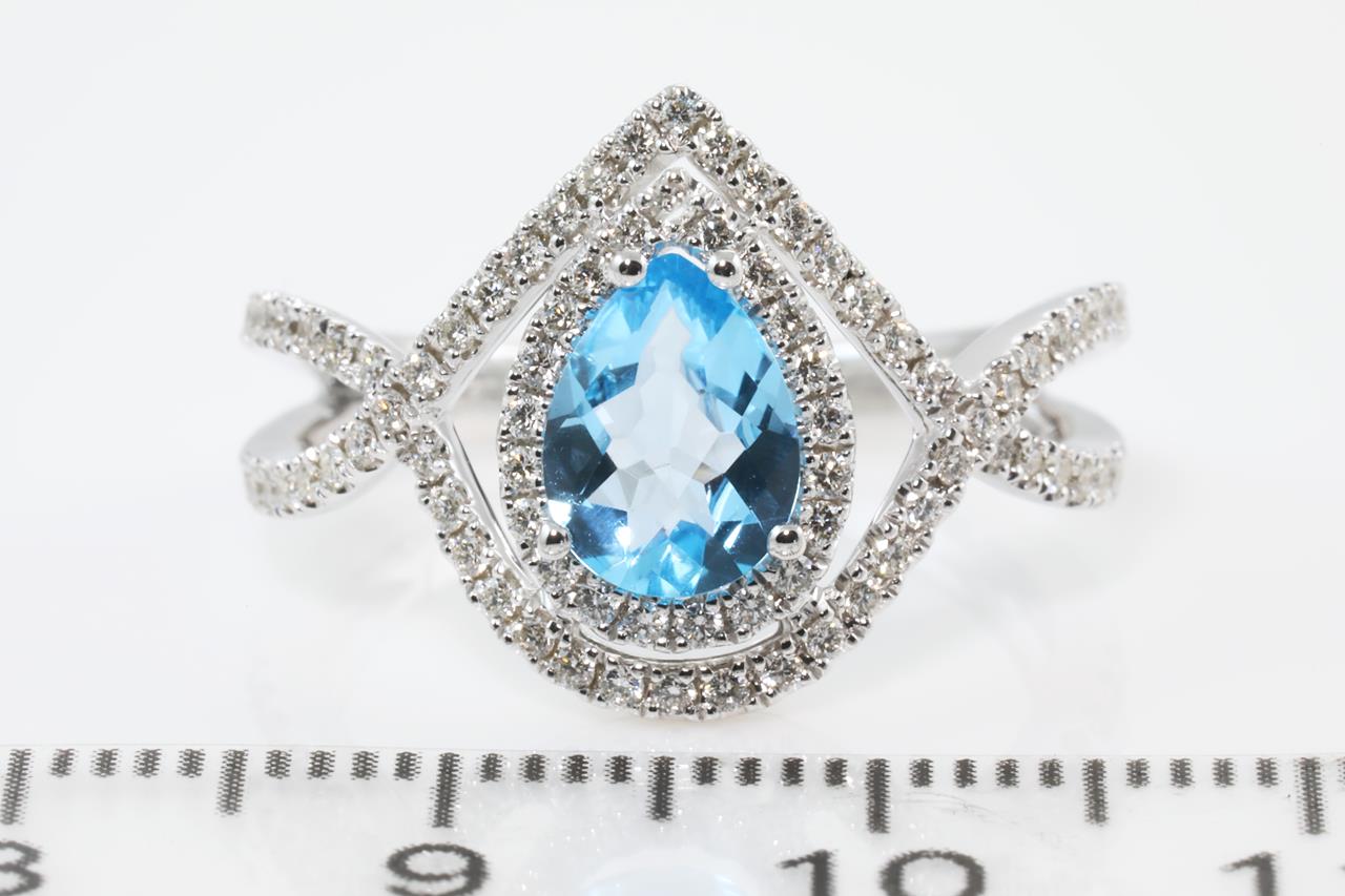 Topaz and Diamond ring with pear shape Blue Topaz of 0.98ct and Diamonds totalling 0.44cts (Estimated grading: H SI) 9ct white gold. Ring size N1/2 - Ring resizing is not recommended. Weight: 3.8g (New)