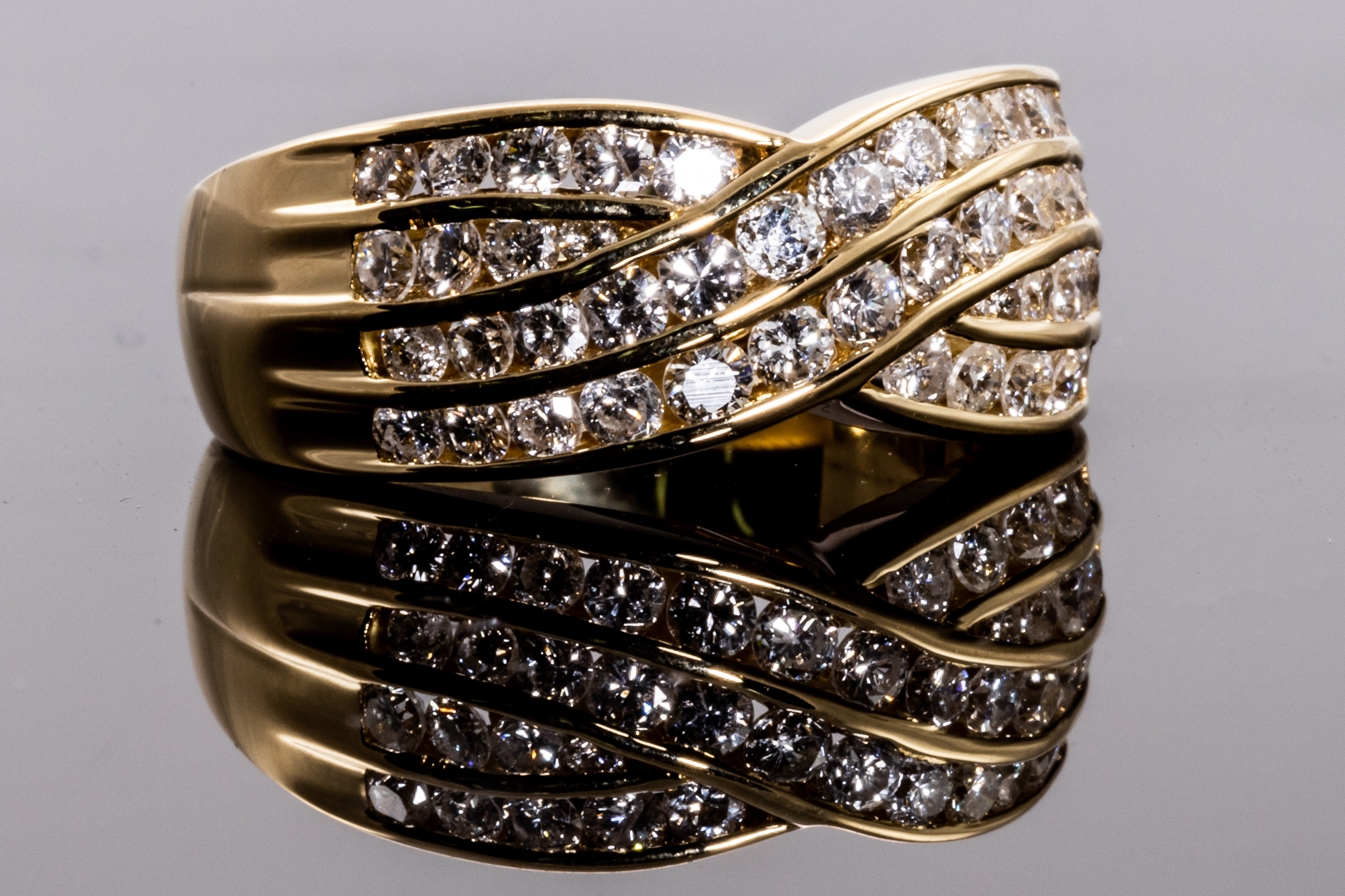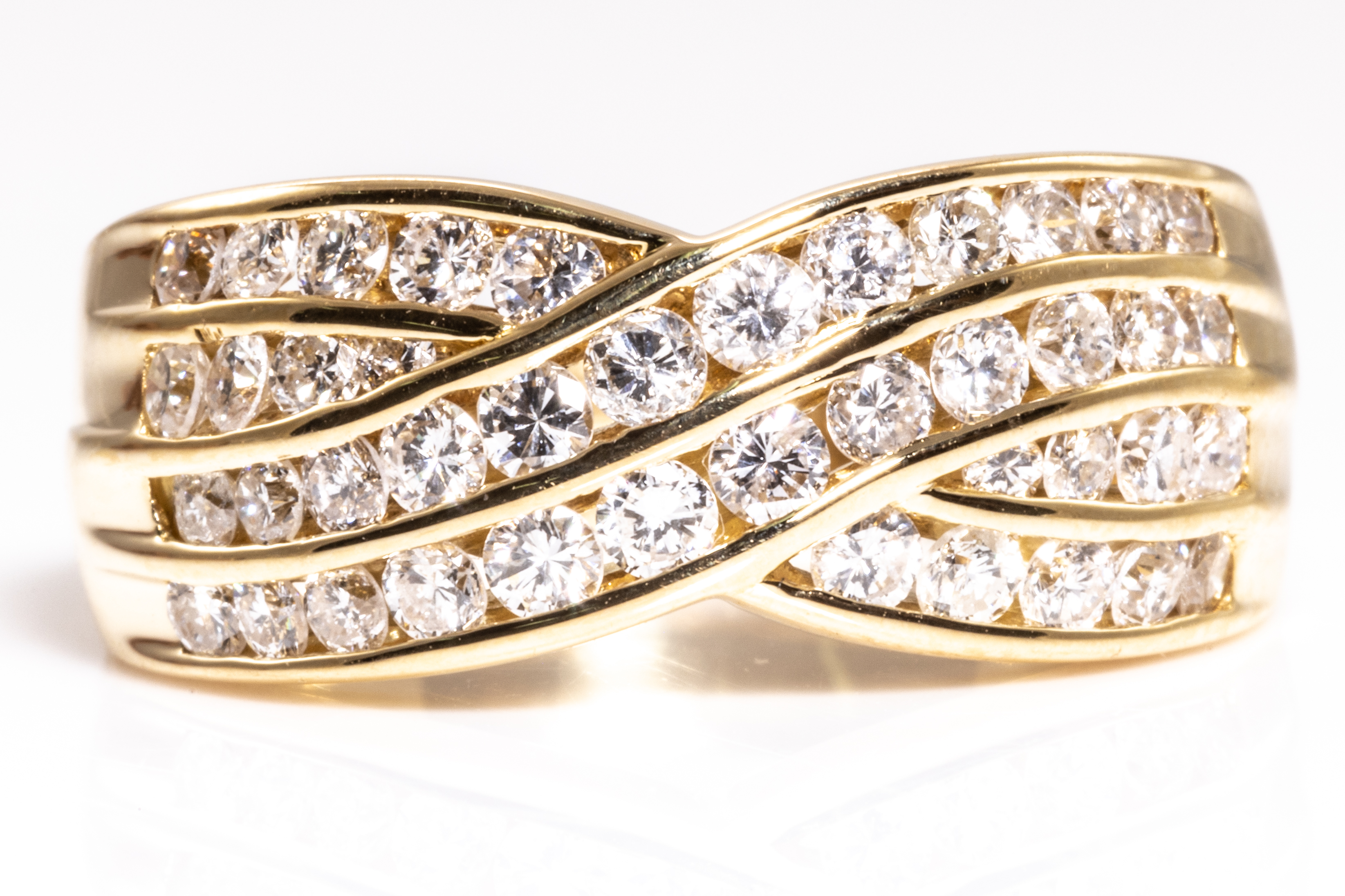 Diamond dress ring with round Diamond totalling 0.99cts (Estimated grading: G-H SI). 18ct yellow gold. Ring size L -Ring re-sizing is not recommended. Weight: 8.2g. (Pre-owned)