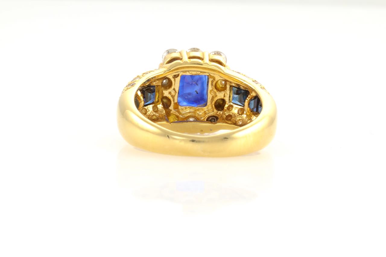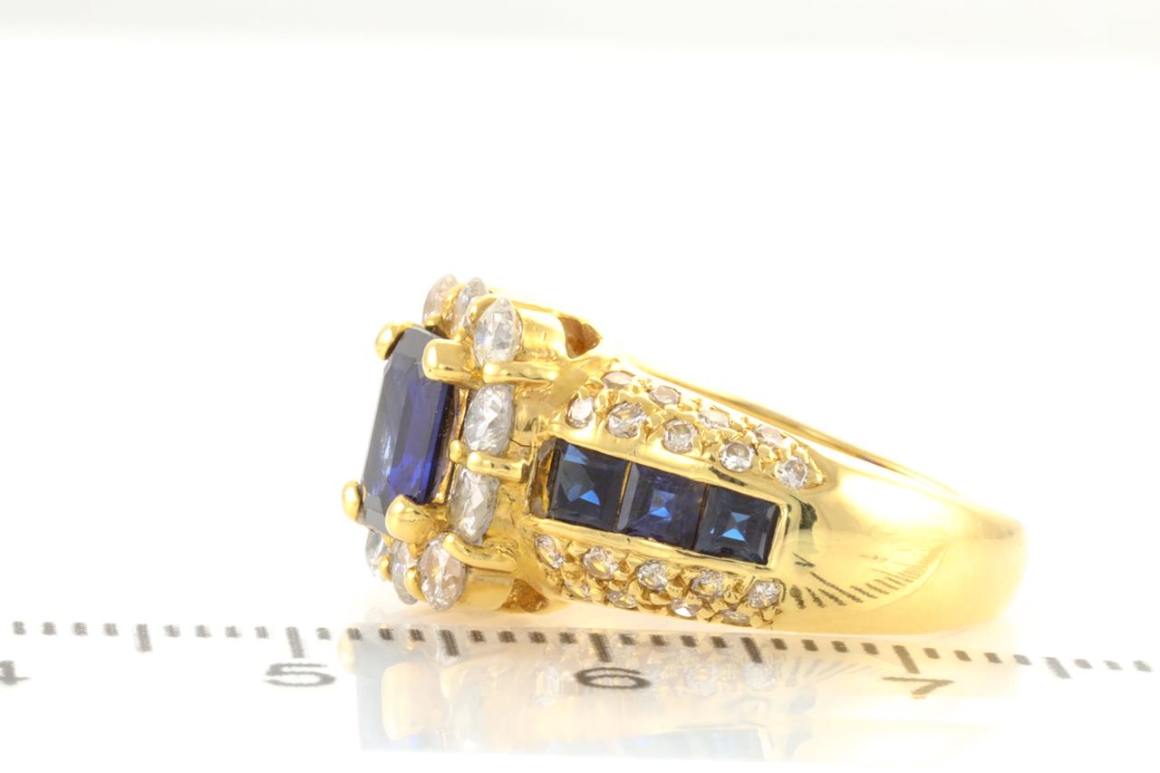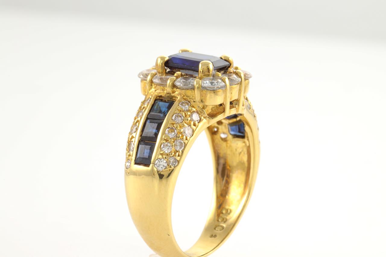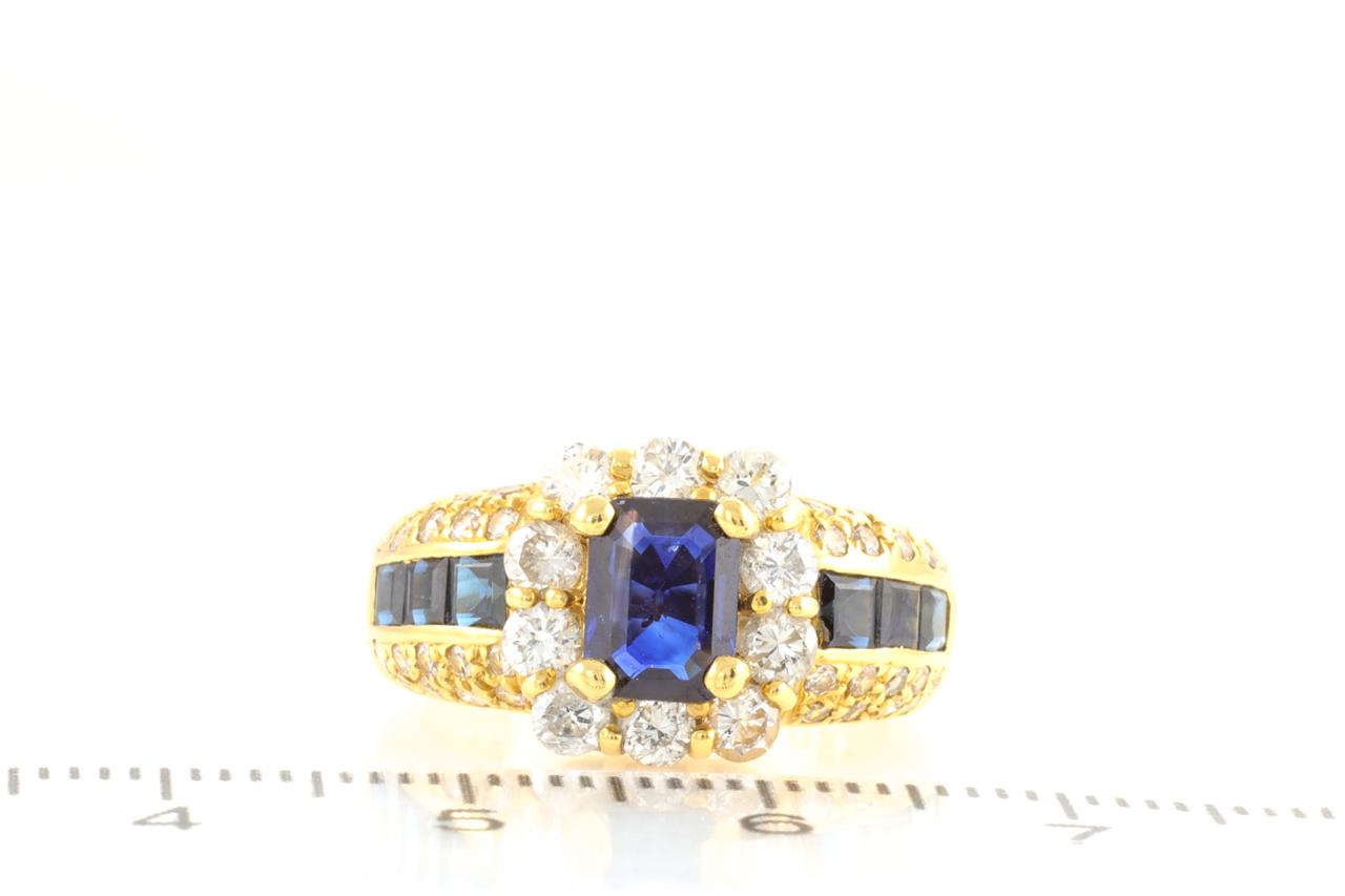 Sapphire and Diamond ring with emerald cut Sapphire of 0.99ct and Diamonds totalling 1.15cts (Estimated grading: H-J SI-P1). 18ct yellow gold. Ring size: K. Weight: 6.5g (Pre-owned)