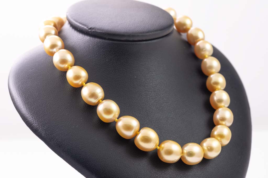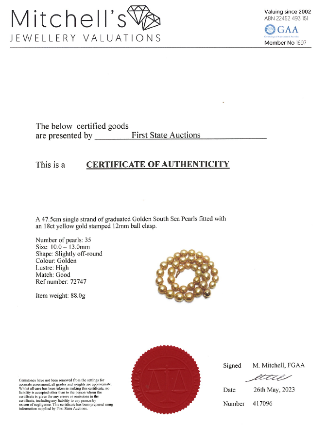 Pearl necklace with 35 graduated oval & drop shape Golden South Sea Pearl of 10-13mm. 18ct yellow gold 12mm ball clasp. Length: 47.5cm. Weight: 88.0g. With Certificate (As new).