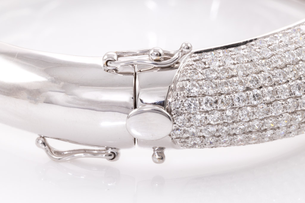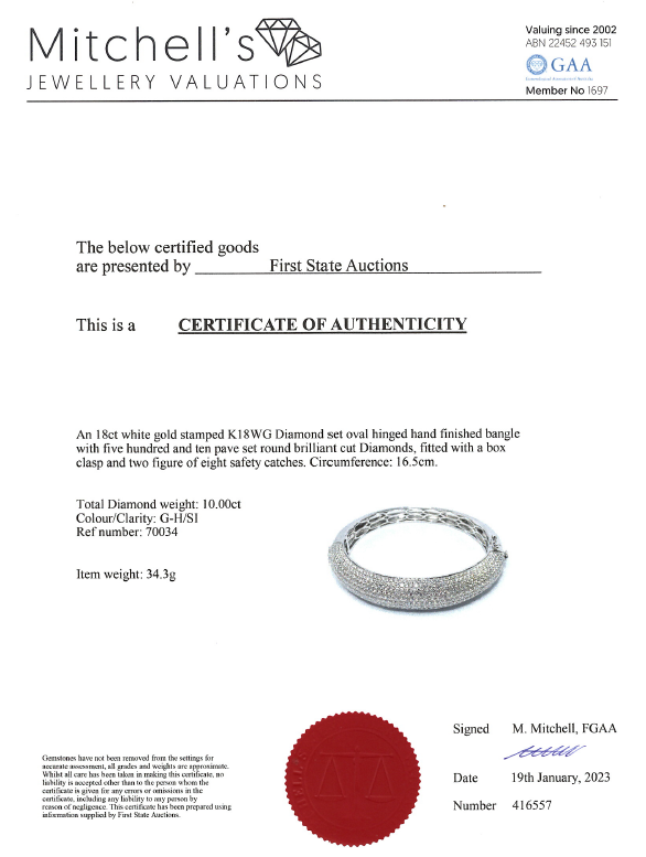 Diamond oval shape bangle with round Diamonds totalling 10.00cts (Estimated grading: G-H SI). 18ct white gold. Circumference: 16.5cm. Weight: 34.3g. With Certificate #416557. (Pre-owned)