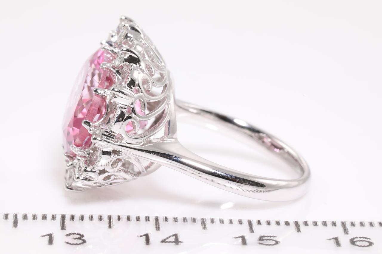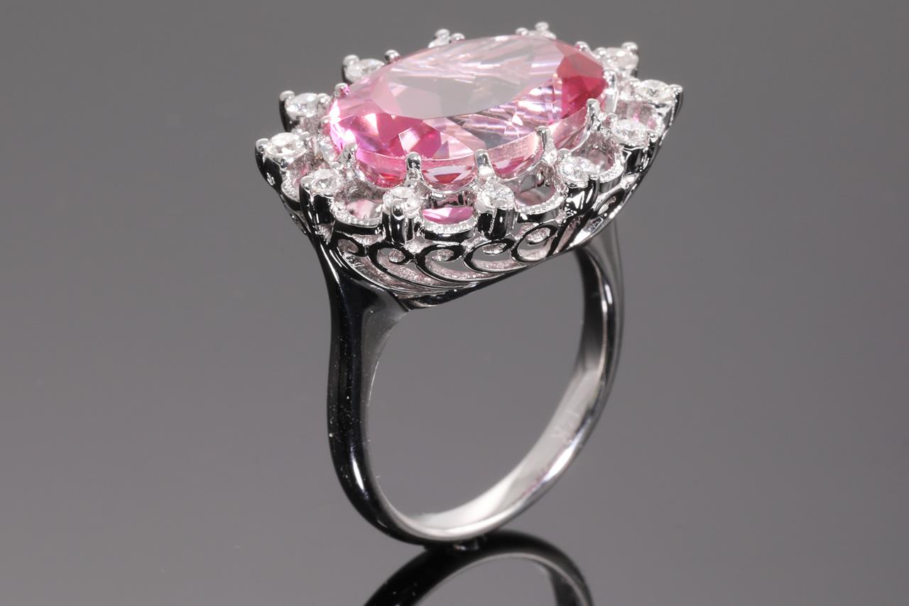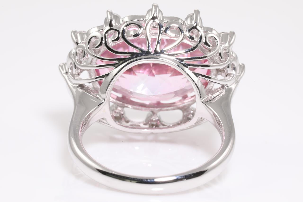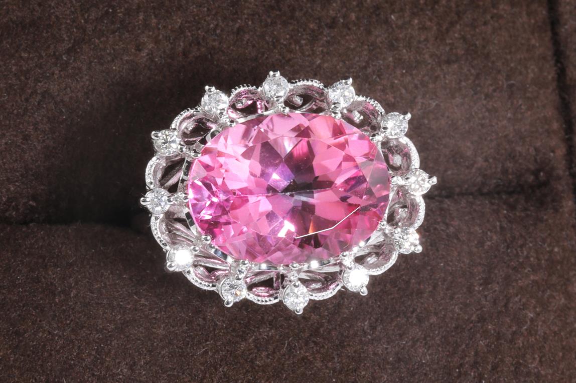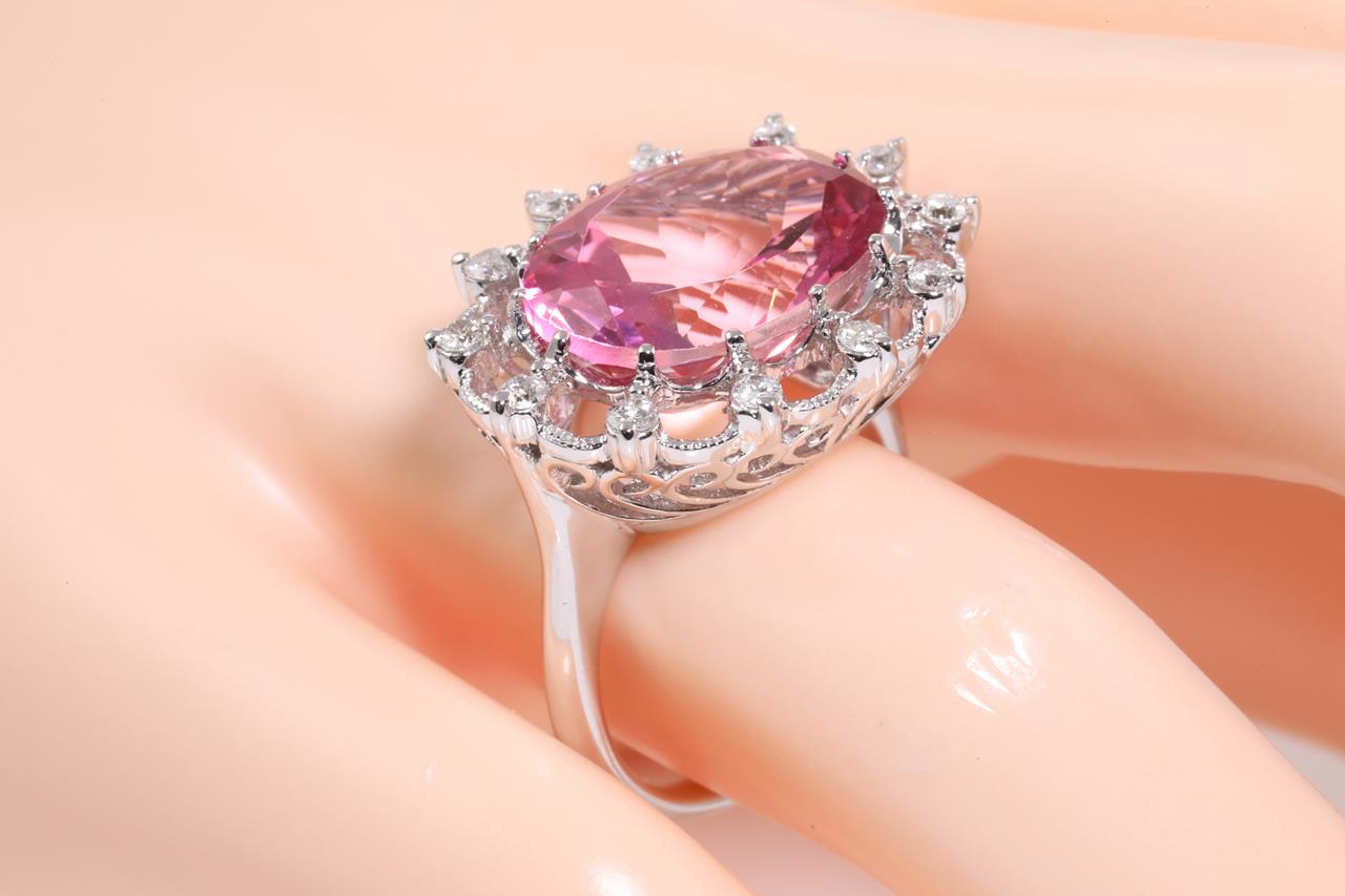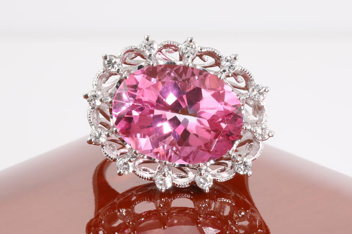 Topaz ring with oval cut pink Topaz of approximately 10.00ct with round Diamonds totalling approximately 0.40cts. (Estimated grading: I SI-P1) 14ct white gold. Ring size N. Weight 9.2g. (Pre-owned)