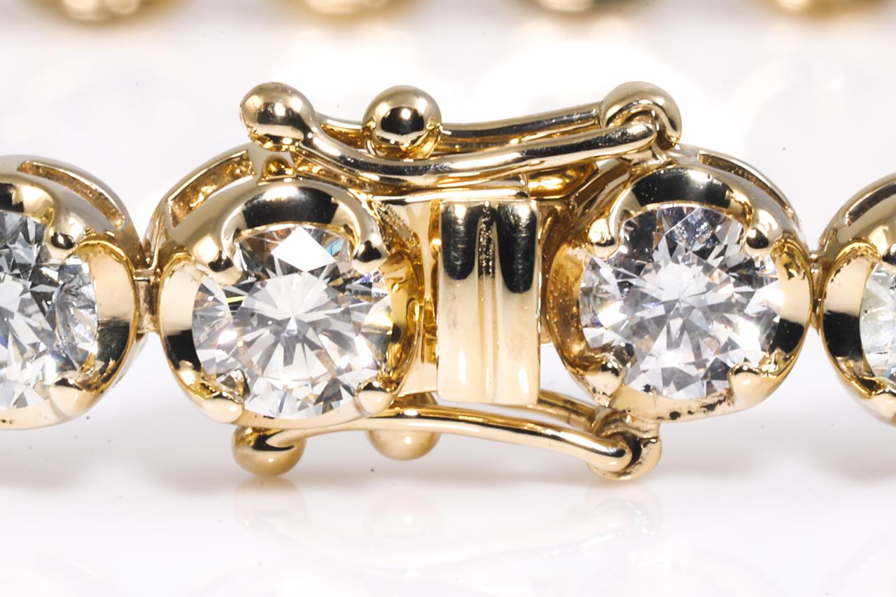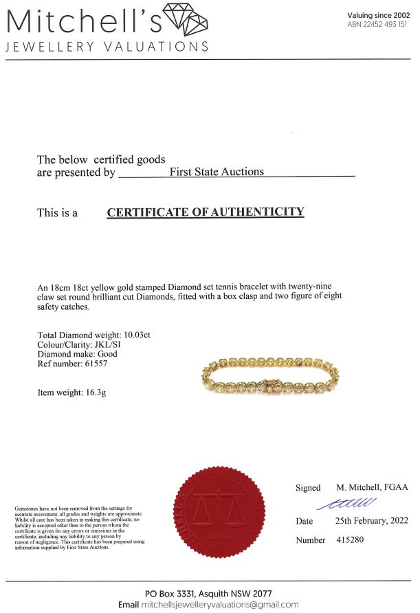 Diamond tennis bracelet with 29 round Diamonds totalling 10.03cts (Estimated grading: J-L SI). 18ct yellow gold. Length: 18cm. Weight: 16.3g. With certificate #415280. (New)