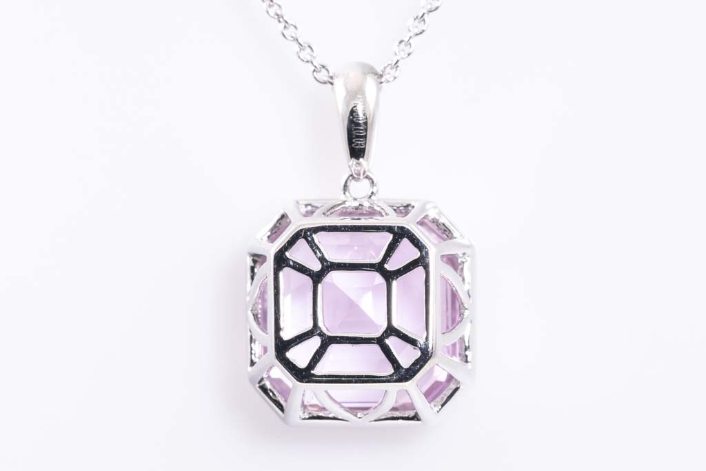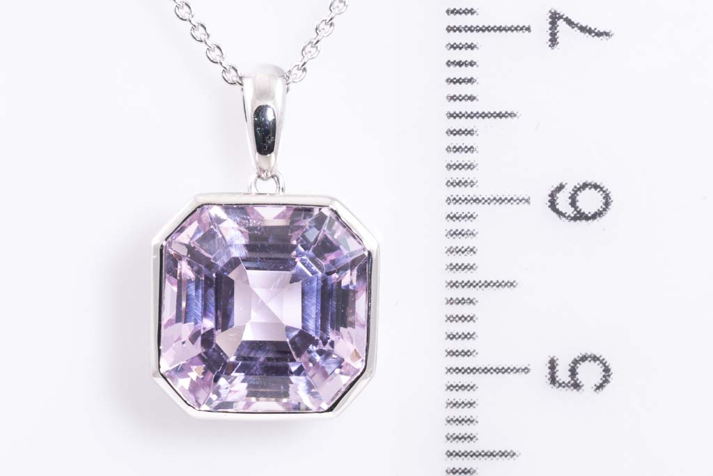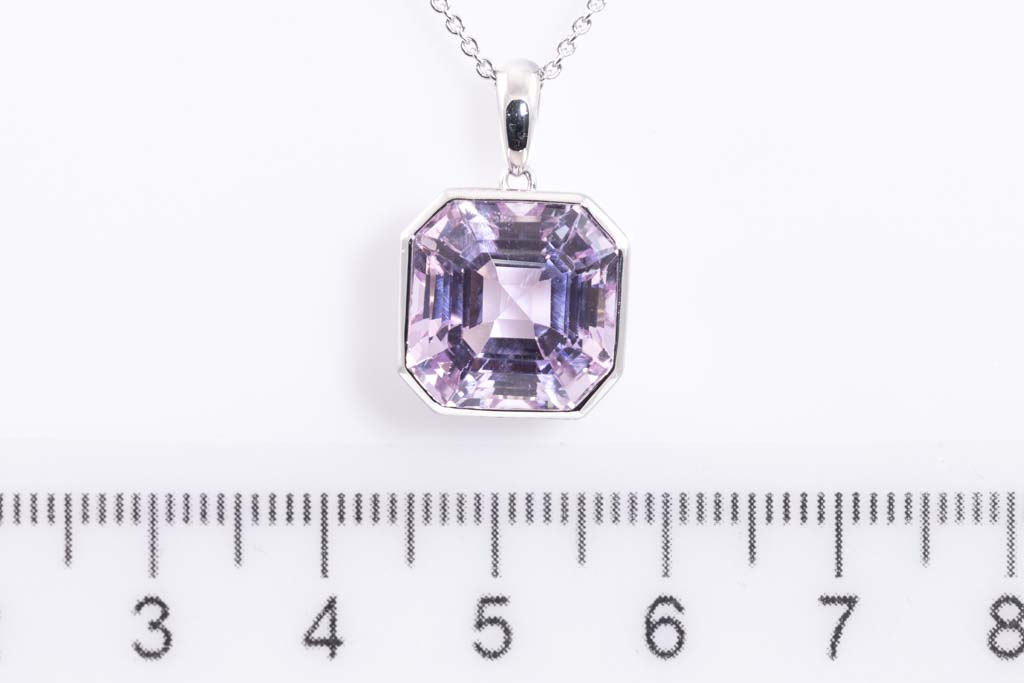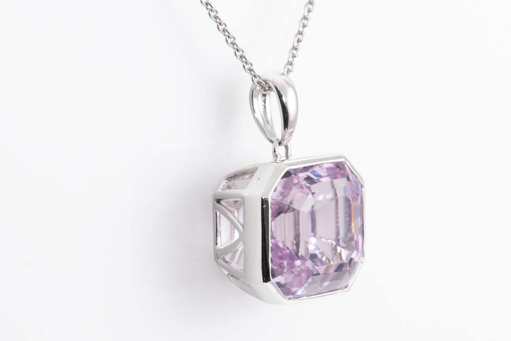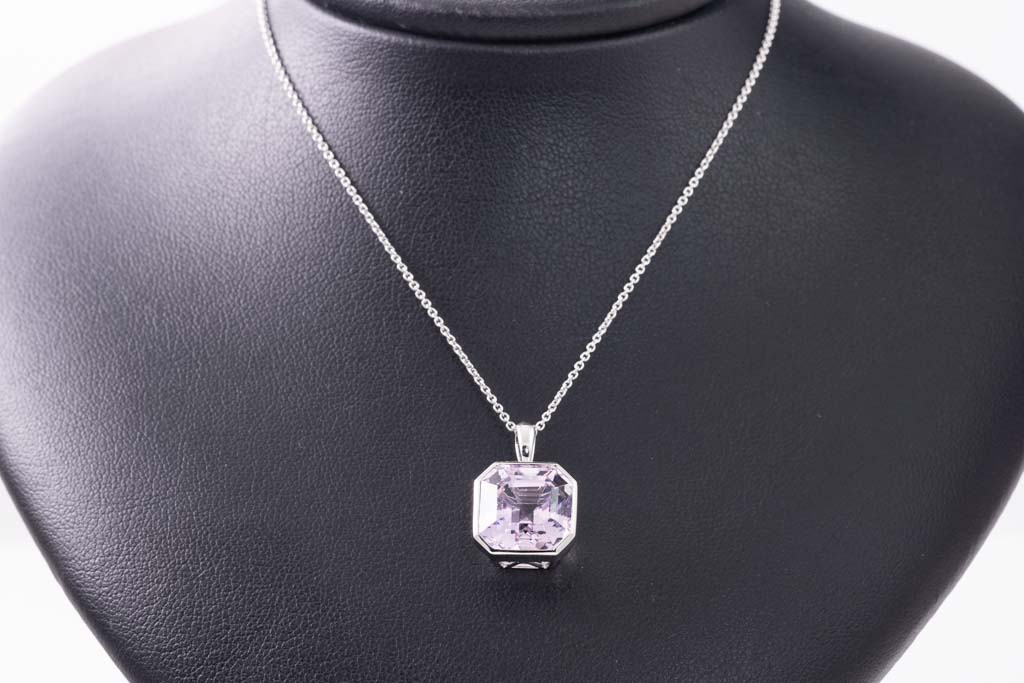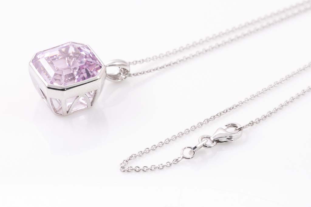 Kunzite pendant with emerald cut Kunzite of 10.03ct. Platinum with 18ct white gold 42cm chain. Weight: 7.8g. (Pre-owned)