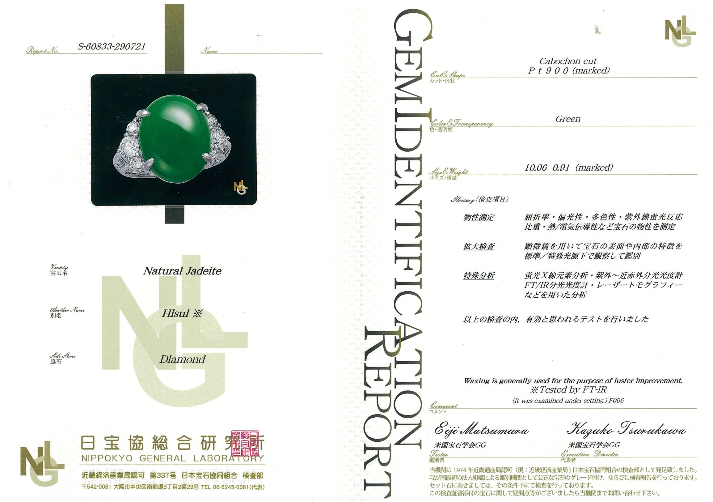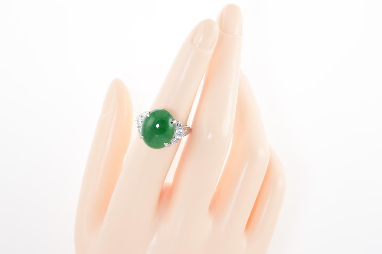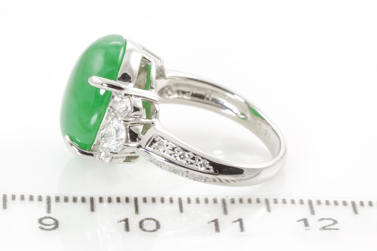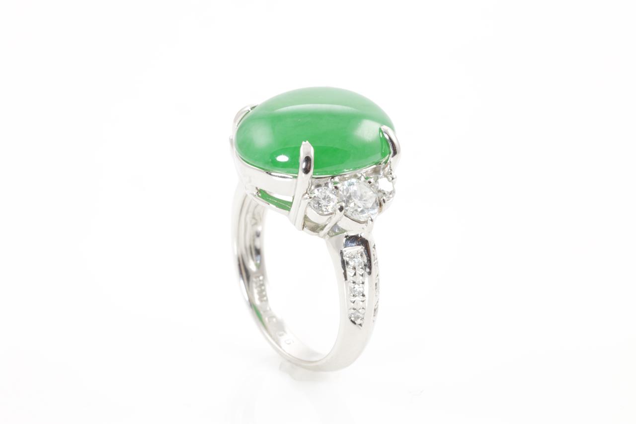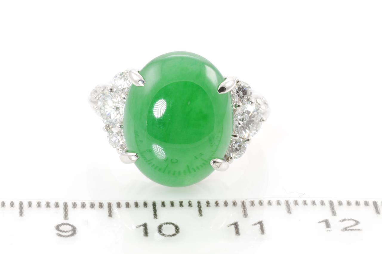 Jade and Diamond ring with an oval green translucent natural Jadeite Jade of 10.06ct and Diamonds totalling 0.91cts (Estimated grading: G SI). Platinum. Ring size L1/2. Weight: 12.0g. With Gem Identification Report #60833. (Pre-owned)