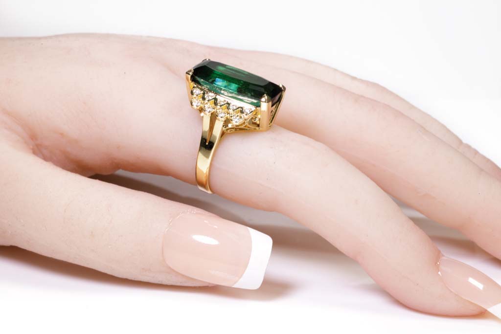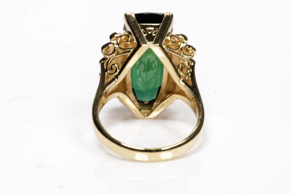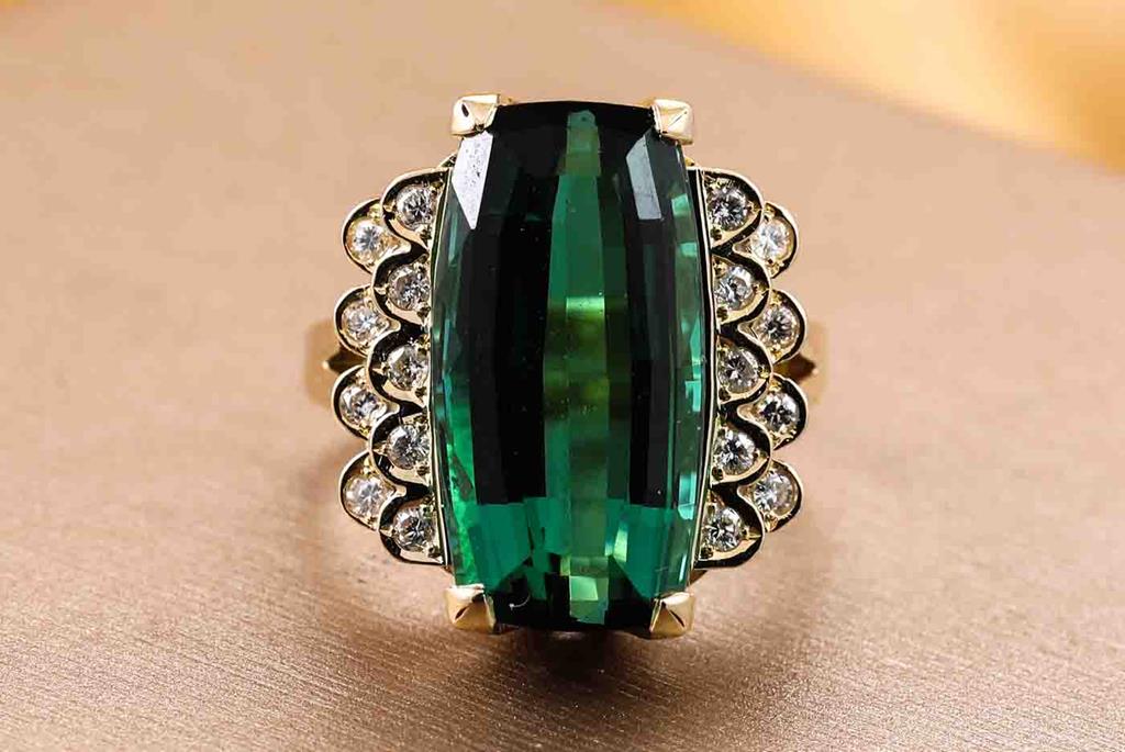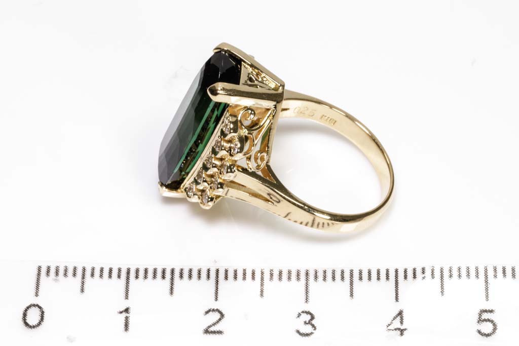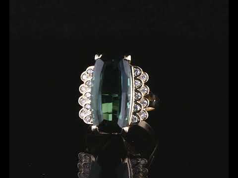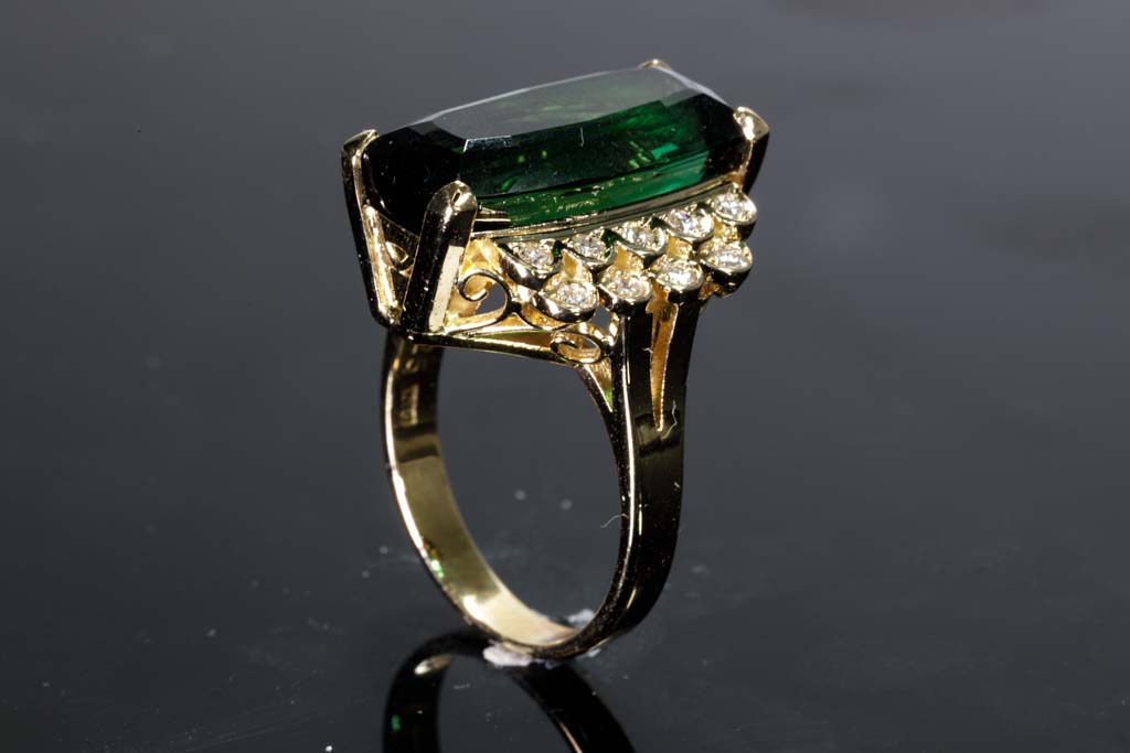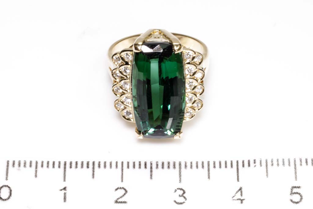 Tourmaline and Diamond ring with cushion cut Tourmaline of 10.09ct and round Diamonds totalling 0.25cts. 18ct yellow gold. Ring size K1/2. Weight: 9.3g. (Pre-owned)