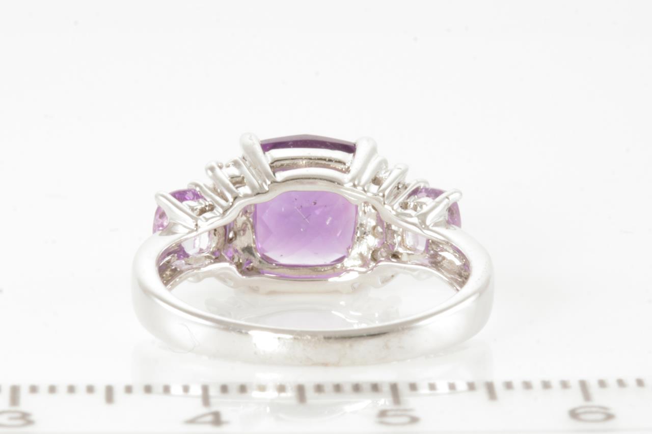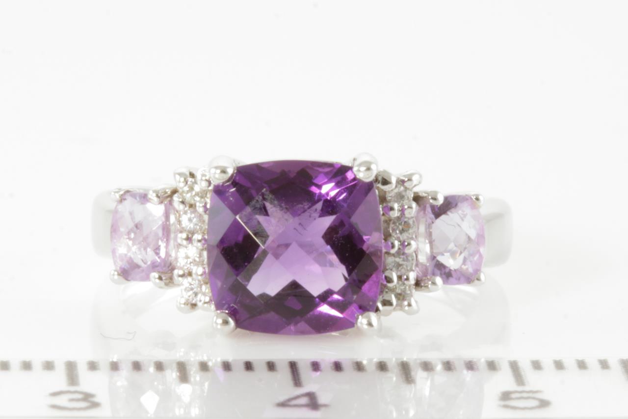 Amethyst and Diamond ring with 3 cushion checkerboard cut Amethysts totalling 1.00cts and Diamonds totalling 0.04cts. 10ct white gold. Ring size M1/2. Weight: 3.8g (As New)
