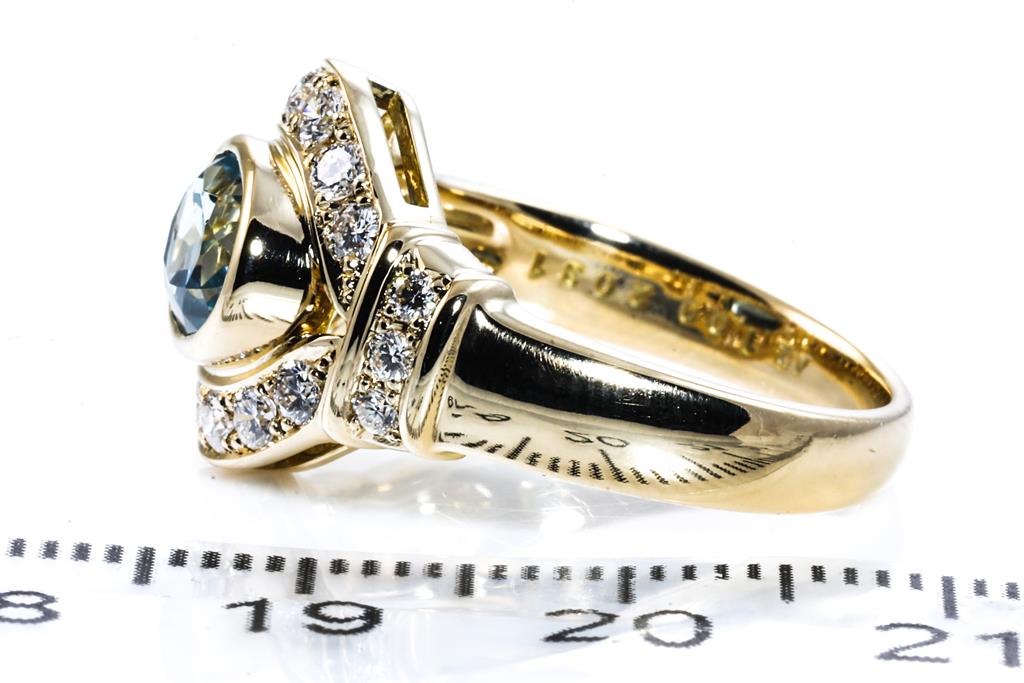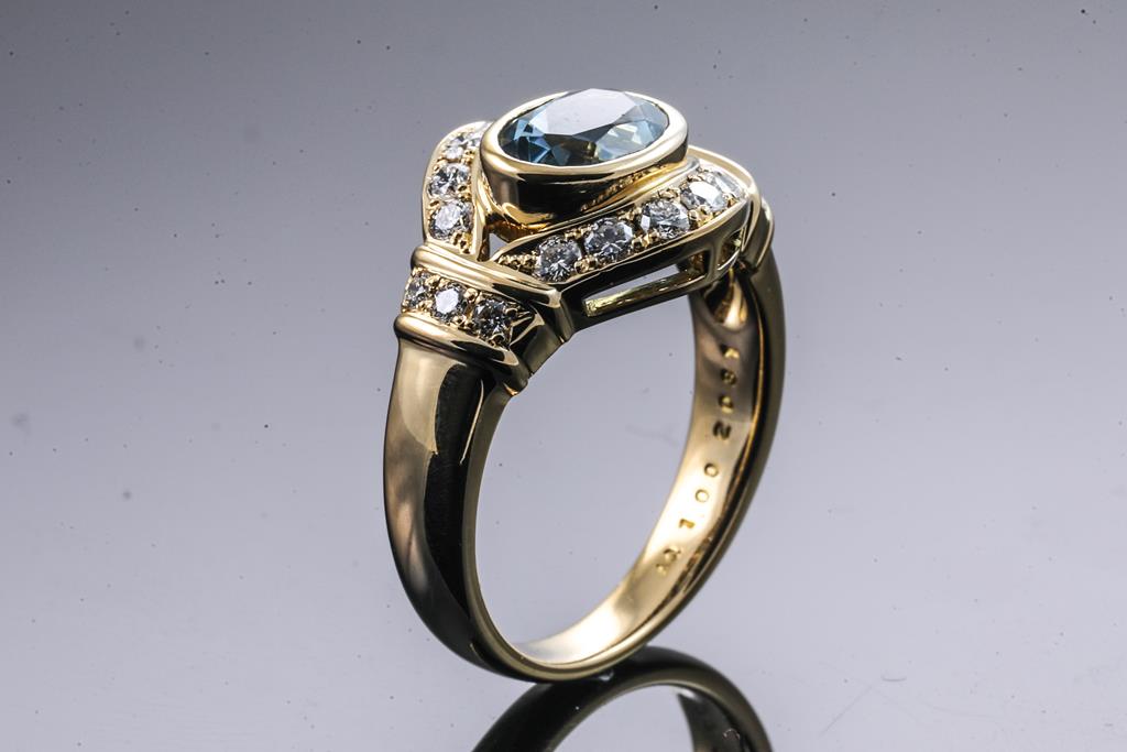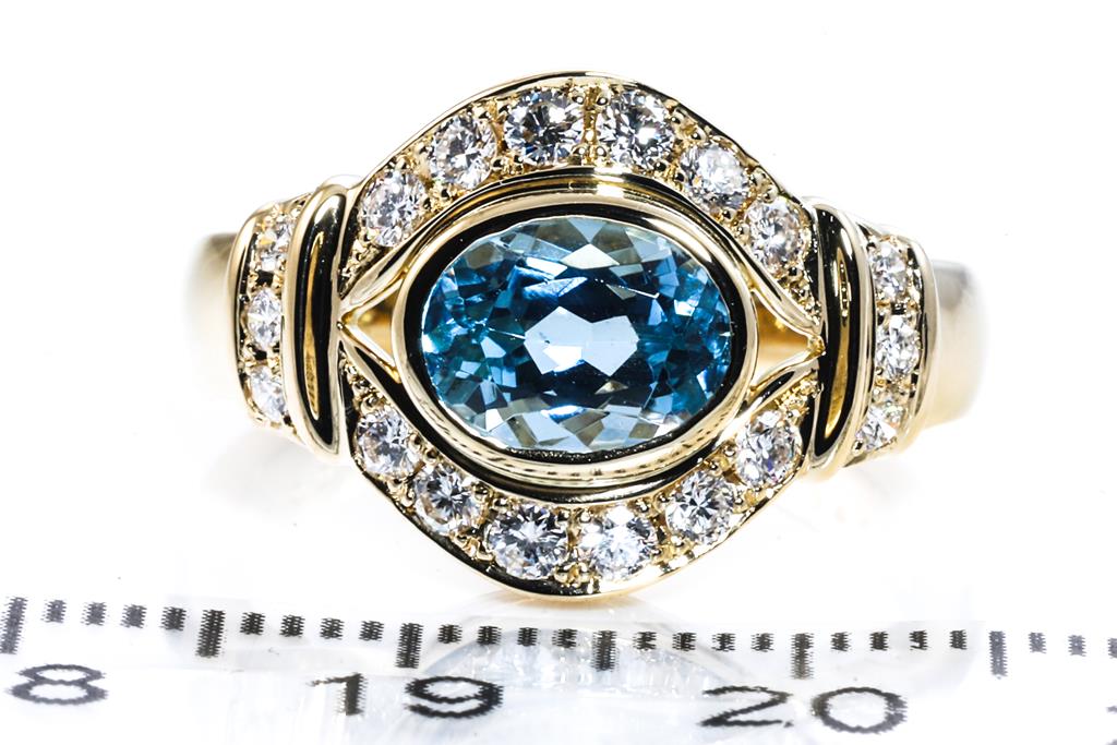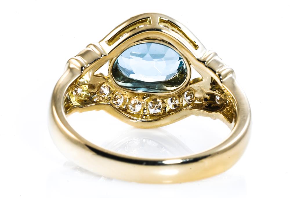 Aquamarine and Diamond ring with an oval shape Aquamarine of 1.00ct and round Diamonds totalling 0.46cts (Estimated grading: G-H VS). 18ct yellow gold. Ring size N. Weight: 7.2g. (Pre-owned)