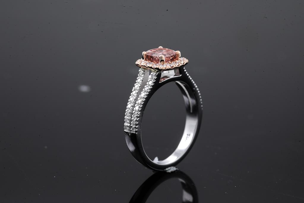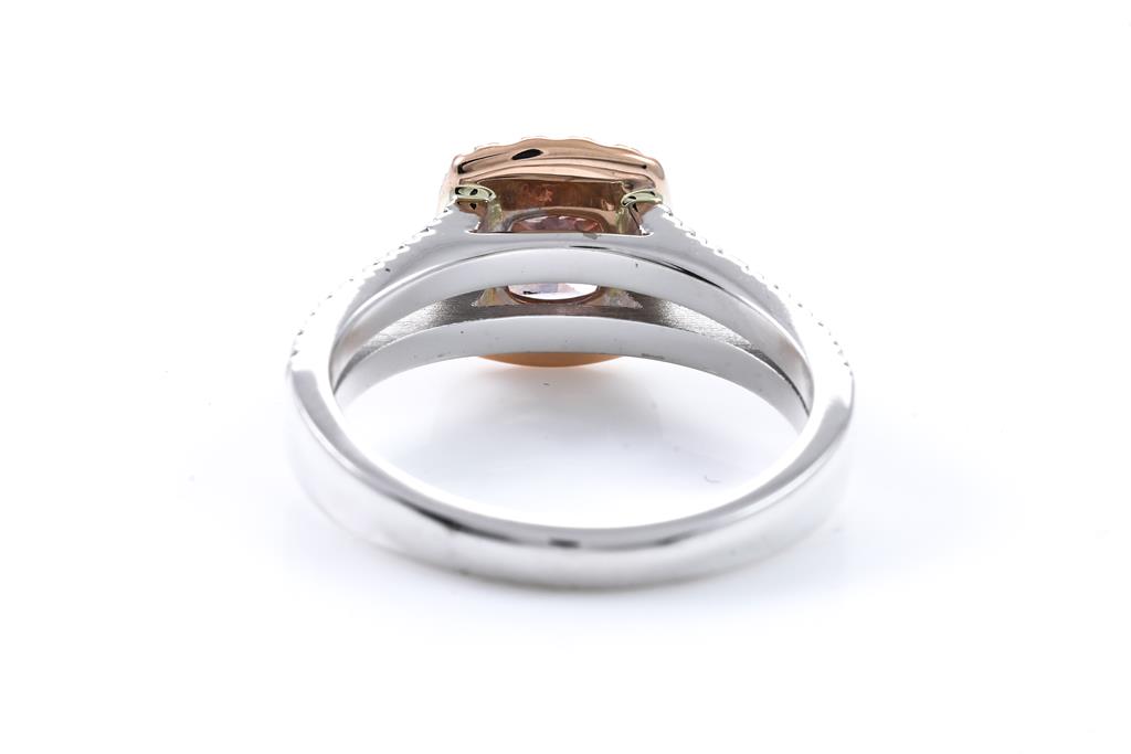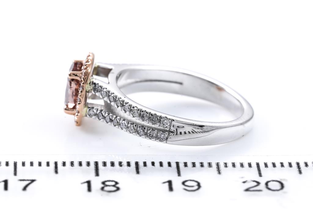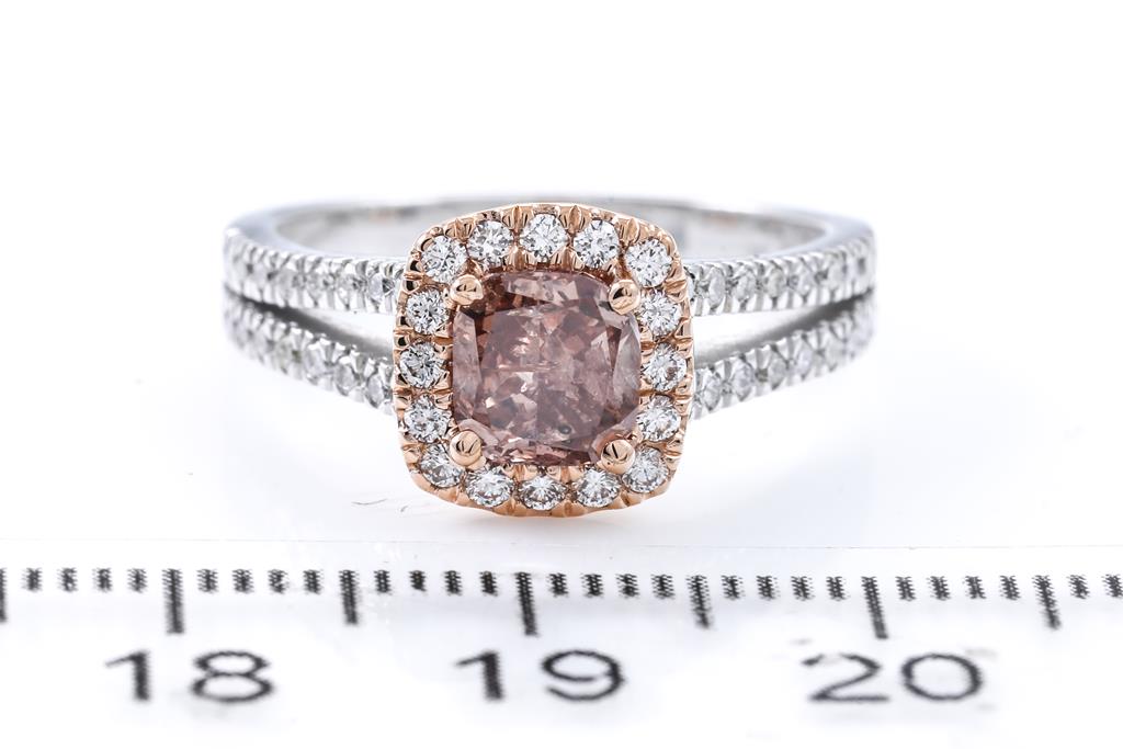 Diamond ring with centre Diamond of 1.00ct (with GIA report graded as Natural Fancy Deep Brown-Pink Even #2195444833, FSA estimated clarity grade: P2) and surrounding round Diamonds totalling 0.43cts (Estimated grading: G-H SI). 18ct rose and white gold. Ring size L. Weight 5.2g (New)