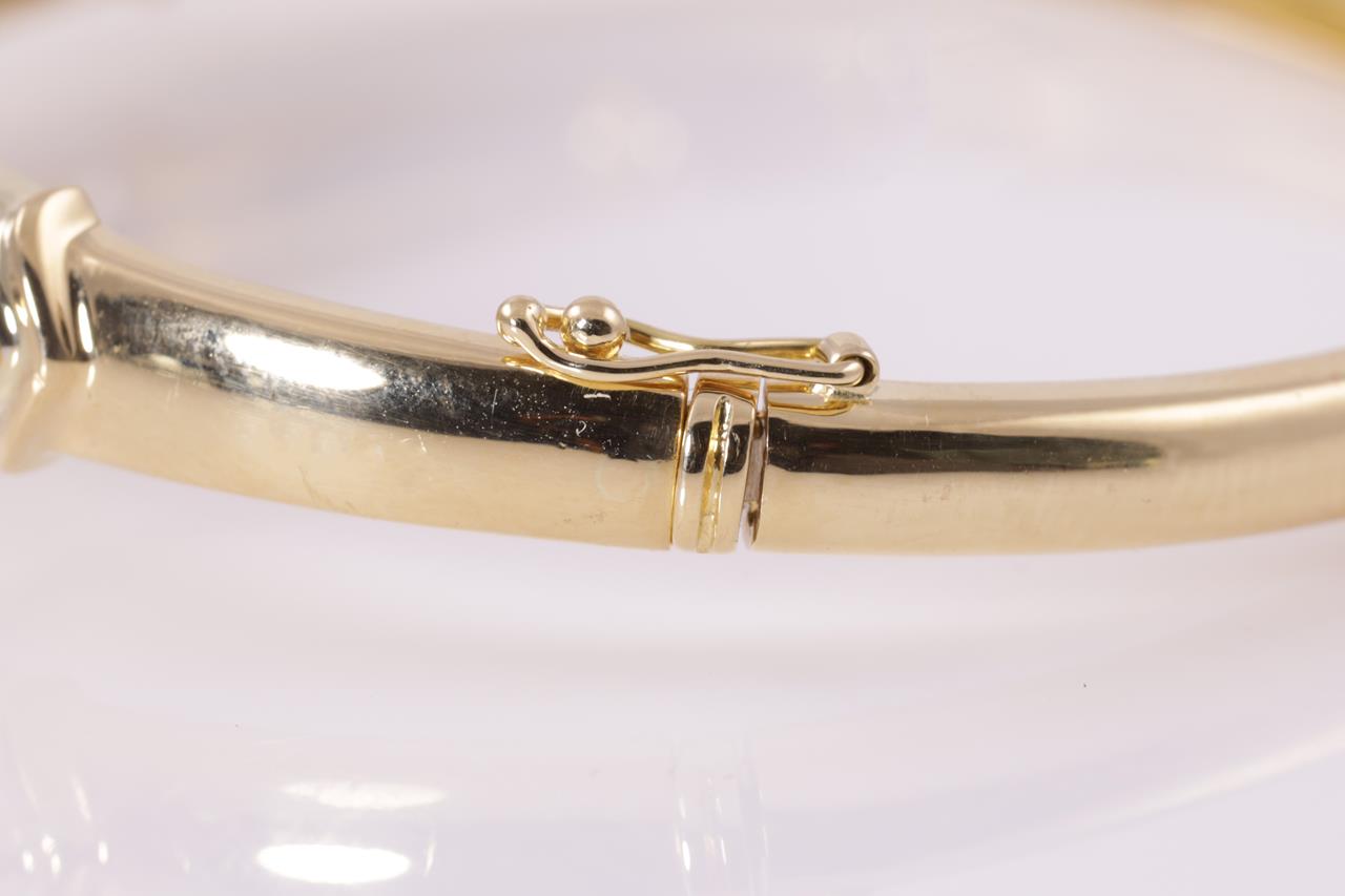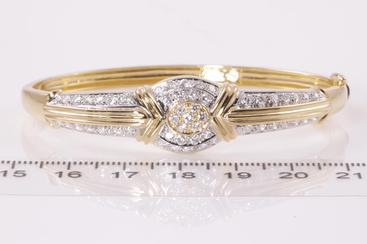 Diamond Bangle with round Diamonds totalling approximately 1.00cts (Estimated grading: H SI). 18ct yellow gold and white gold. Circumference: 16.5cm. Weight: 20.9g. With certificate #414893. (Pre-owned)