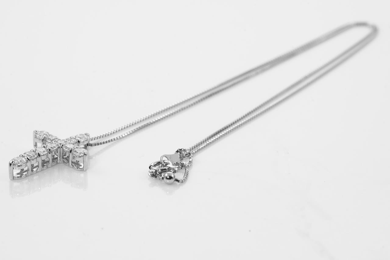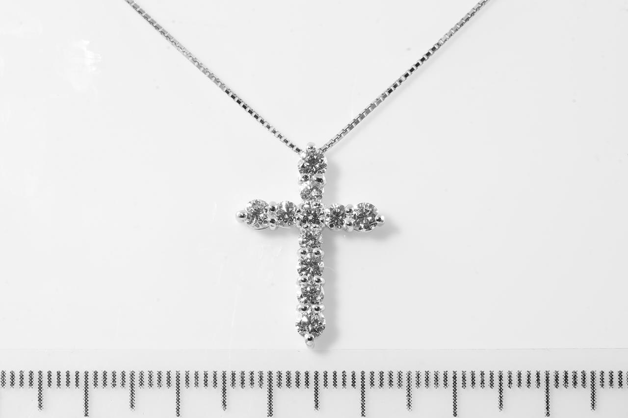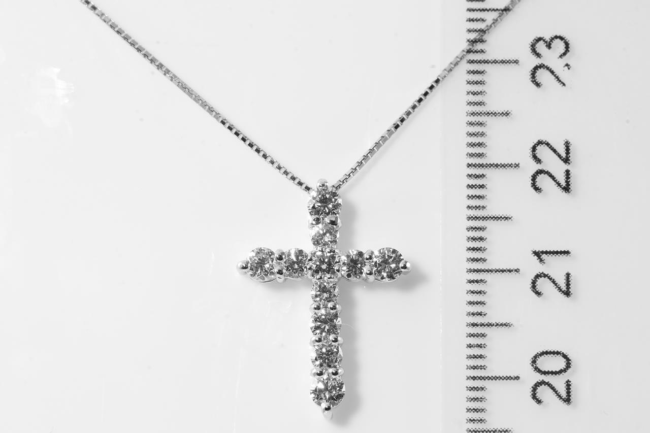 Diamond cross pendant with round Diamonds totalling 1.00cts (Estimated grading: G-H SI). Platinum with 44cm 18ct white gold adjustable chain. Weight: 4.6g. (Pre-owned)