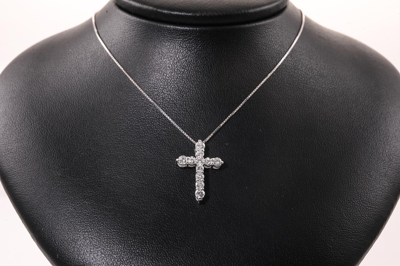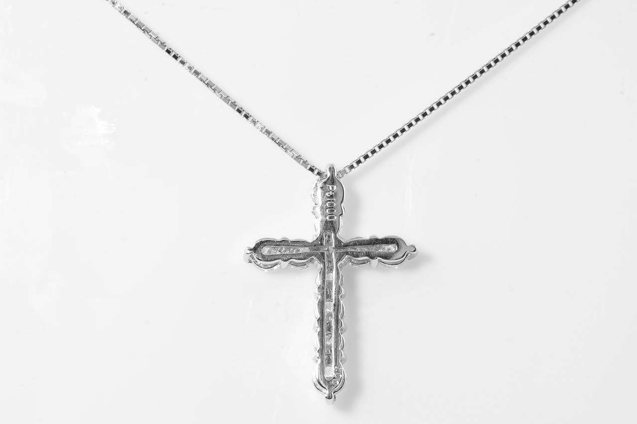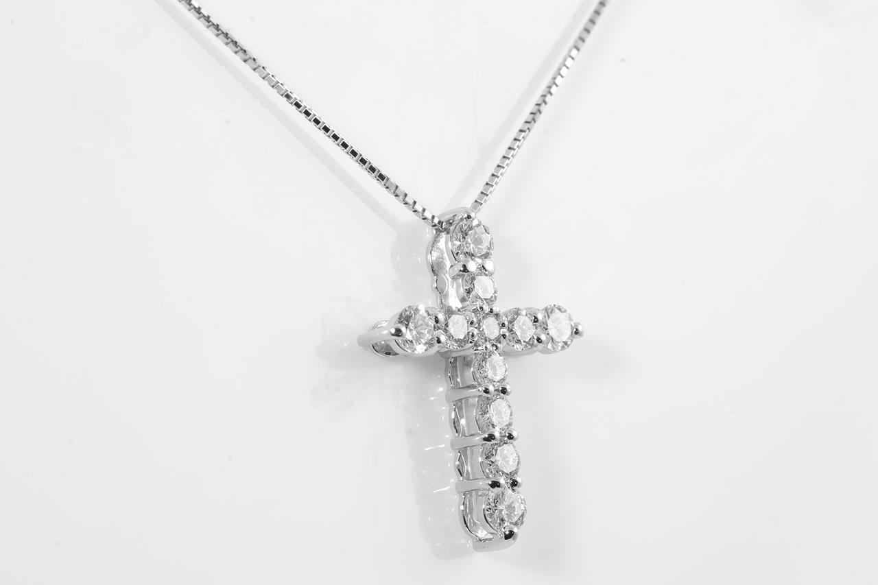 Diamond cross pendant with round Diamonds totalling 1.00cts (Estimated grading: G-H SI). Platinum with 44cm 18ct white gold adjustable chain. Weight: 4.6g. (Pre-owned)