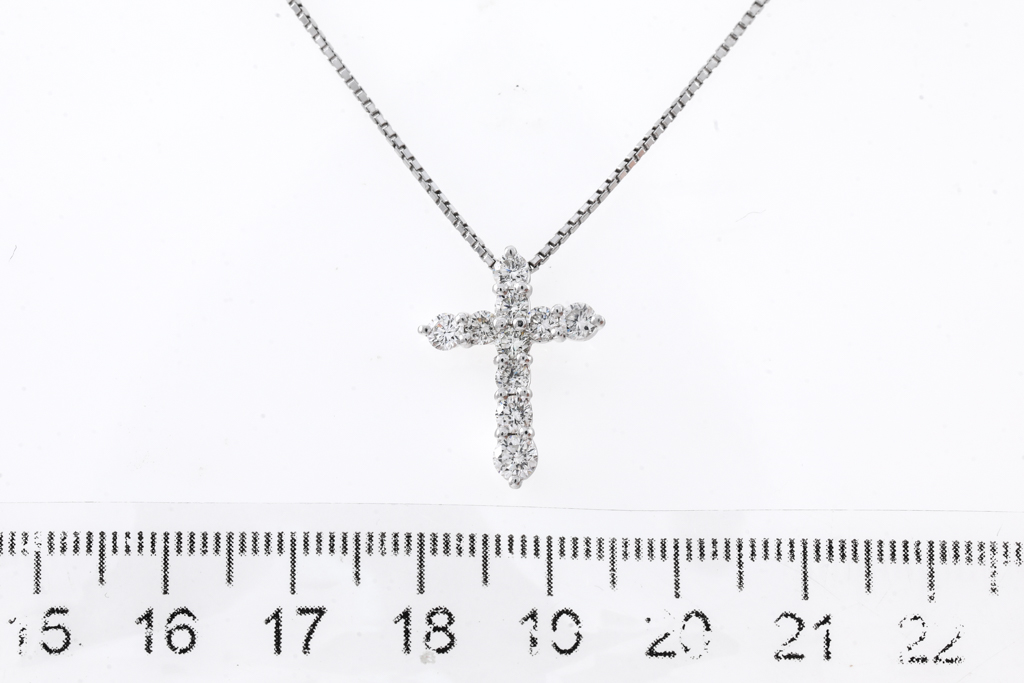 Diamond cross pendant with 10 round Diamonds totalling 1.00cts (Estimated grading: I-J SI). Platinum with 45cm platinum chain. Weight: 6.2g. (Pre-owned)