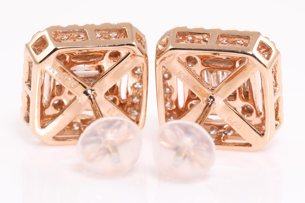 Diamond dress earrings with round & baguette cut Diamonds totalling 1.00cts (Estimated grading: H P1-2). 18ct rose gold with gold & silicon backs. Weight: 3.9g. (Pre-owned)