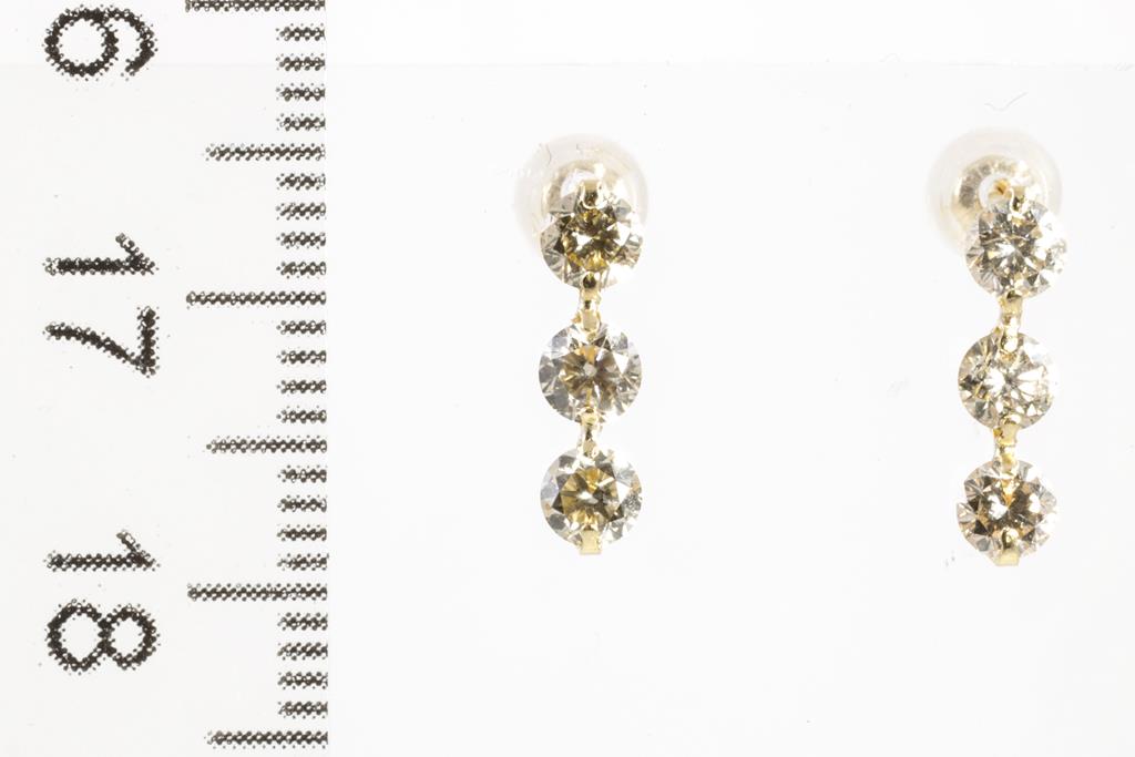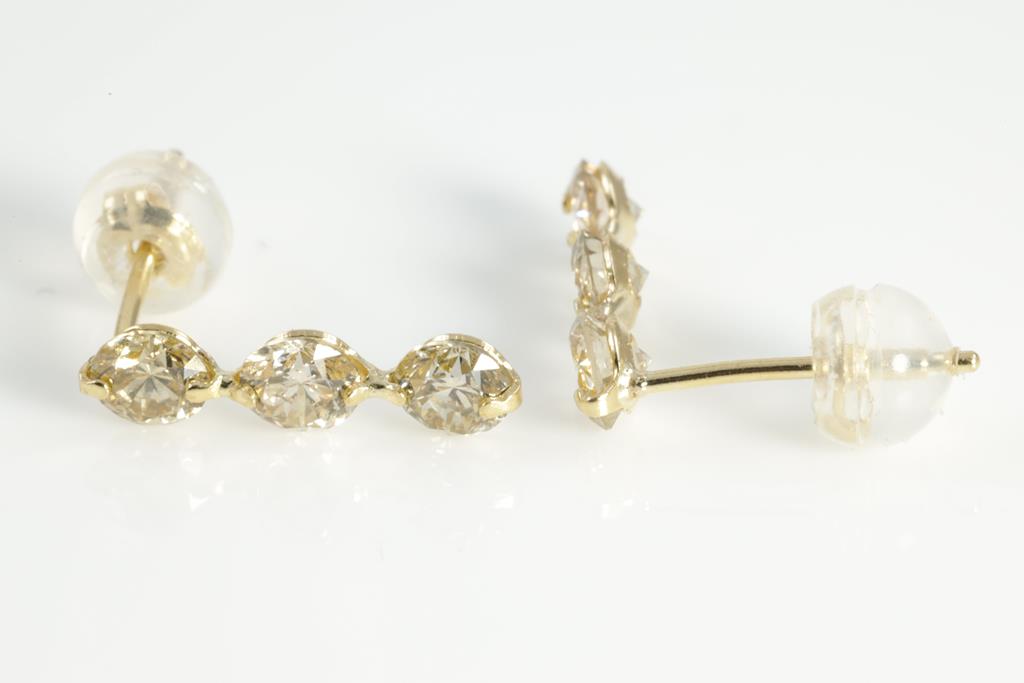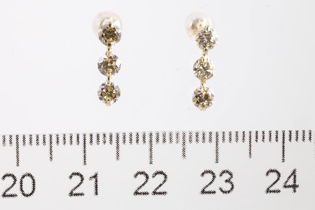 Diamond dress earrings with 6 round Diamonds totalling 1.00cts (Estimated grading: Champagne SI). 18ct yellow gold with gold & silicon backs. Weight: 0.5g. (Pre-owned)