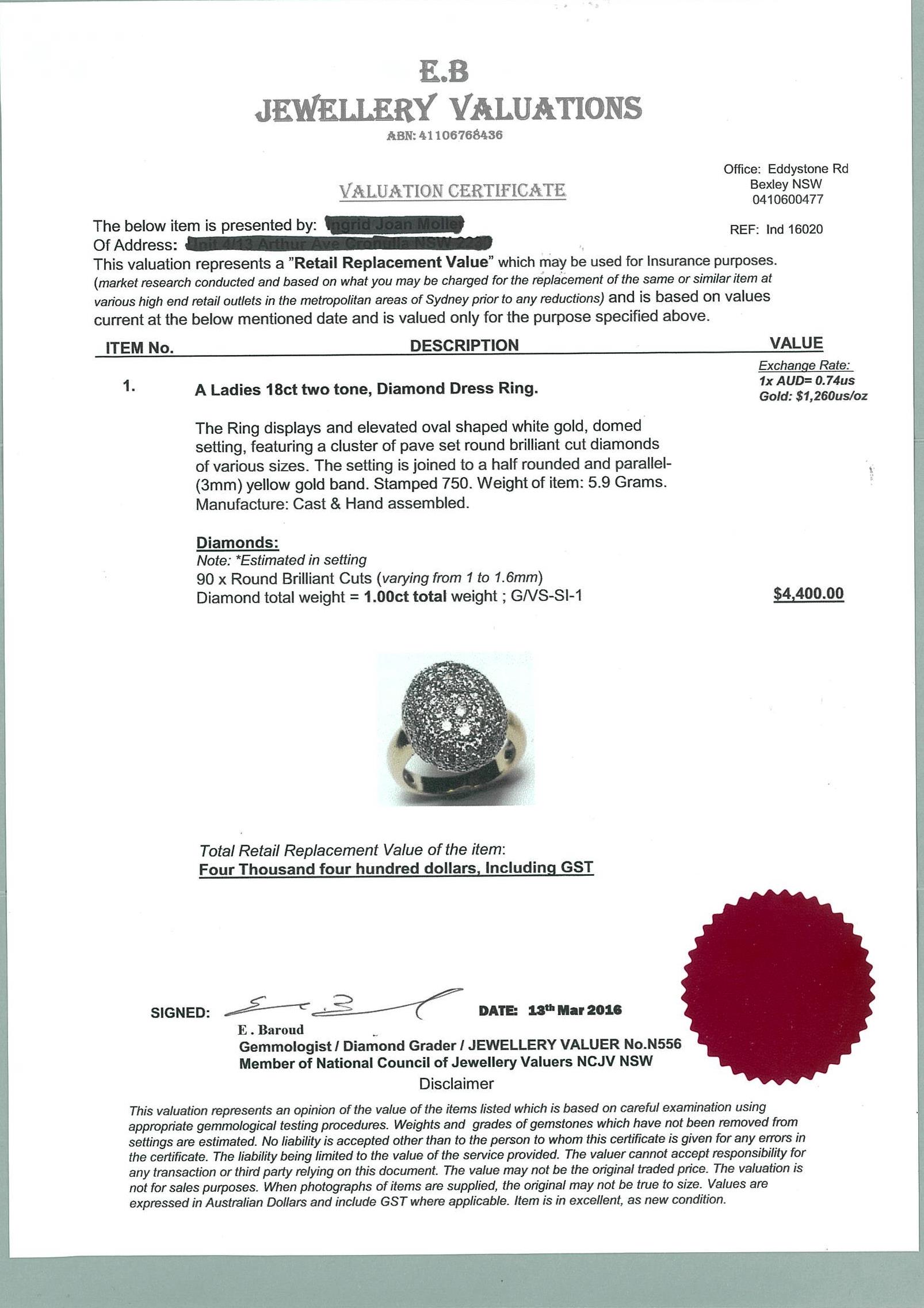 Diamond dress ring with round Diamonds totalling 1.00cts (Estimated grading: G VS-SI1). 18ct yellow and white gold. Ring size I1/2. With valuation certificate #16020. Weight: 5.8g (Pre-owned)