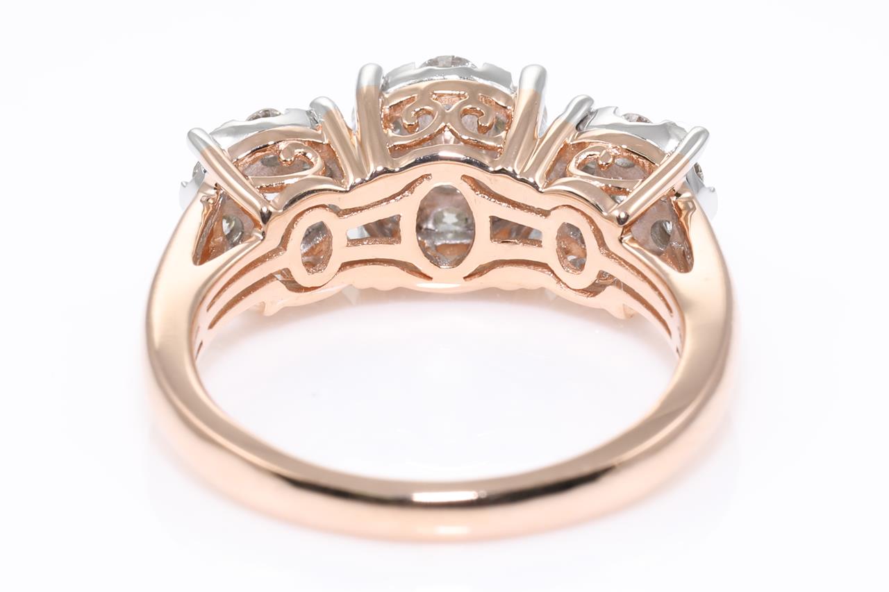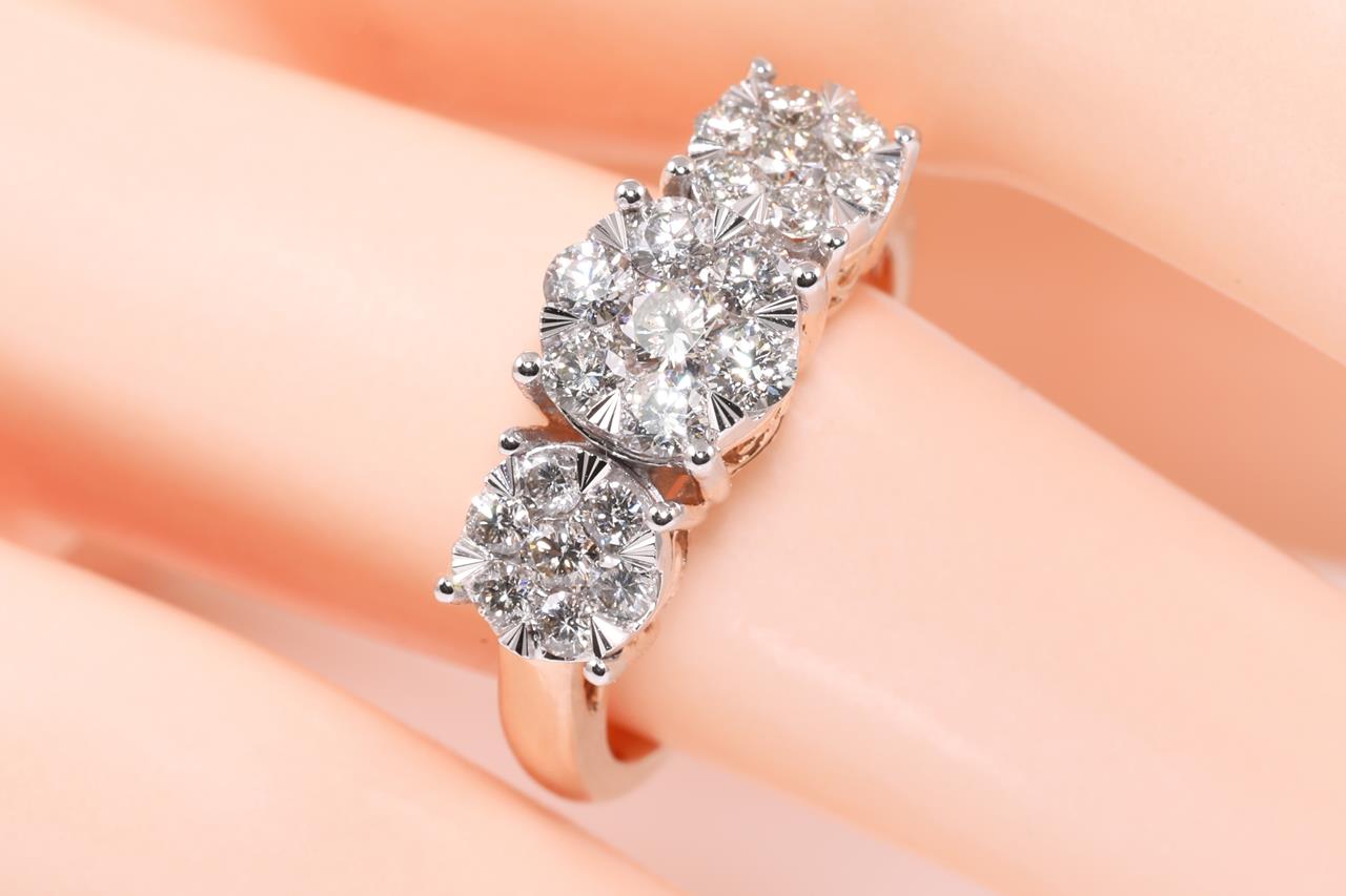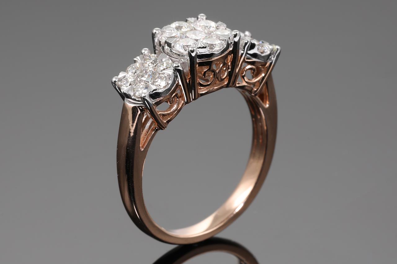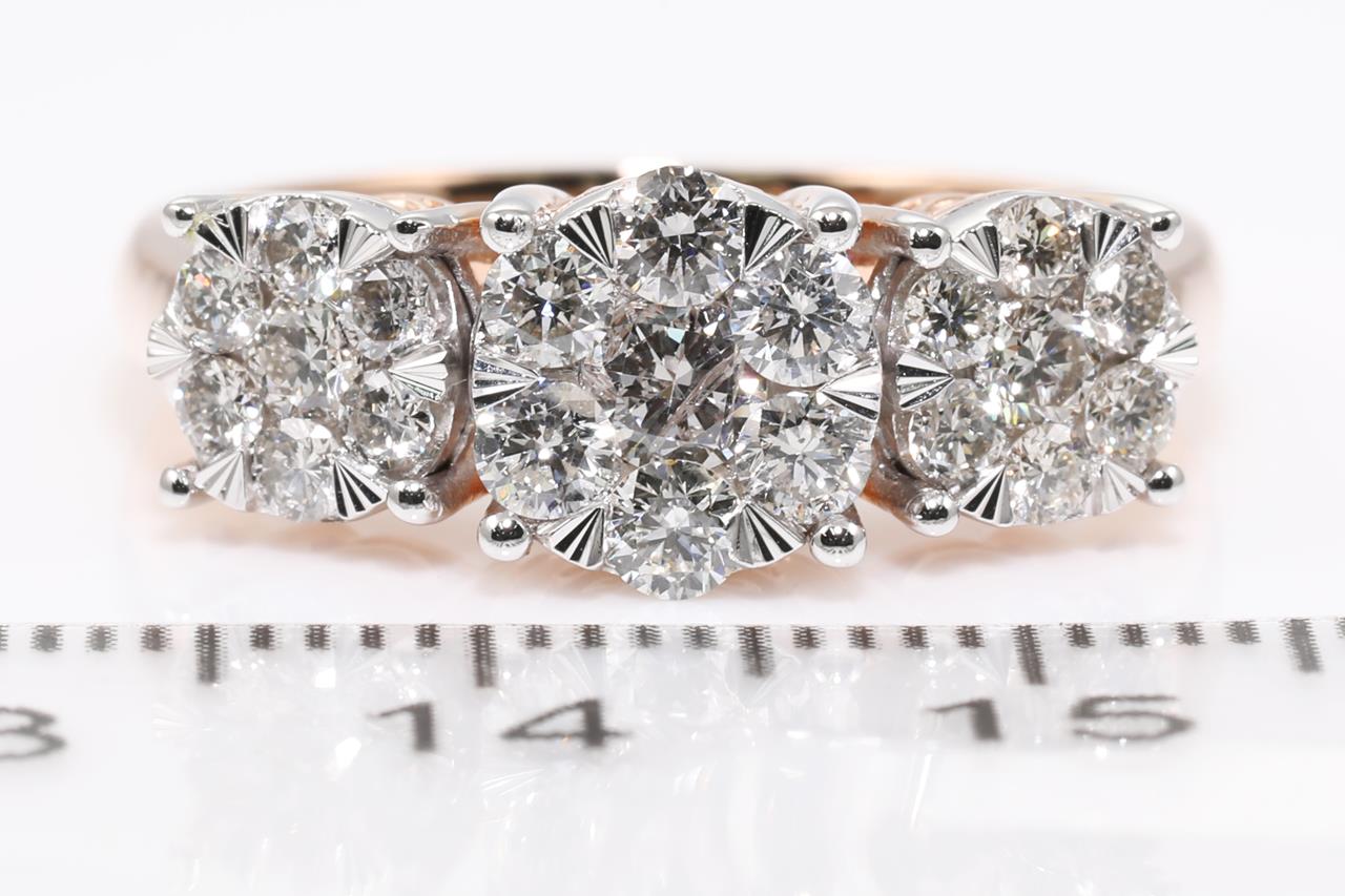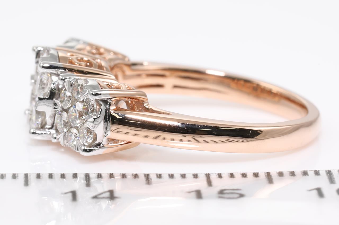 Diamond dress ring with 21 round Diamonds totalling 1.00cts (Estimated grading: H SI). 14ct rose and white gold. Size: M1/2. Weight: 4.8g. (New)