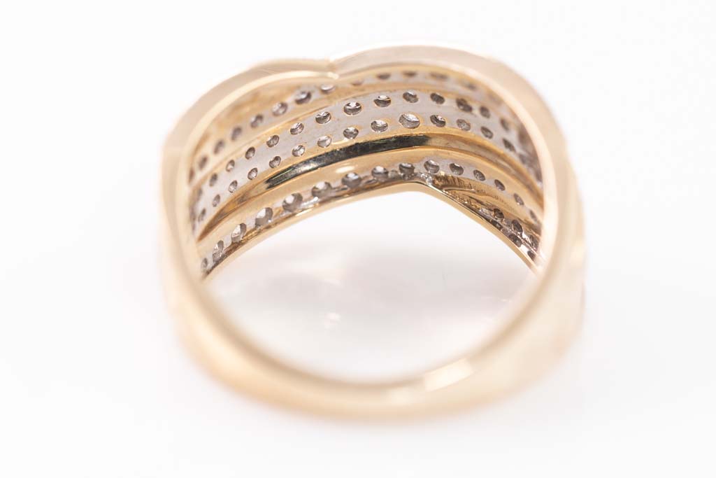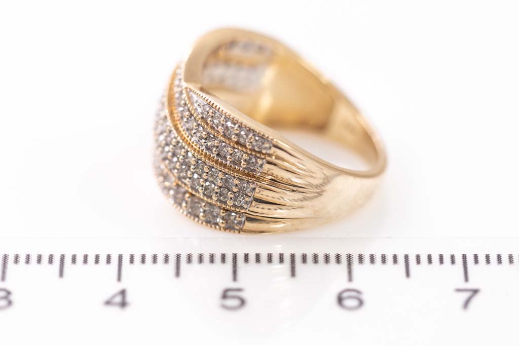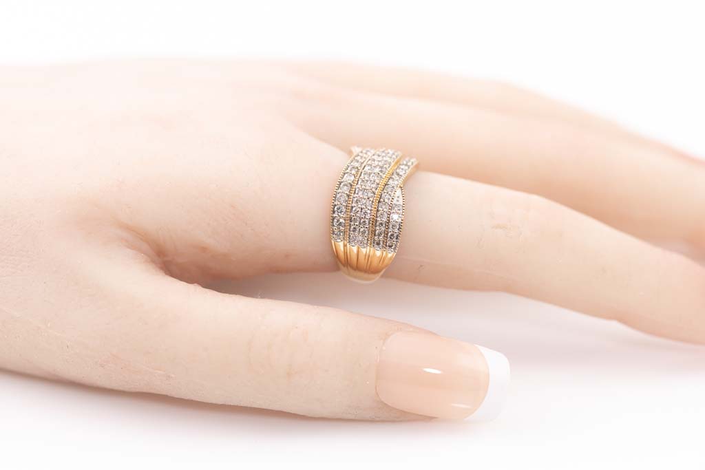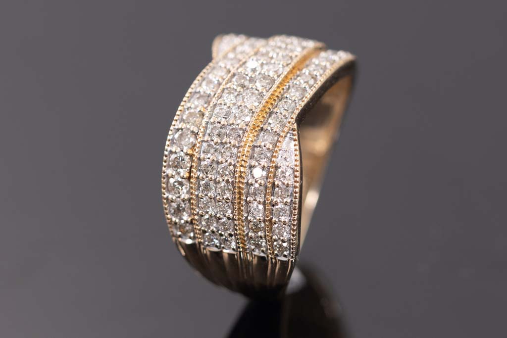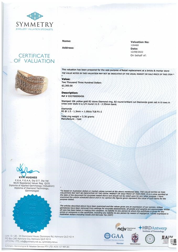 Diamond dress ring with round Diamonds totalling 1.00cts (Estimated grading: TLB P1-P2). 10ct yellow gold. Ring size O - ring resize is not recommended. Weight: 5.4g. With Valuation Certificate Ref #032700090456. (Pre-owned)